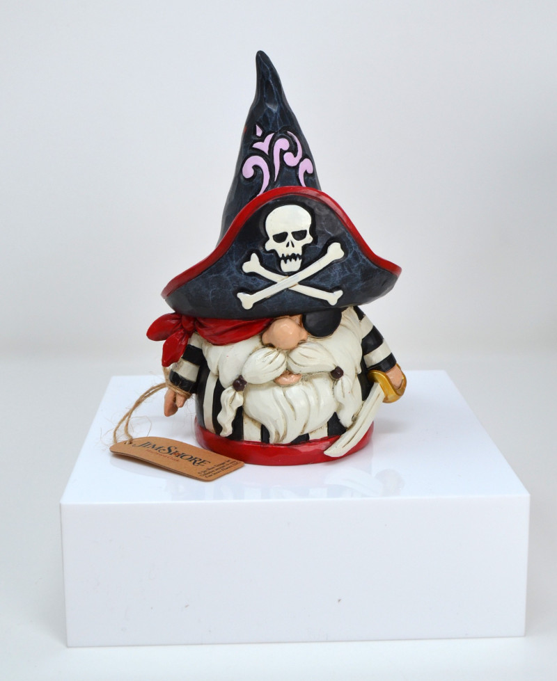 A whimsical gnome dressed as a pirate, complete with a tall hat adorned with a skull and crossbones, striped outfit, sword, and red accents.
