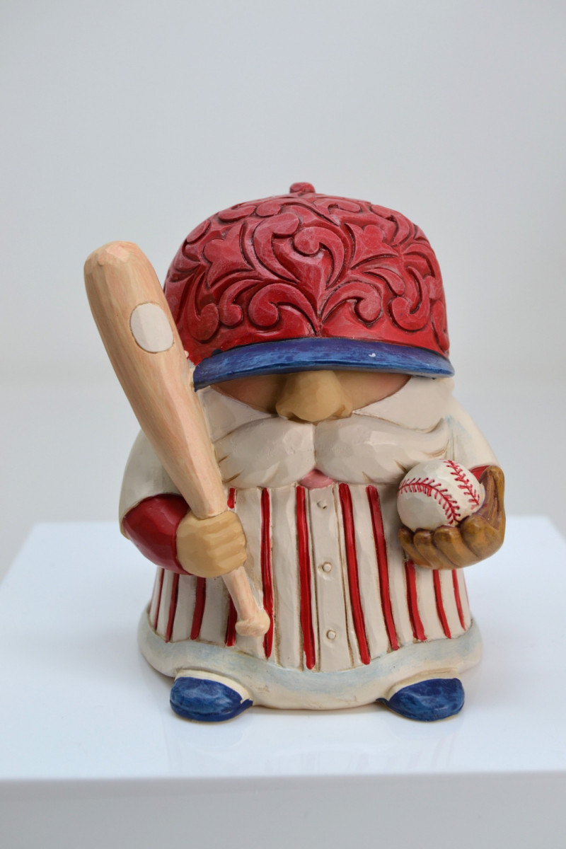 A charming gnome dressed in a red-and-white striped uniform, holding a bat and baseball. Features a textured red cap and blue shoes.