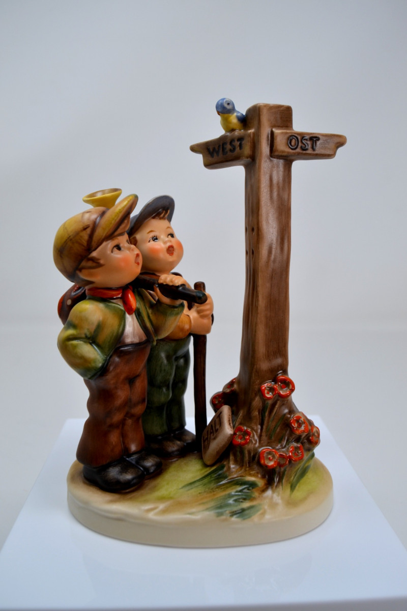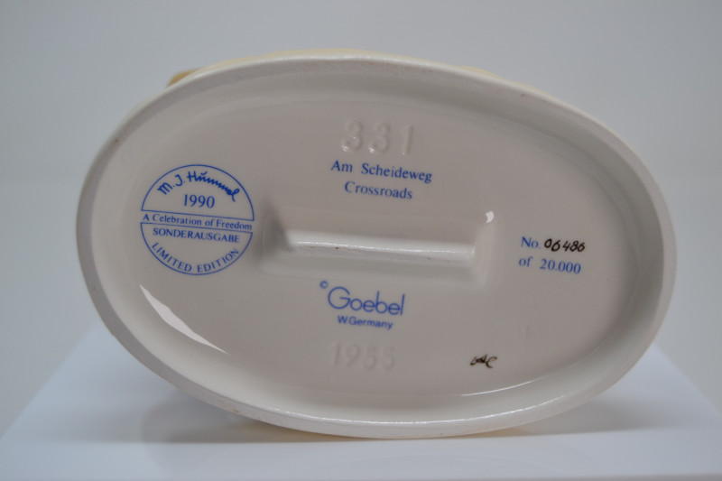 This M.I. Hummel figurine titled "Crossroads" (Hum 331) is a limited edition commemorative piece produced by Goebel in West Germany in 1990, celebrating "A Celebration of Freedom." It features two boys standing at a signpost marked “West” and “Ost,” symbolizing the division and reunification of Germany. Height: 6 3/4 inches (17 cm) Edition: Limited to 20,000 pieces worldwide Numbered: No. 06486 Markings: Full Goebel backstamp on the base with incised model number and date Includes: Original box and Certificate of Authenticity
