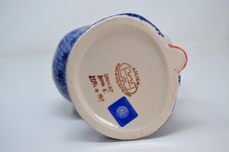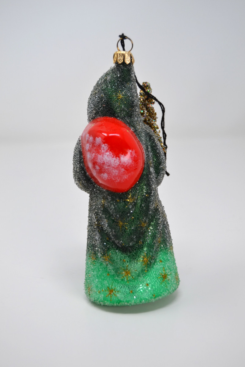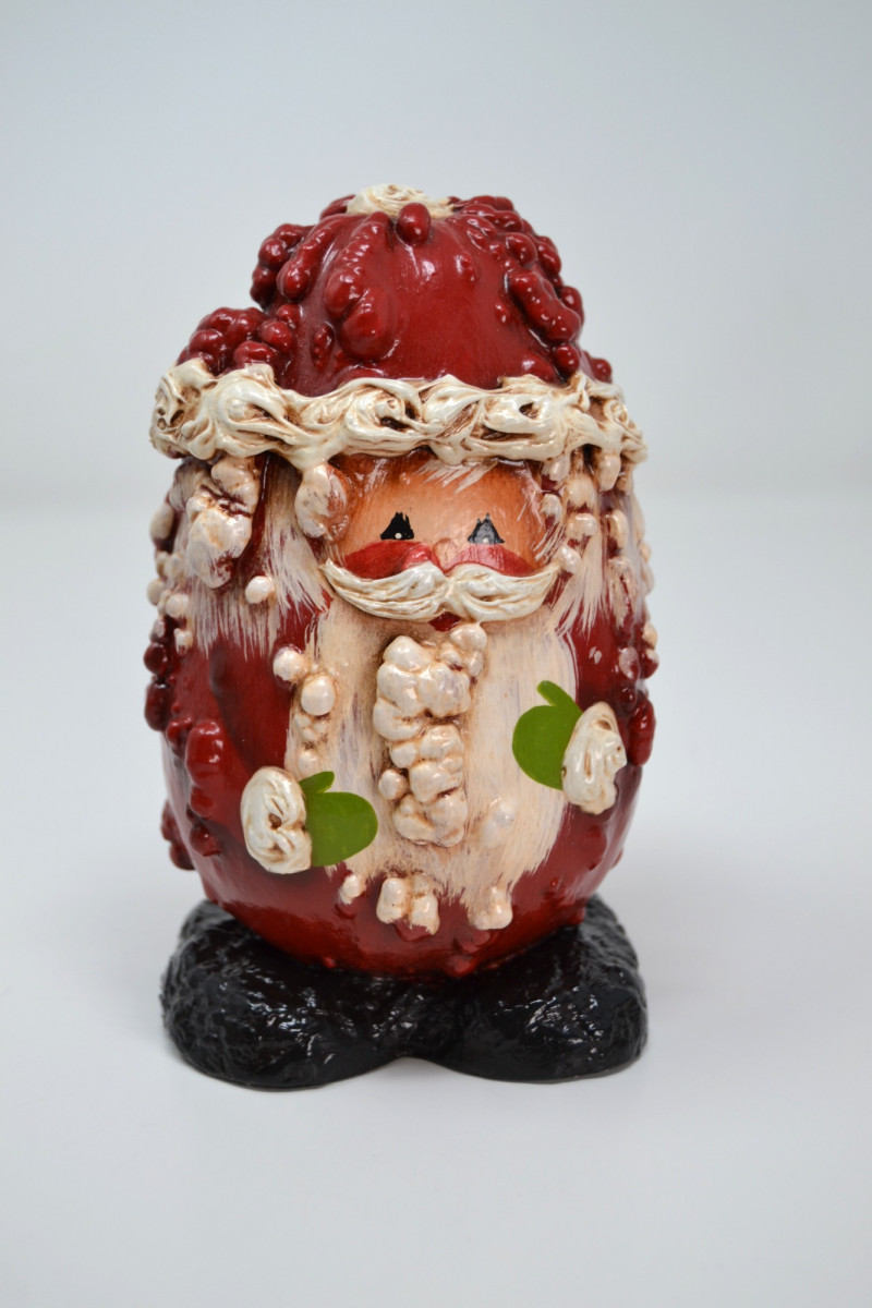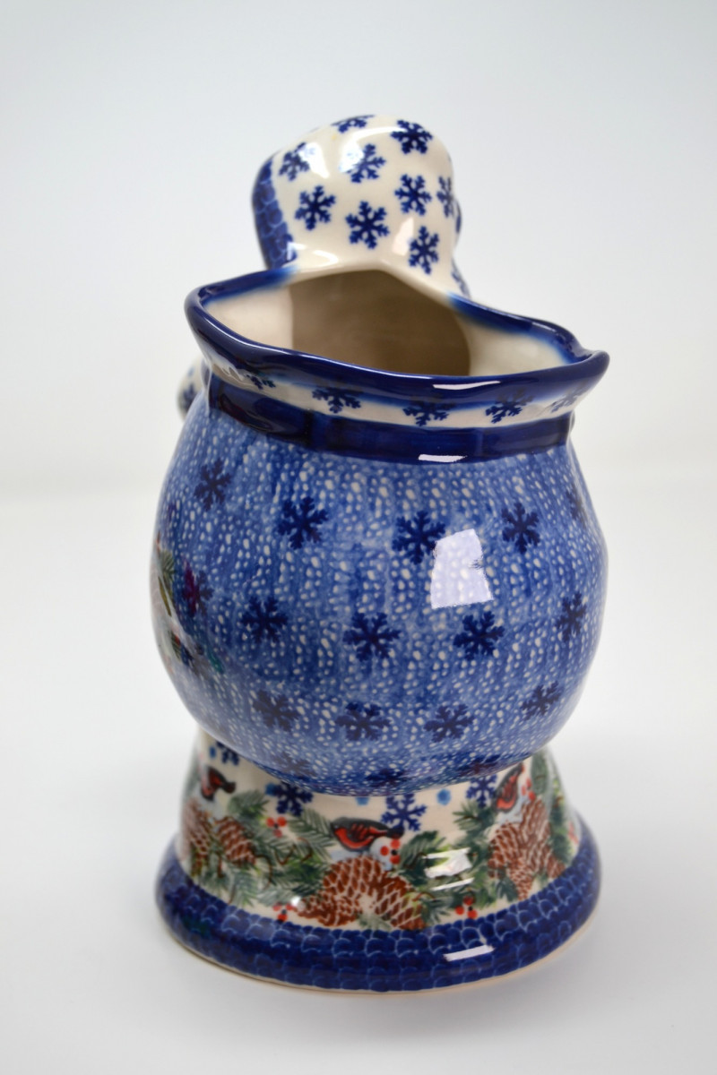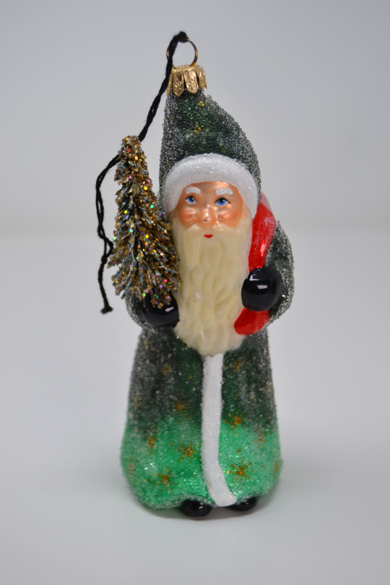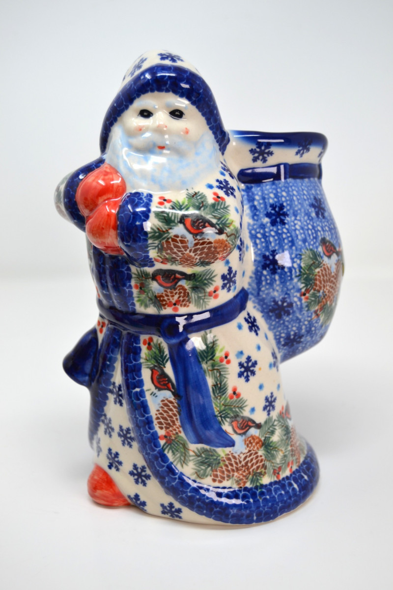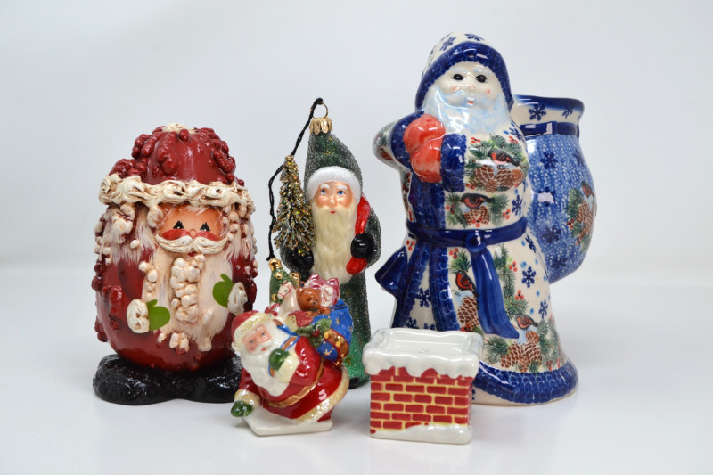 This festive Santa Collection includes a charming mix of handcrafted and collectible pieces: "Santa in Chimney" Salt & Pepper Shaker Set – A playful ceramic duo featuring Santa with a toy sack and a snow-topped brick chimney. Ino Schaller 2010 Green Santa – Made in Germany, this glittered Belsnickel-style Santa ornament is finished with a red sack and bottle brush tree. E. Barrett Gourd Santa – A folk-art style figure with sculpted textures and painted accents, crafted from a gourd form. Kalich Polish Santa in Blue Robe – Hand-painted ceramic Santa by Kalich (Unikat pattern by Anna K.), decorated with pinecones, birds, and snowflakes. Marked and signed on base, made in Poland. Size range: Approx. 1 3/4" to 9" tall