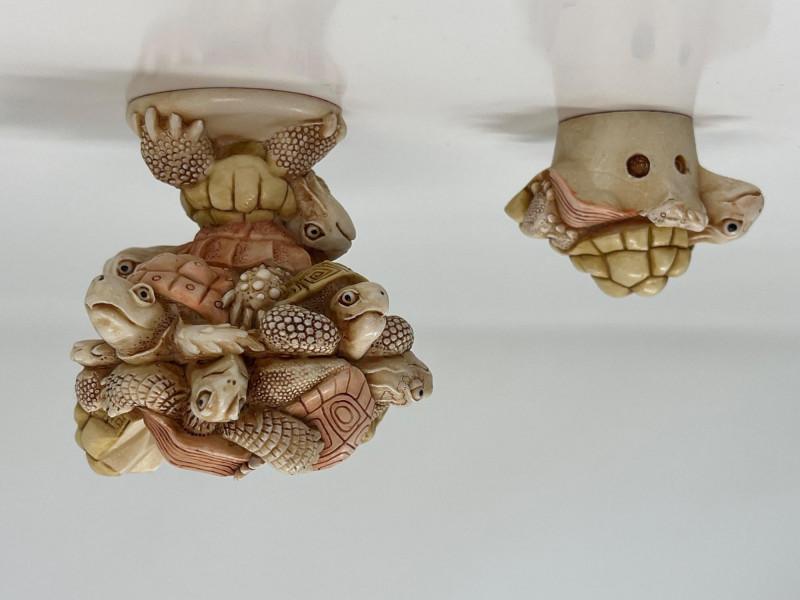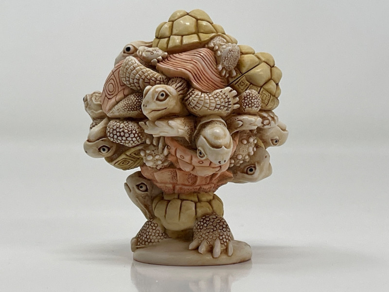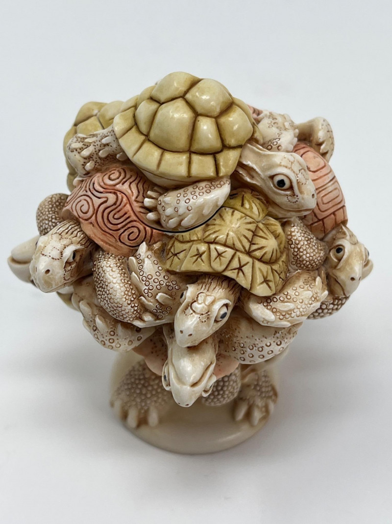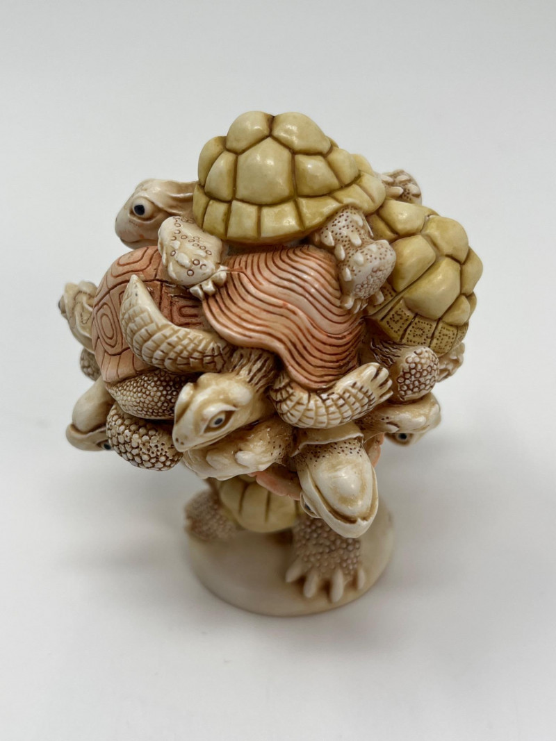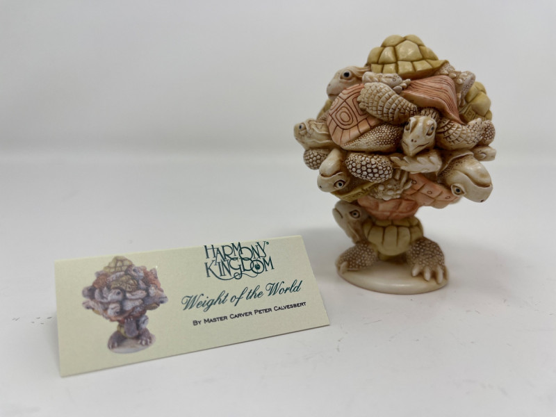 An intricately sculpted collectible by Harmony Kingdom, titled “Weight of the World”, designed by Master Carver Peter Calvesbert. This whimsical piece features a detailed stack of turtles, each uniquely carved with lifelike textures and expressions. Despite its compact size, the craftsmanship is exceptional and full of character. Details: Artist: Peter Calvesbert Brand: Harmony Kingdom Title: Weight of the World Year: 2007 Origin: Made in England Size: Approx. 3" tall × 2 1/2" wide Material: Cold cast resin Markings: Artist’s signature on base; original label intact Includes: Original ID card