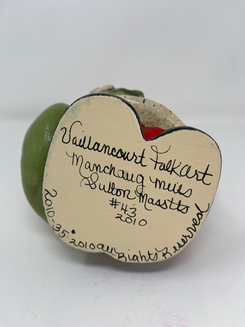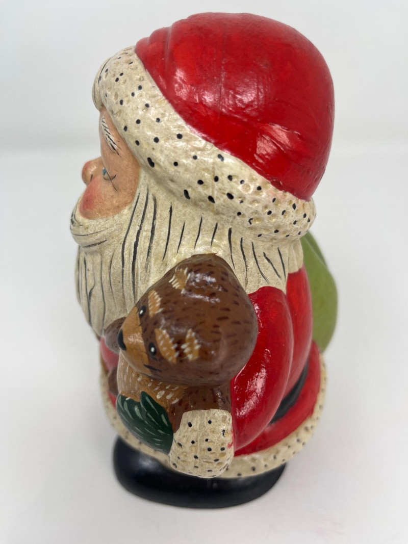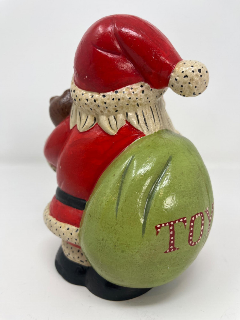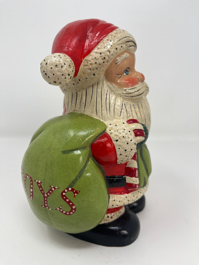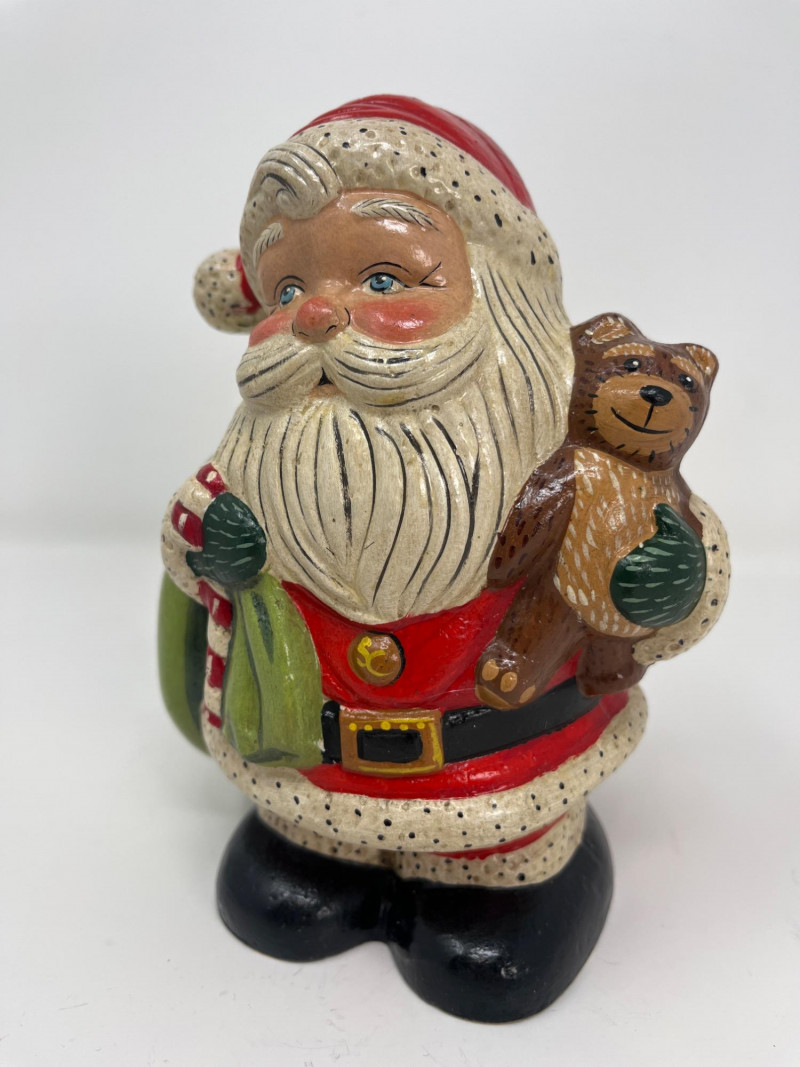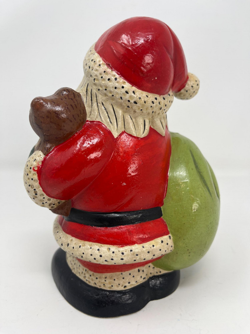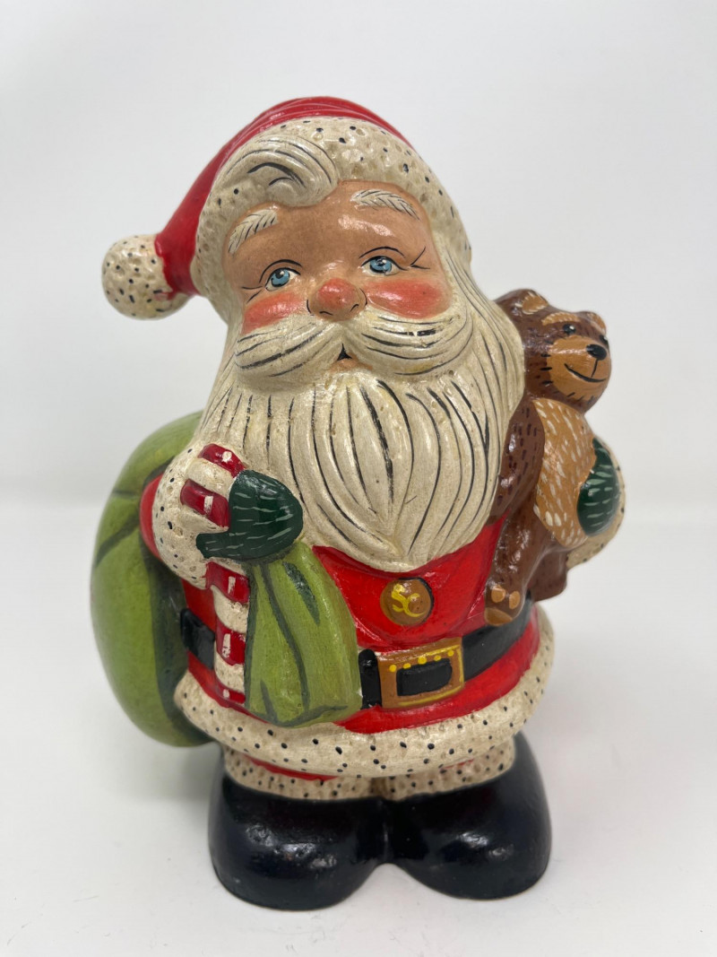 Handcrafted and hand-painted chalkware Santa Claus by Vaillancourt Folk Art, dated 2010 and numbered #43. This festive figure features Santa in a traditional red suit holding a teddy bear and green sack, with finely detailed facial features and textured white beard. A classic representation of American holiday folk art. Details: Maker: Vaillancourt Folk Art Material: Chalkware Year: 2010 Edition: #43 Location: Manchaug Mills, Sutton, Massachusetts Hand-signed on base