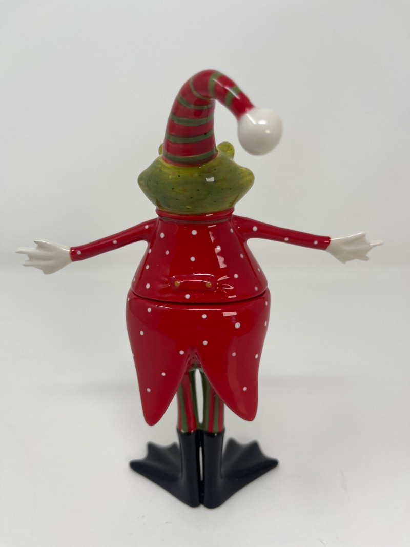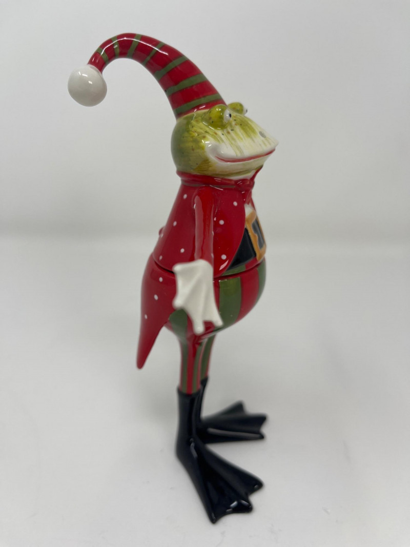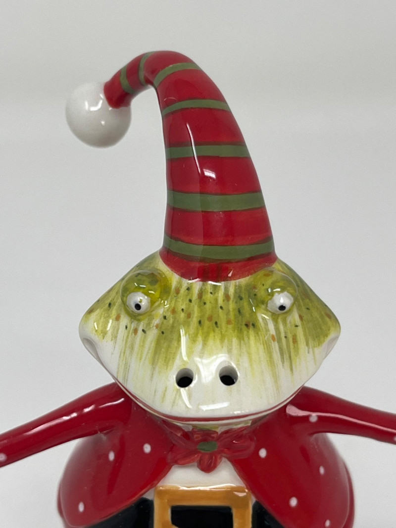 Charming and whimsical, this Department 56 Christmas Krinkles salt and pepper shaker set features a festive frog dressed in Santa-themed attire. Designed by Patience Brewster, the figure separates into two pieces — one for salt, the other for pepper — combining function with holiday flair. The set comes with its original box and features the Department 56 mark on the feet. Includes: 2-piece frog salt and pepper shaker Original box