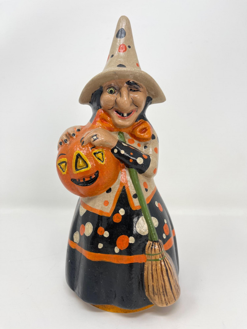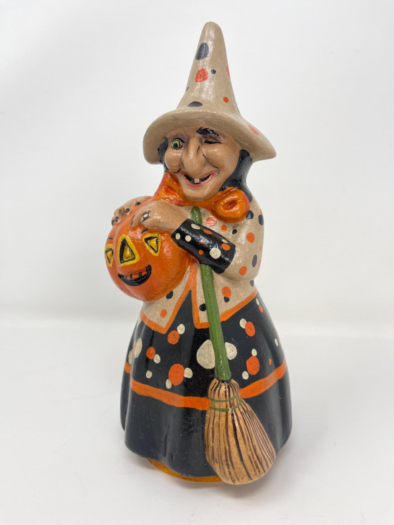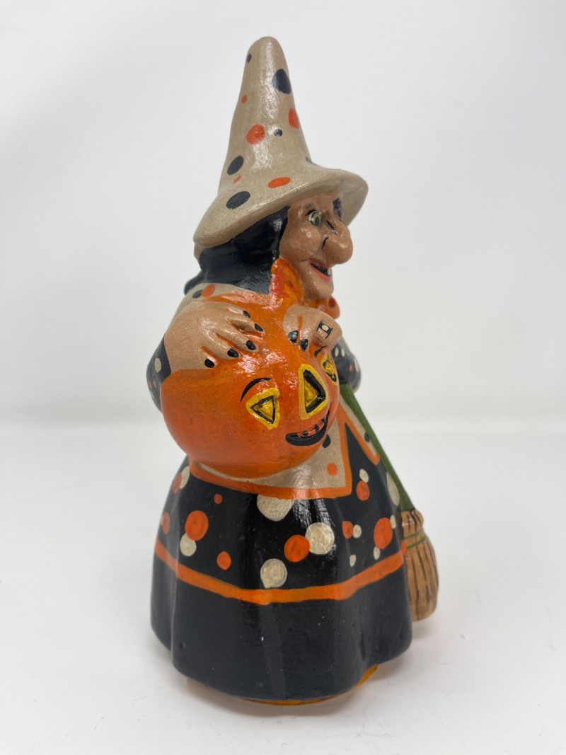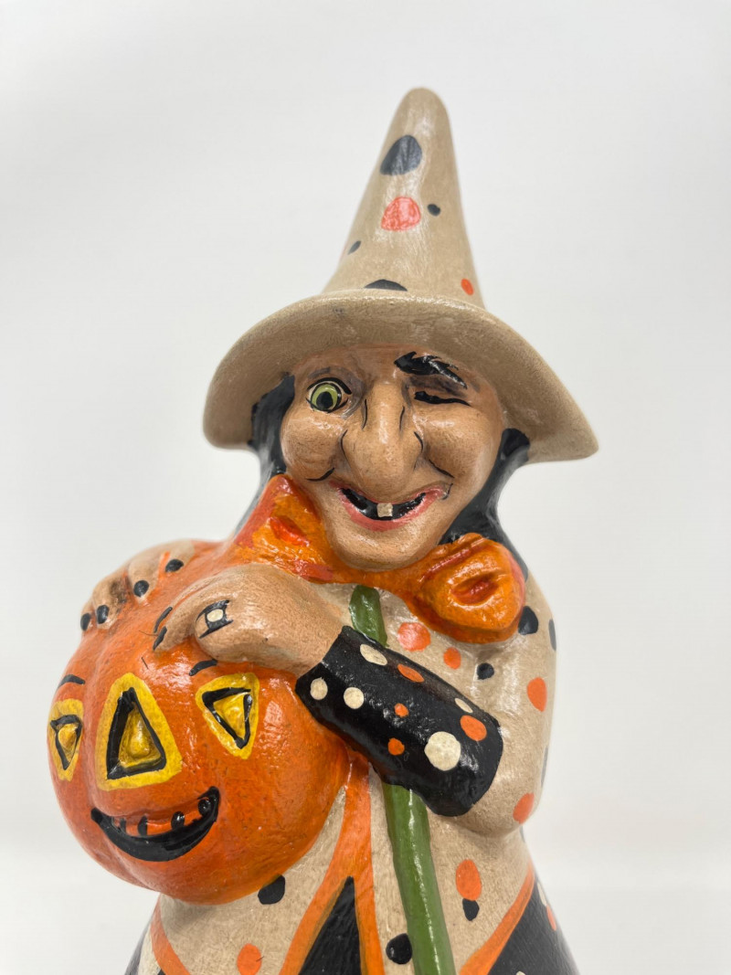 Handcrafted and hand-painted witch figurine by Vaillancourt Folk Art. This charming piece features a smiling witch holding a grinning jack-o'-lantern and a straw broom. She is dressed in a polka-dotted cloak and pointed hat, finished in festive Halloween colors of orange, black, and beige. Markings (on base): Dimensions: