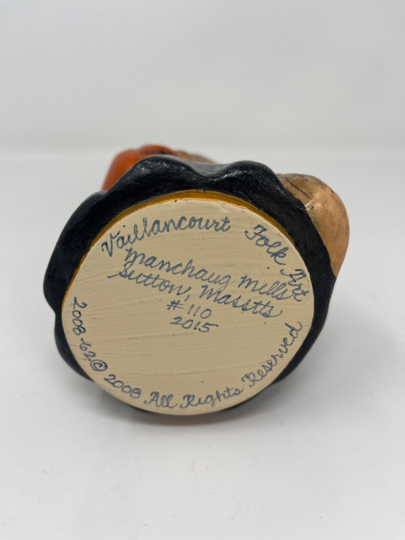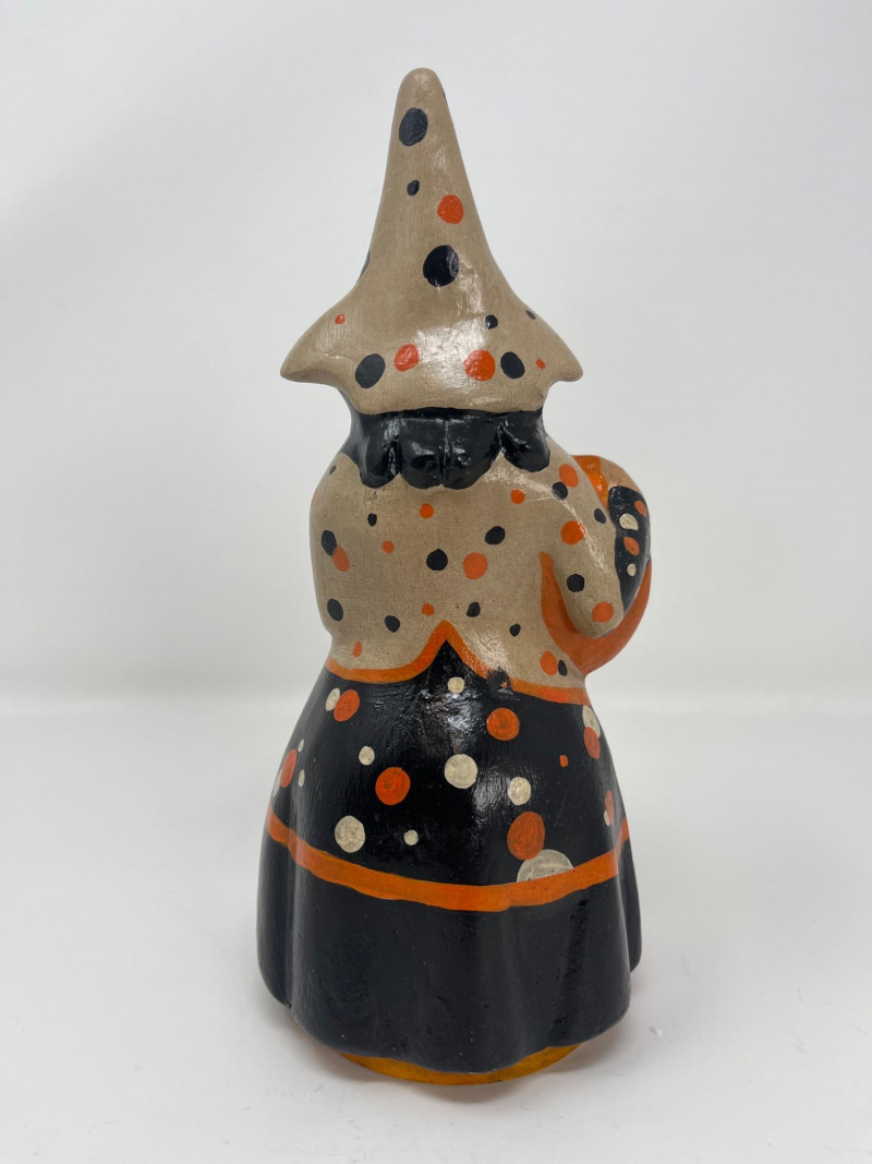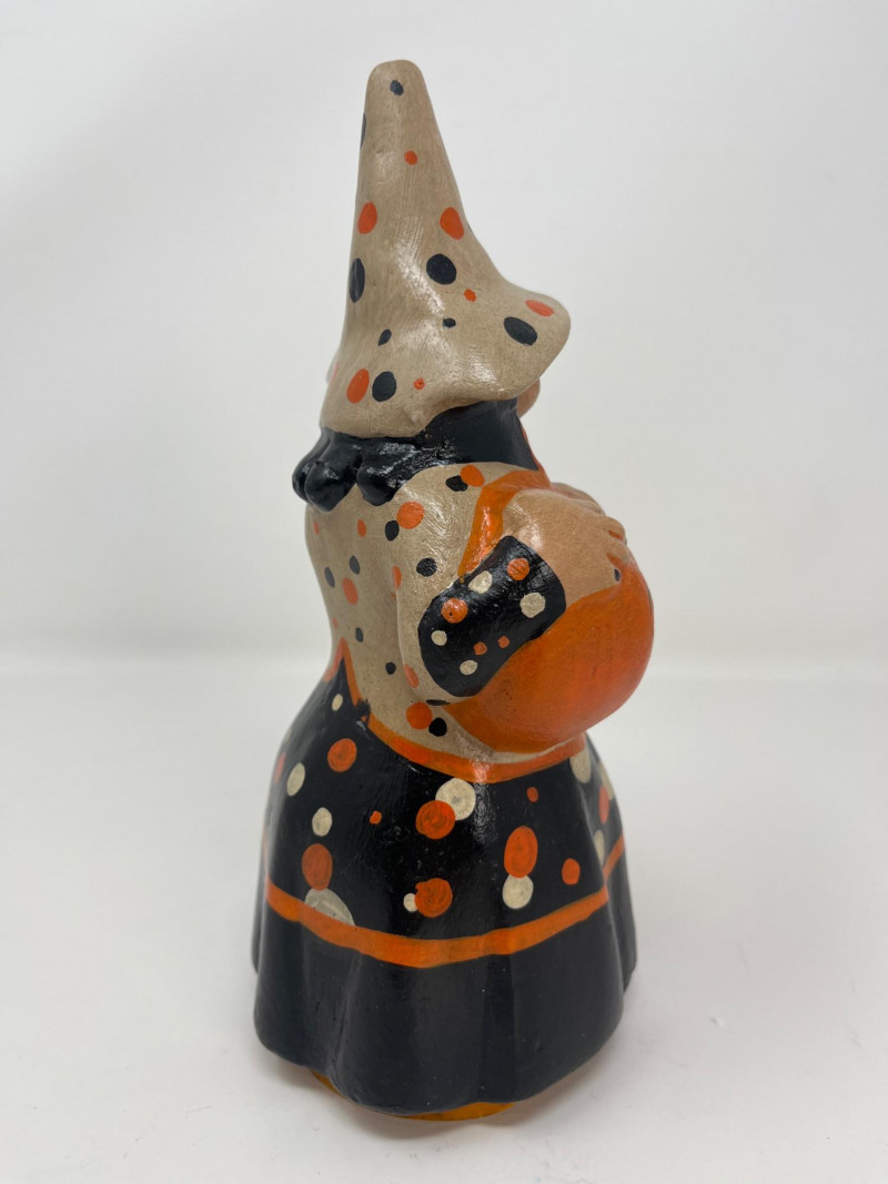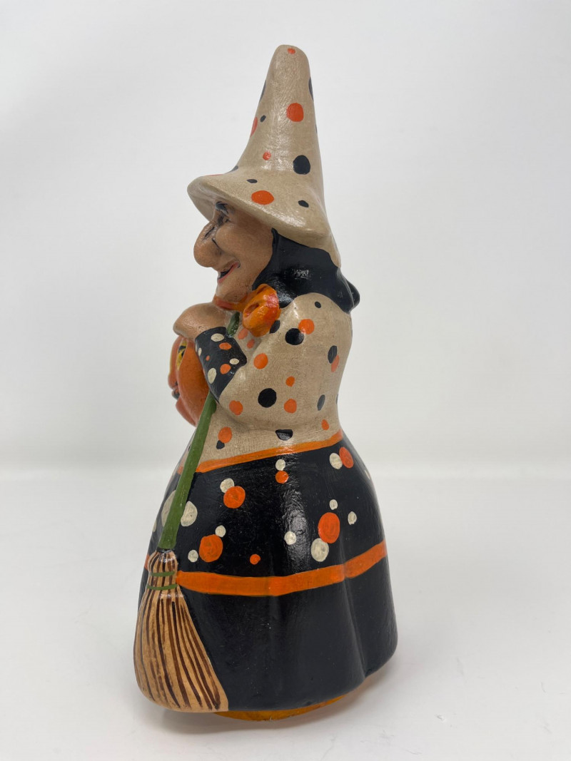 Handcrafted and hand-painted witch figurine by Vaillancourt Folk Art. This charming piece features a smiling witch holding a grinning jack-o'-lantern and a straw broom. She is dressed in a polka-dotted cloak and pointed hat, finished in festive Halloween colors of orange, black, and beige. Markings (on base): Dimensions: