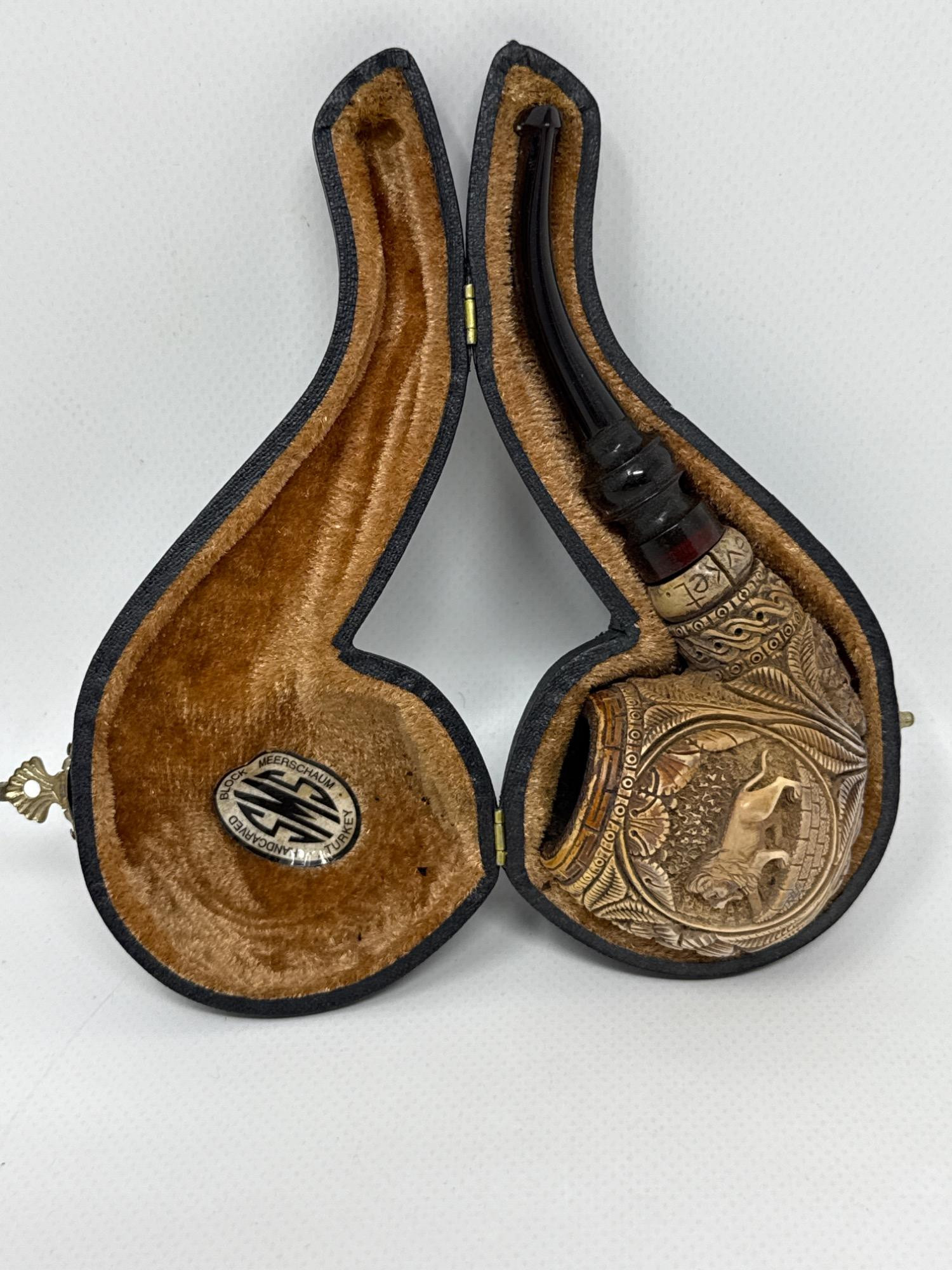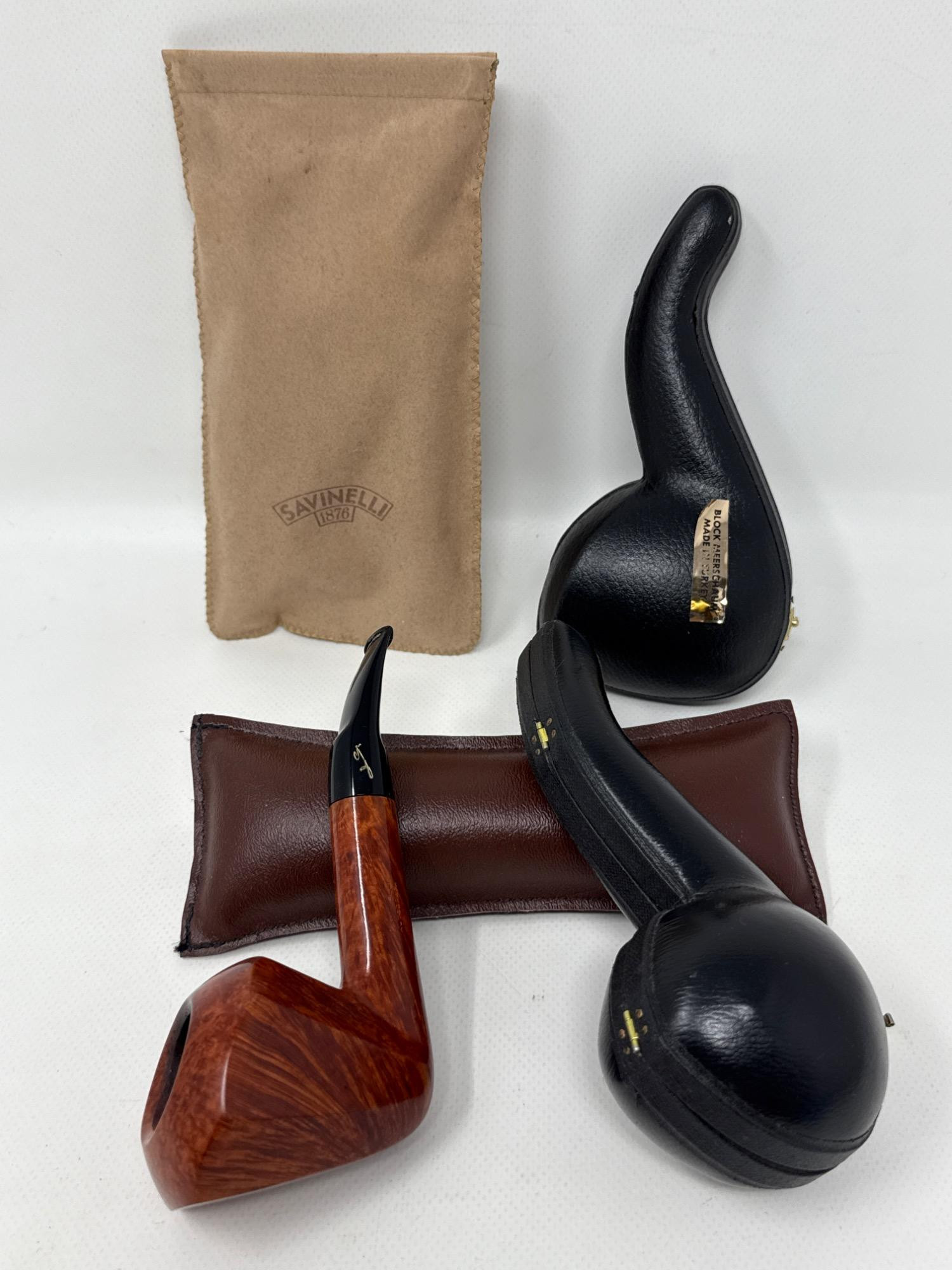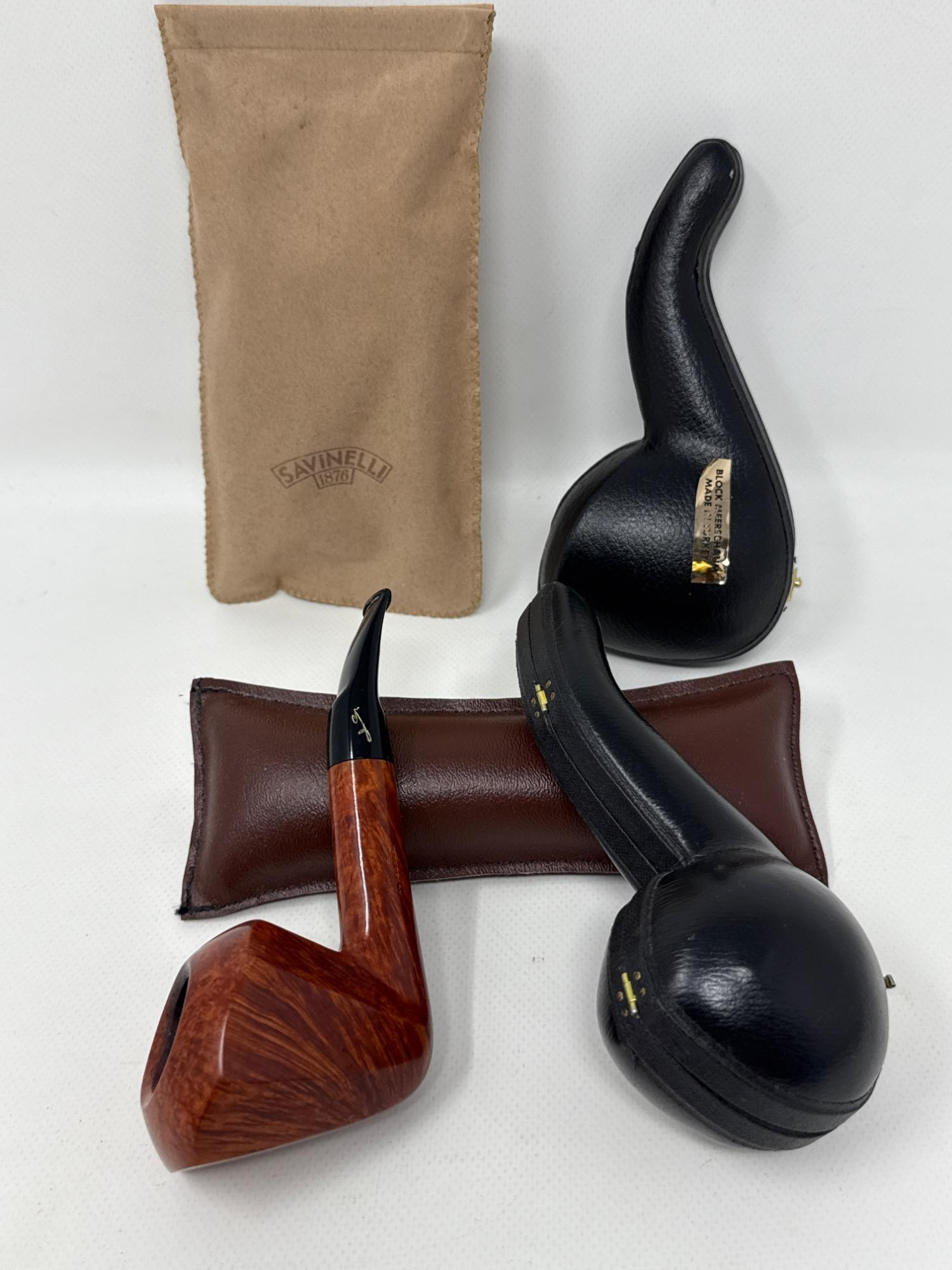 A collector’s trio of distinguished vintage smoking pipes, each with its own case, combining Italian craftsmanship and Turkish tradition: Savinelli Autograph Pipe – A hand-carved briar pipe from the renowned Italian maker Savinelli, marked “Autograph.” Known for their impeccable craftsmanship and grain selection, Autograph pipes are sought-after by connoisseurs. Comes with the original Savinelli pouch and leather sleeve. Block Meerschaum Pipe – Lion Carving – Made in Turkey and intricately detailed with high-relief carvings featuring a lion motif. Housed in a plush fitted case with satin lining and “Block Meerschaum – Made in Turkey” label. Signed Meerschaum Pipe – T. Bekler – Beautifully carved with a classic lattice pattern and amber-like stem. Signed by noted Turkish pipe artisan T. Bekler. Includes original fitted velvet-lined case. A receipt dated 2004 is included for provenance.