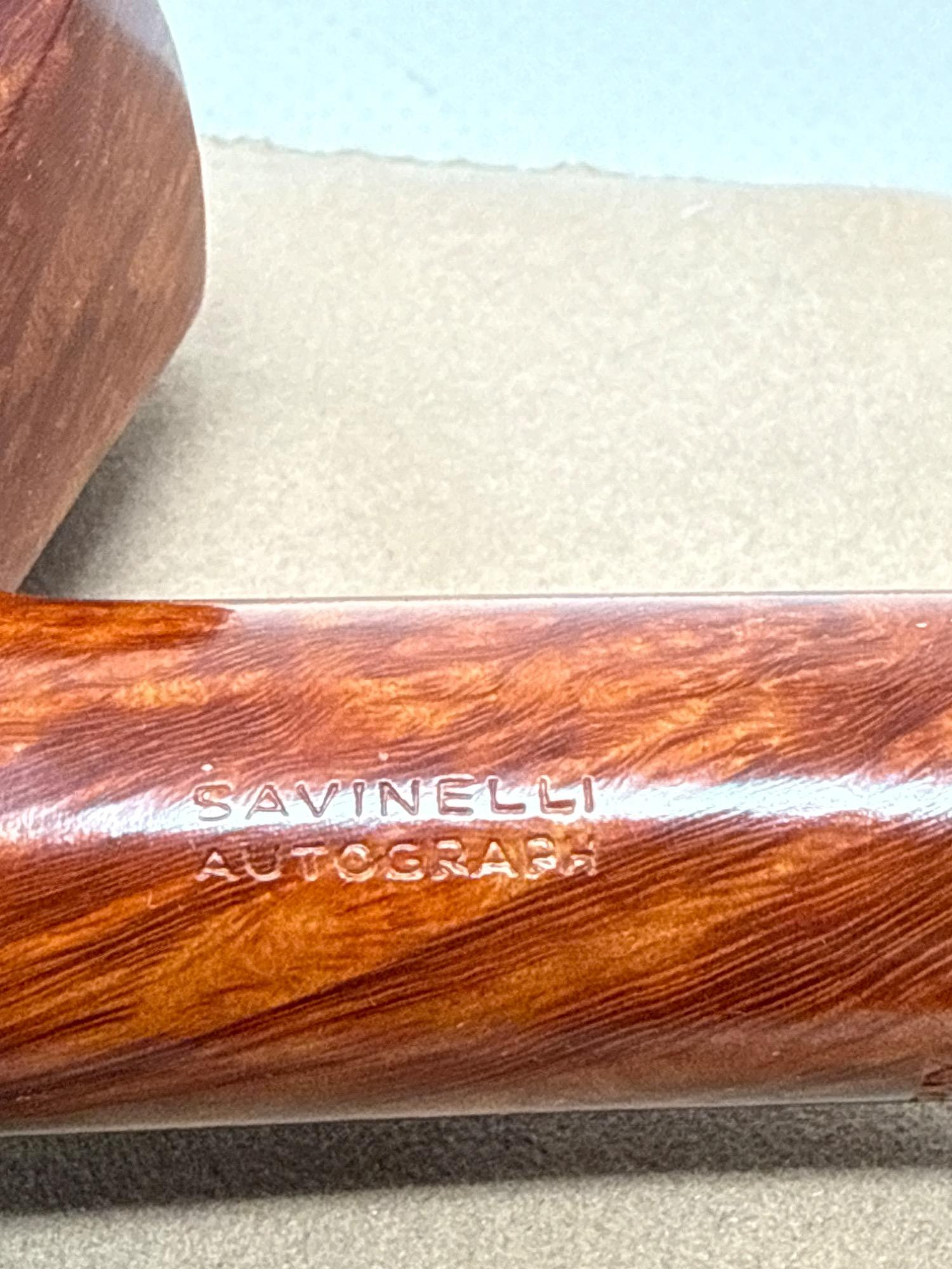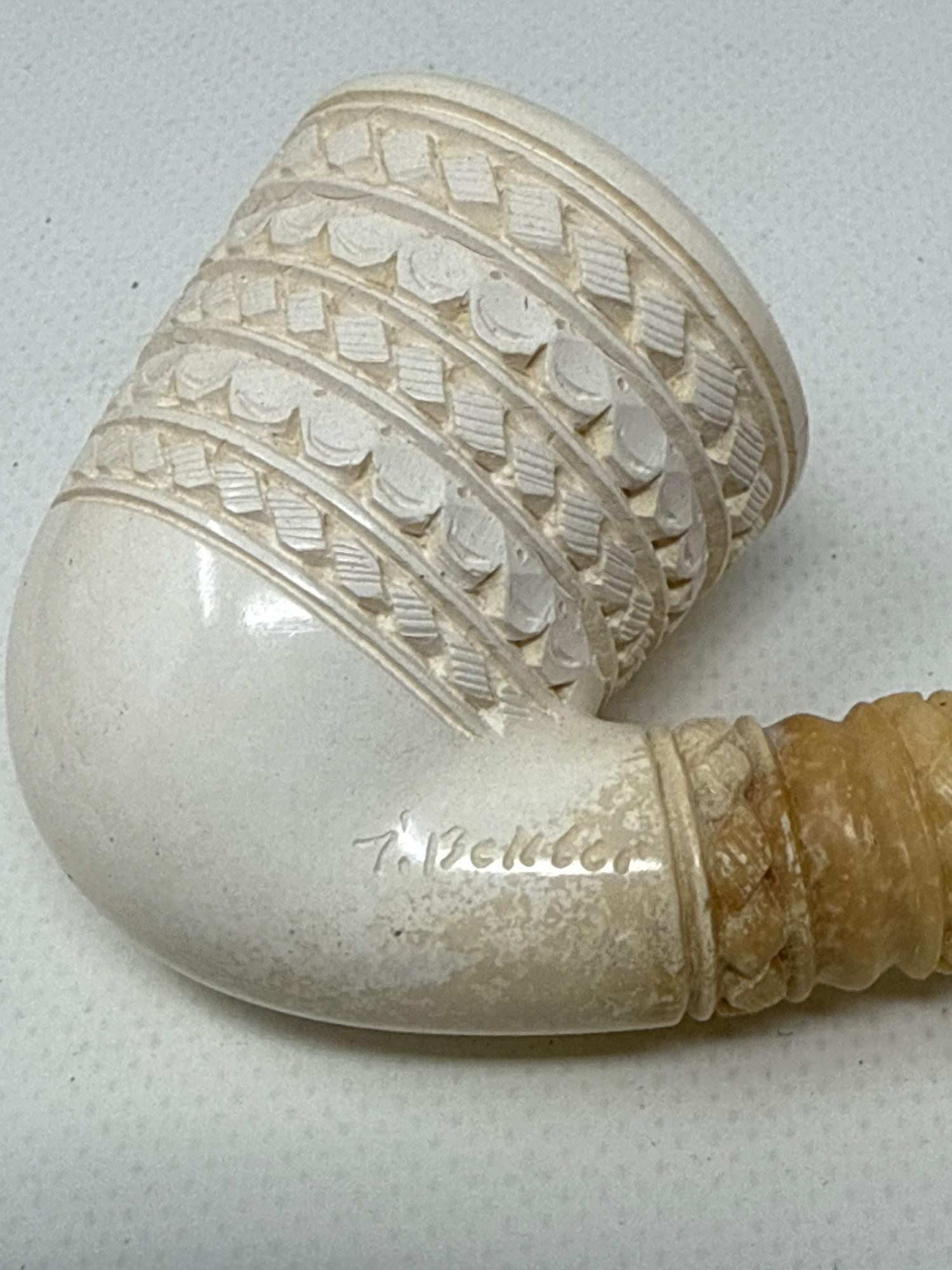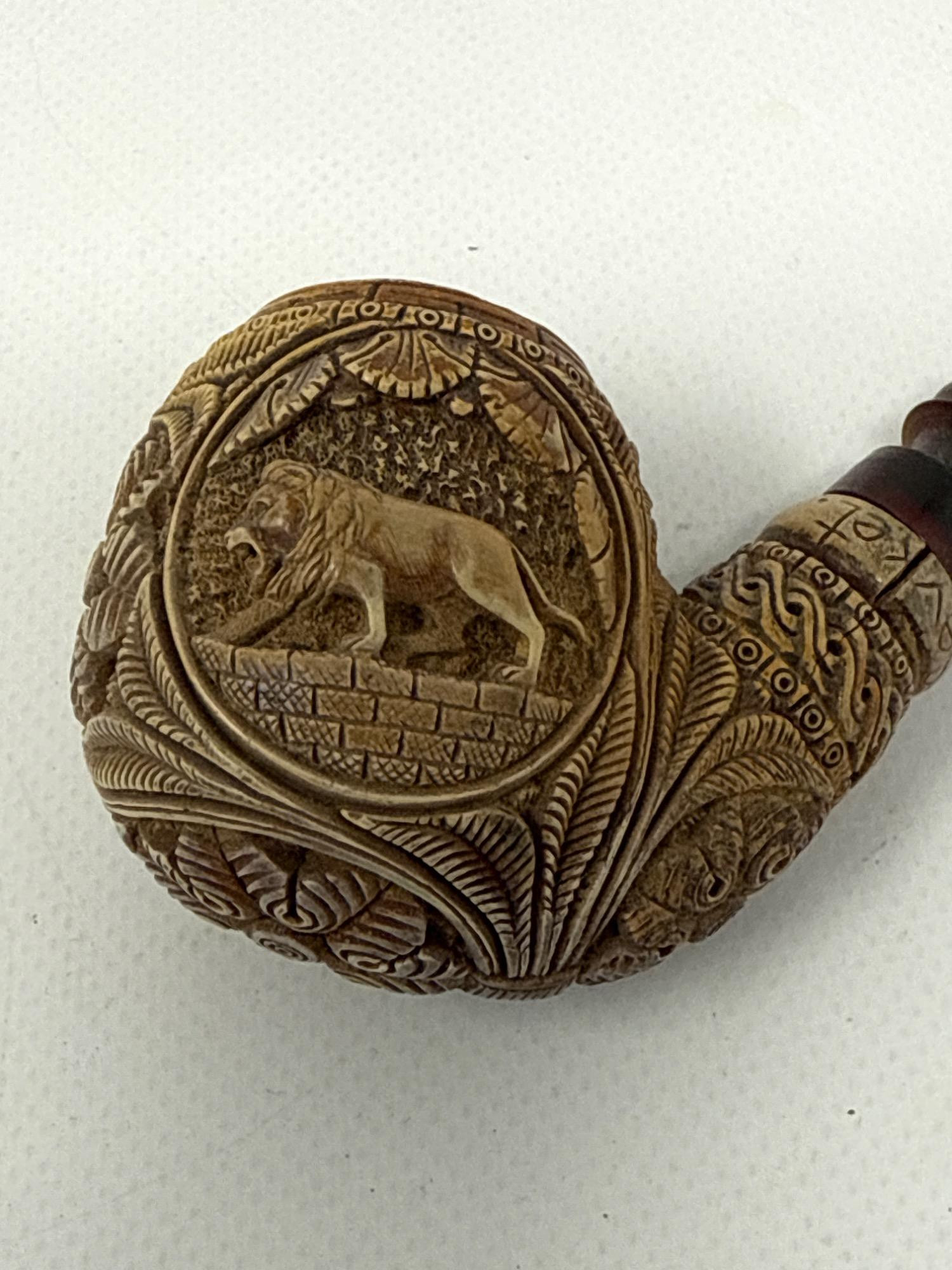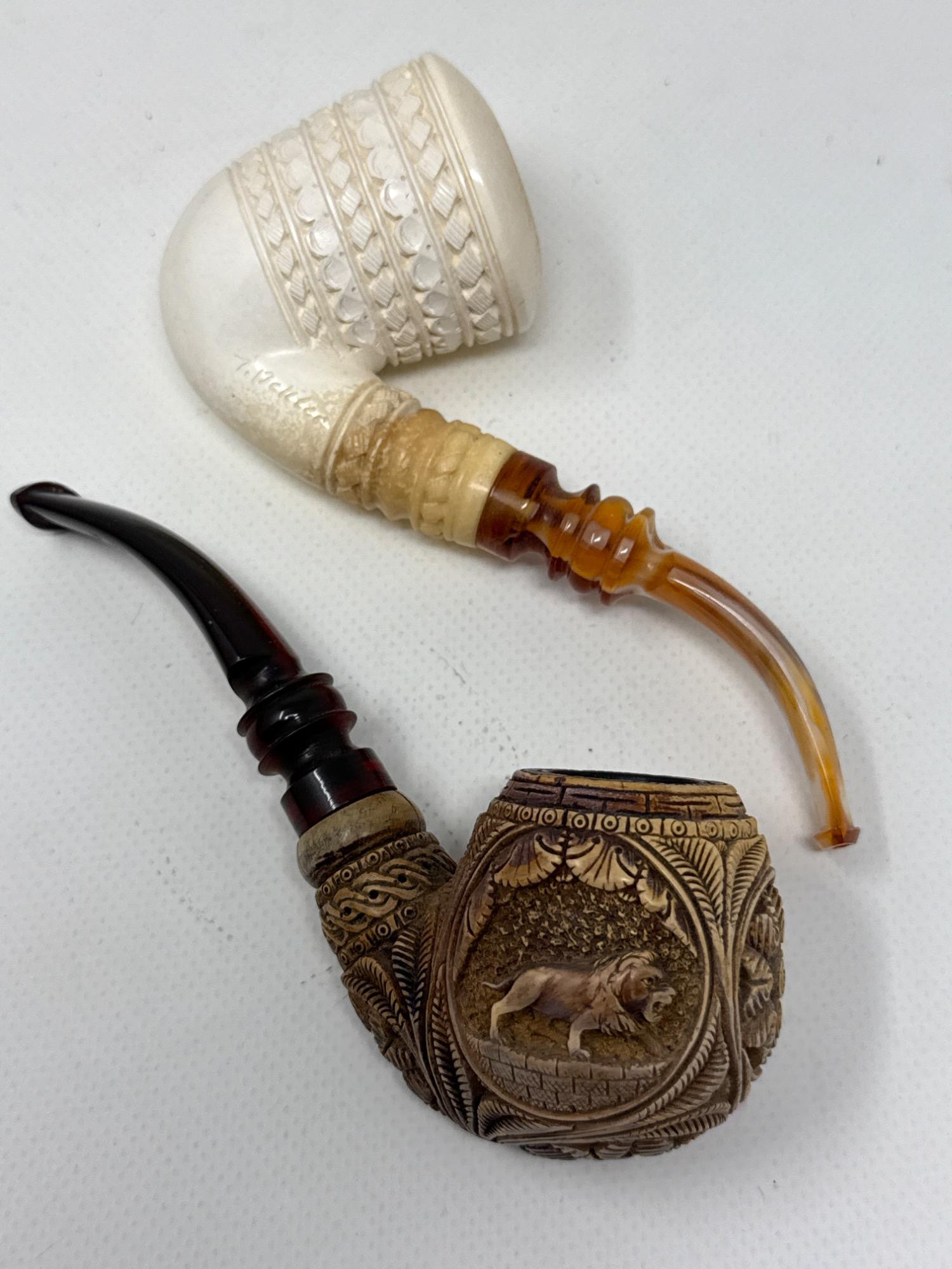 A collector’s trio of distinguished vintage smoking pipes, each with its own case, combining Italian craftsmanship and Turkish tradition: Savinelli Autograph Pipe – A hand-carved briar pipe from the renowned Italian maker Savinelli, marked “Autograph.” Known for their impeccable craftsmanship and grain selection, Autograph pipes are sought-after by connoisseurs. Comes with the original Savinelli pouch and leather sleeve. Block Meerschaum Pipe – Lion Carving – Made in Turkey and intricately detailed with high-relief carvings featuring a lion motif. Housed in a plush fitted case with satin lining and “Block Meerschaum – Made in Turkey” label. Signed Meerschaum Pipe – T. Bekler – Beautifully carved with a classic lattice pattern and amber-like stem. Signed by noted Turkish pipe artisan T. Bekler. Includes original fitted velvet-lined case. A receipt dated 2004 is included for provenance.