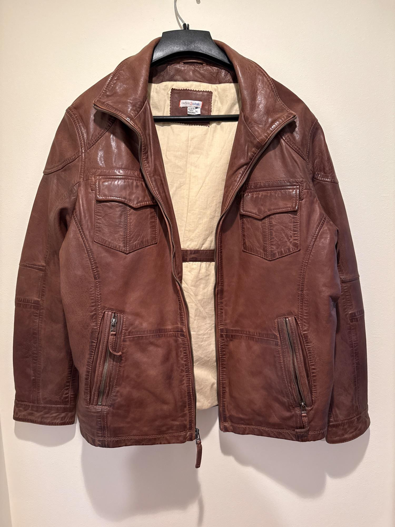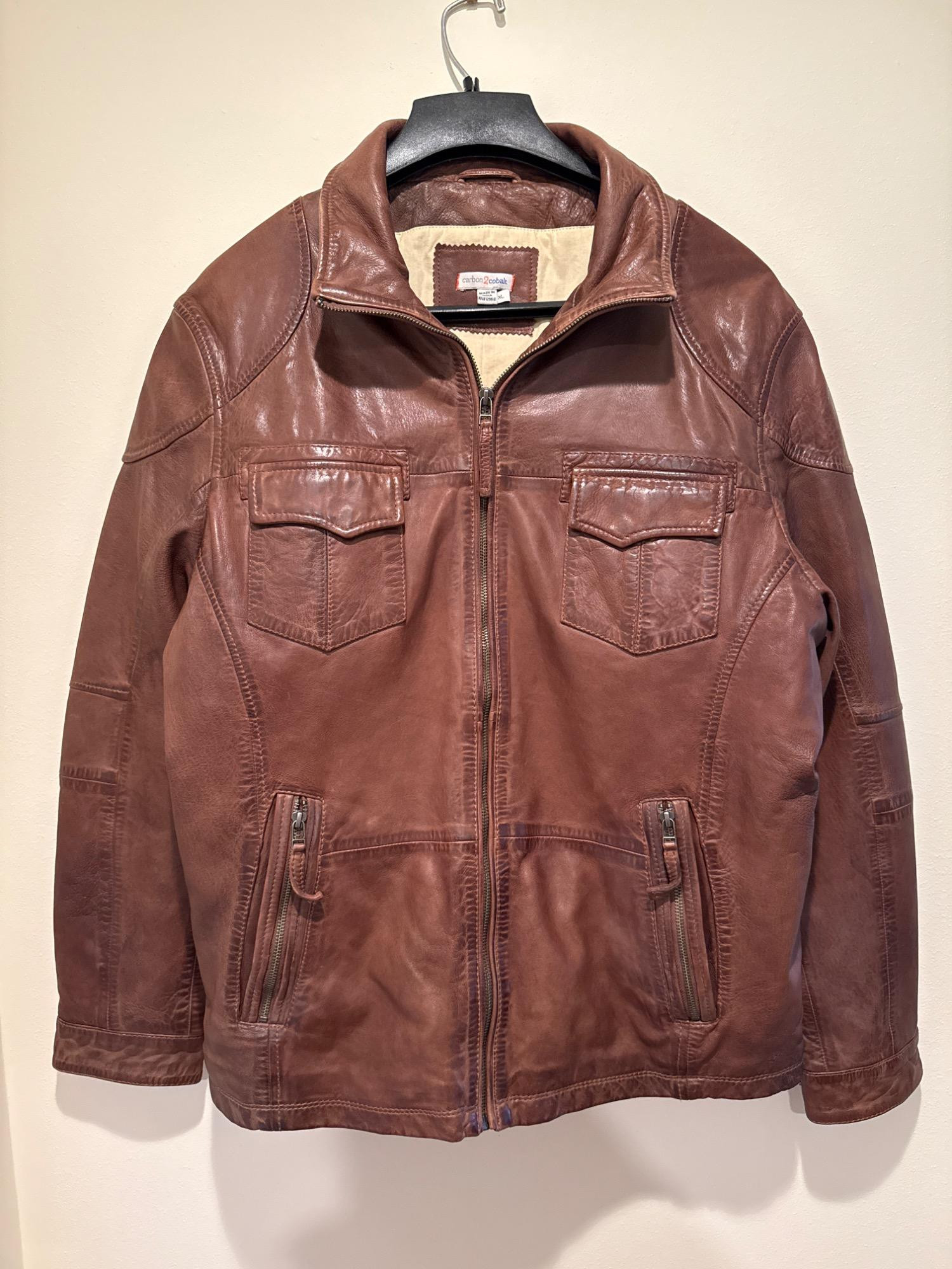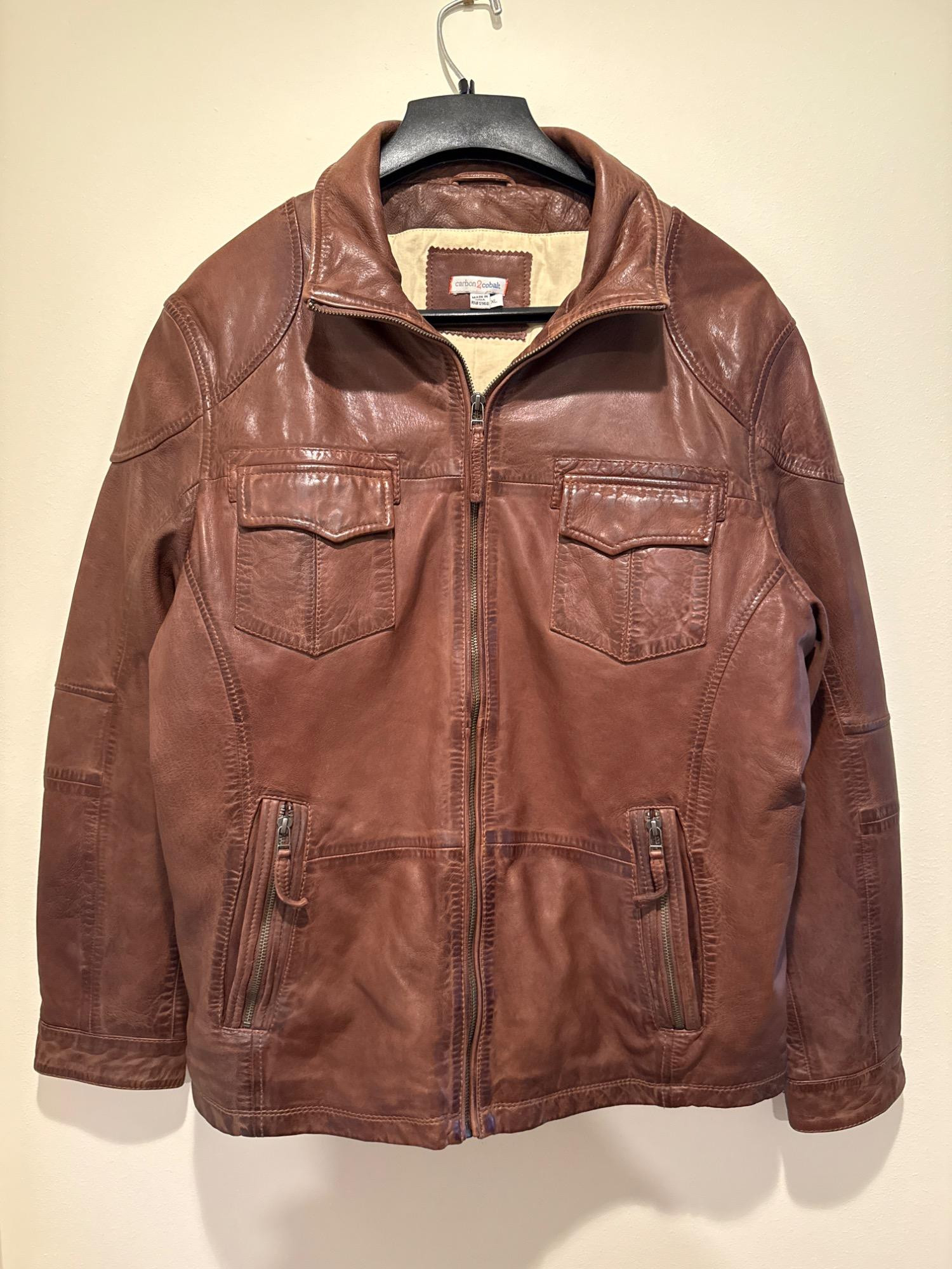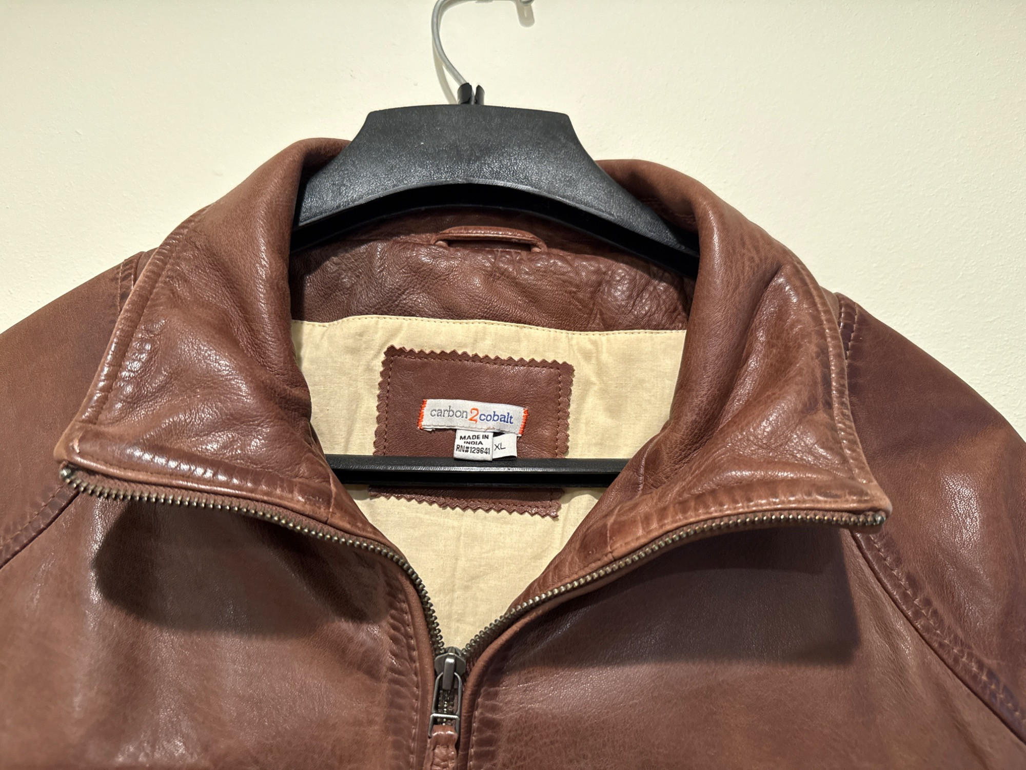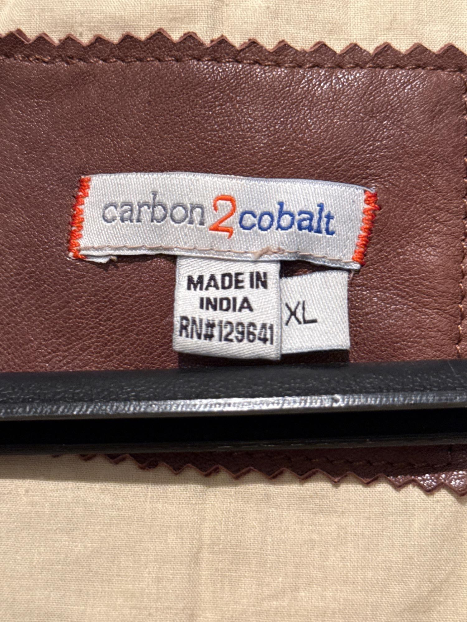 Elevate your outerwear game with this rugged and stylish Carbon2Cobalt genuine leather jacket in a rich reddish-brown hue. Designed for comfort and built to last, this extra-large jacket features: Soft, broken-in leather exterior with a naturally worn finish Four front pockets (two zippered hand pockets, two snap chest pockets) Cozy light tan interior lining with inner zip and slip pockets for added utility Full front zip closure with additional inner button strap for security Classic stand collar that can be folded down or zipped up for warmth Size: XL (see inner tag) Made in India | RN# 129641