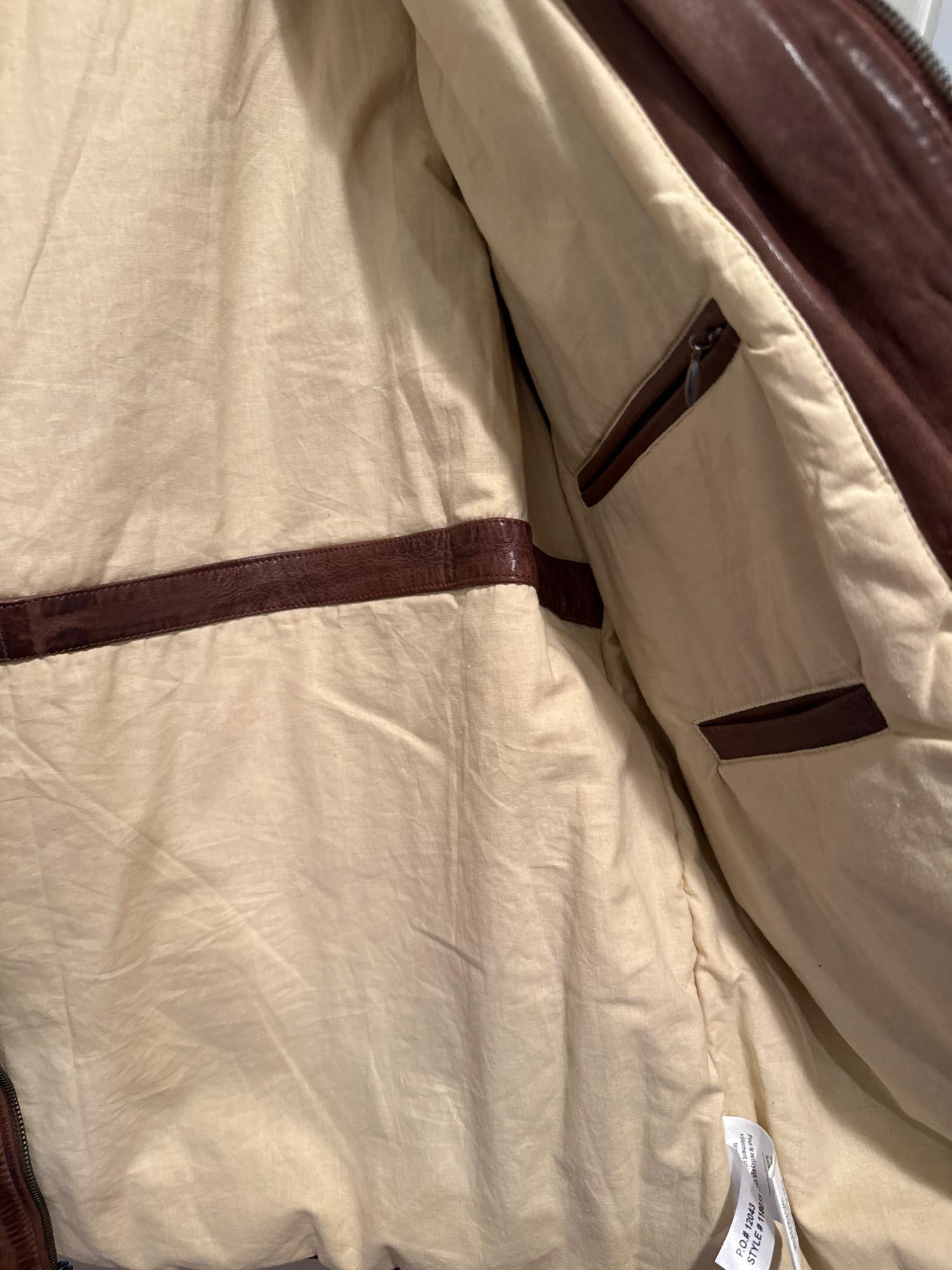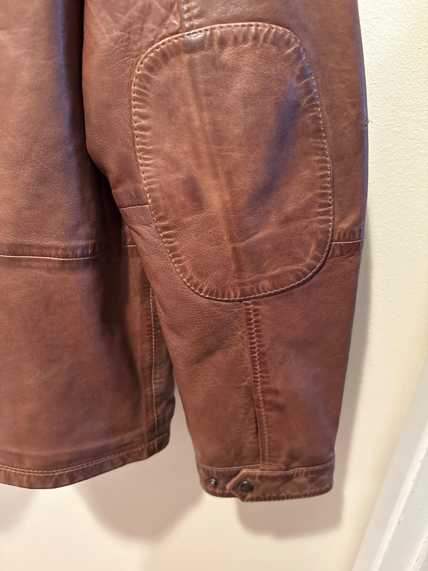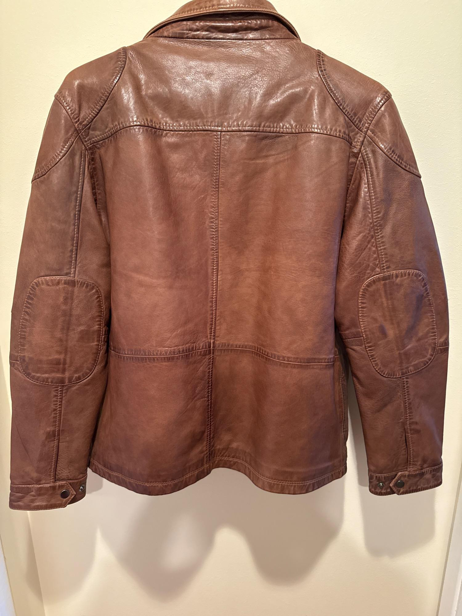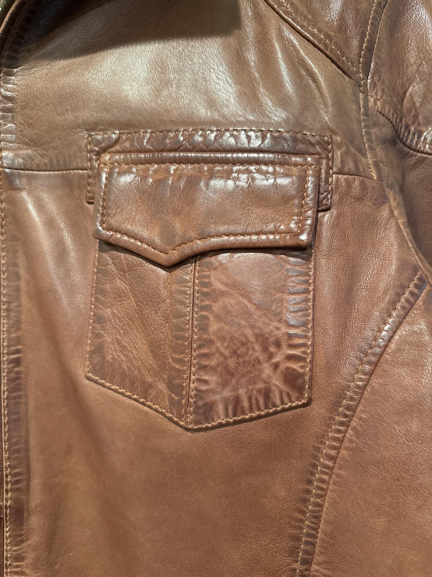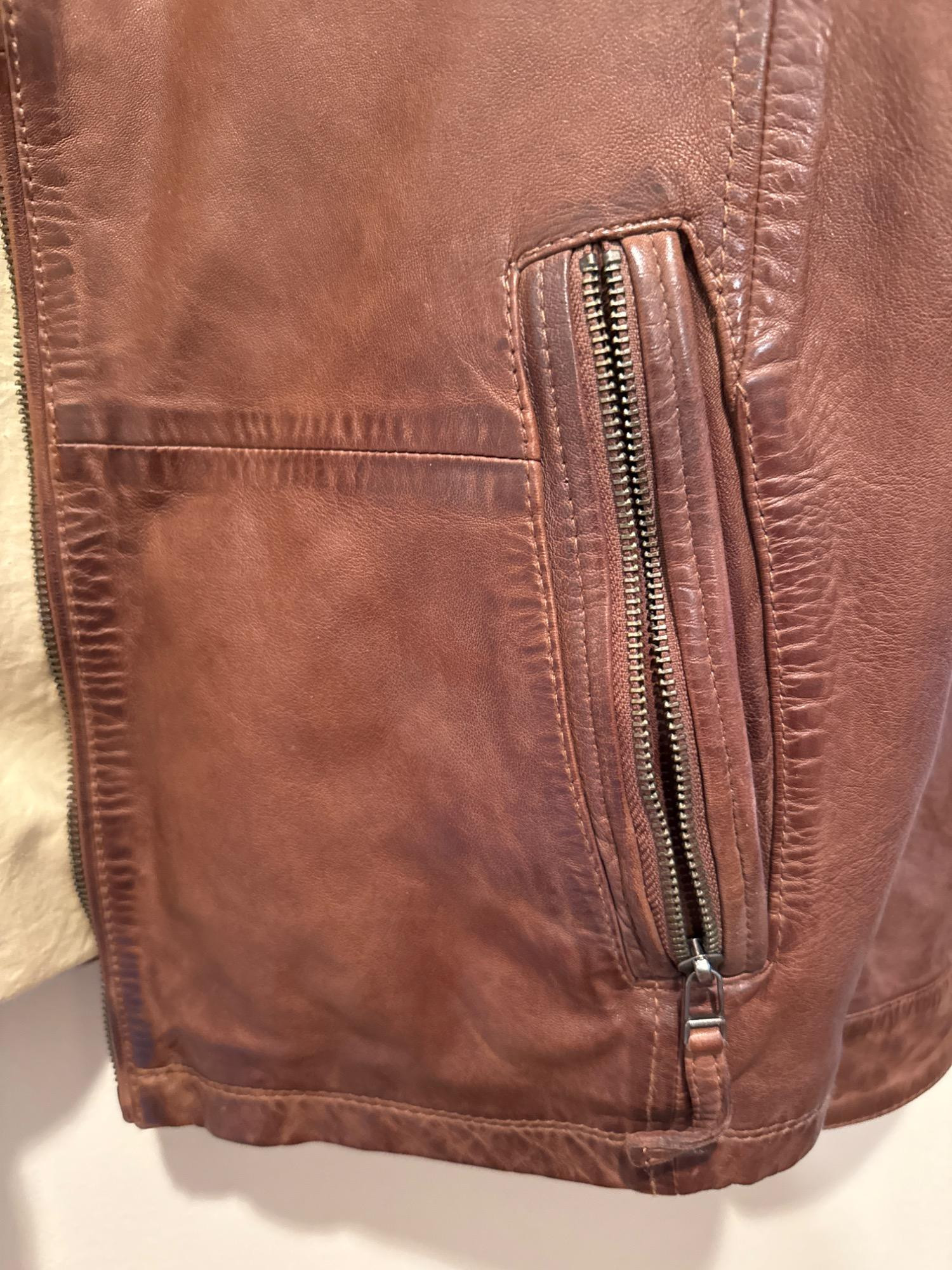 Elevate your outerwear game with this rugged and stylish Carbon2Cobalt genuine leather jacket in a rich reddish-brown hue. Designed for comfort and built to last, this extra-large jacket features: Soft, broken-in leather exterior with a naturally worn finish Four front pockets (two zippered hand pockets, two snap chest pockets) Cozy light tan interior lining with inner zip and slip pockets for added utility Full front zip closure with additional inner button strap for security Classic stand collar that can be folded down or zipped up for warmth Size: XL (see inner tag) Made in India | RN# 129641