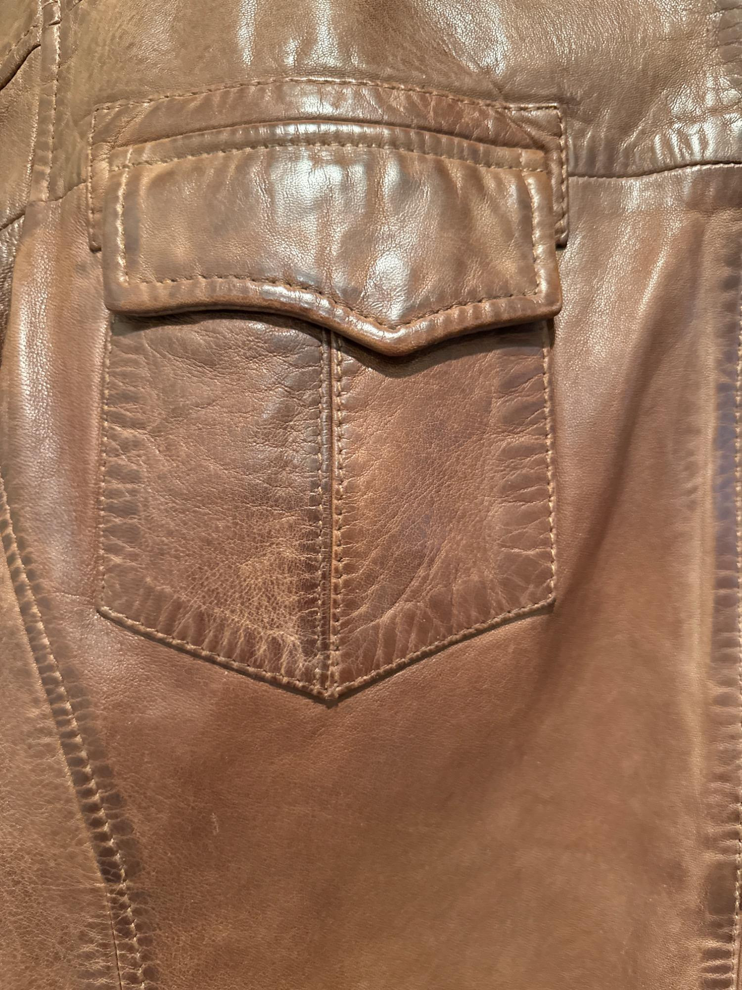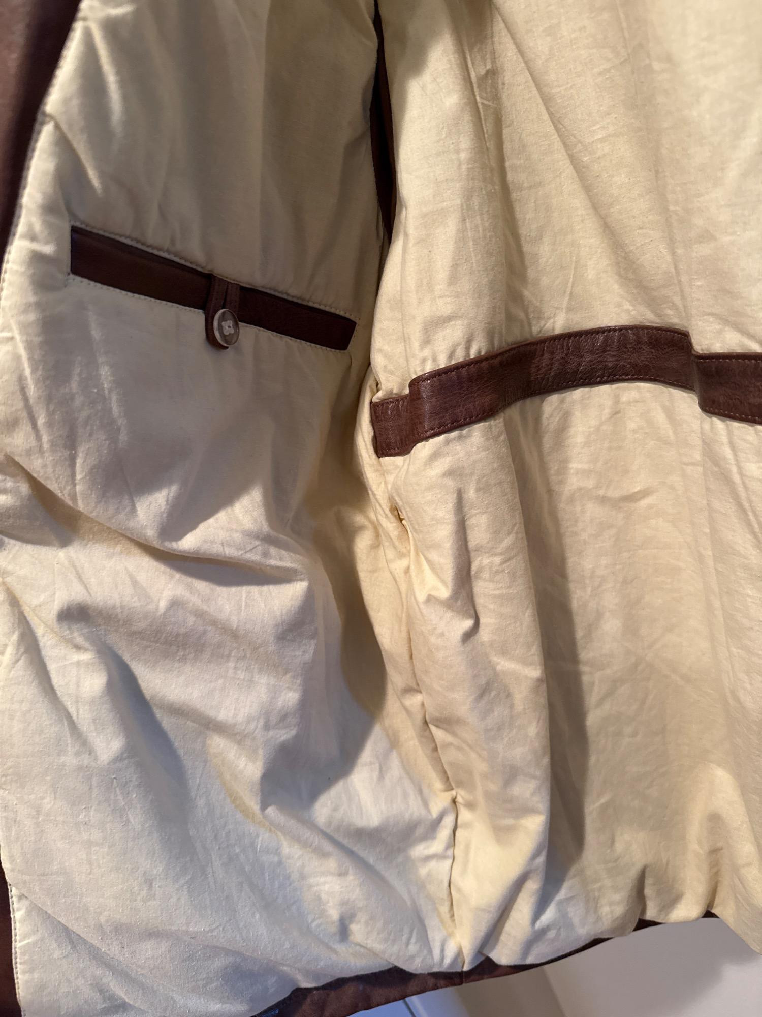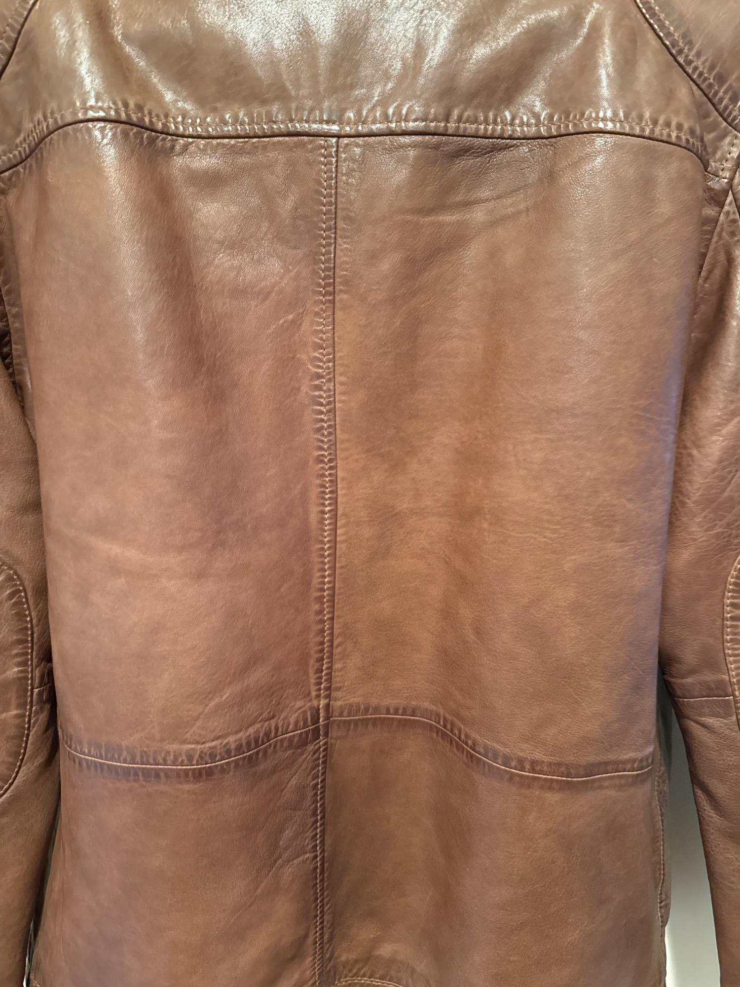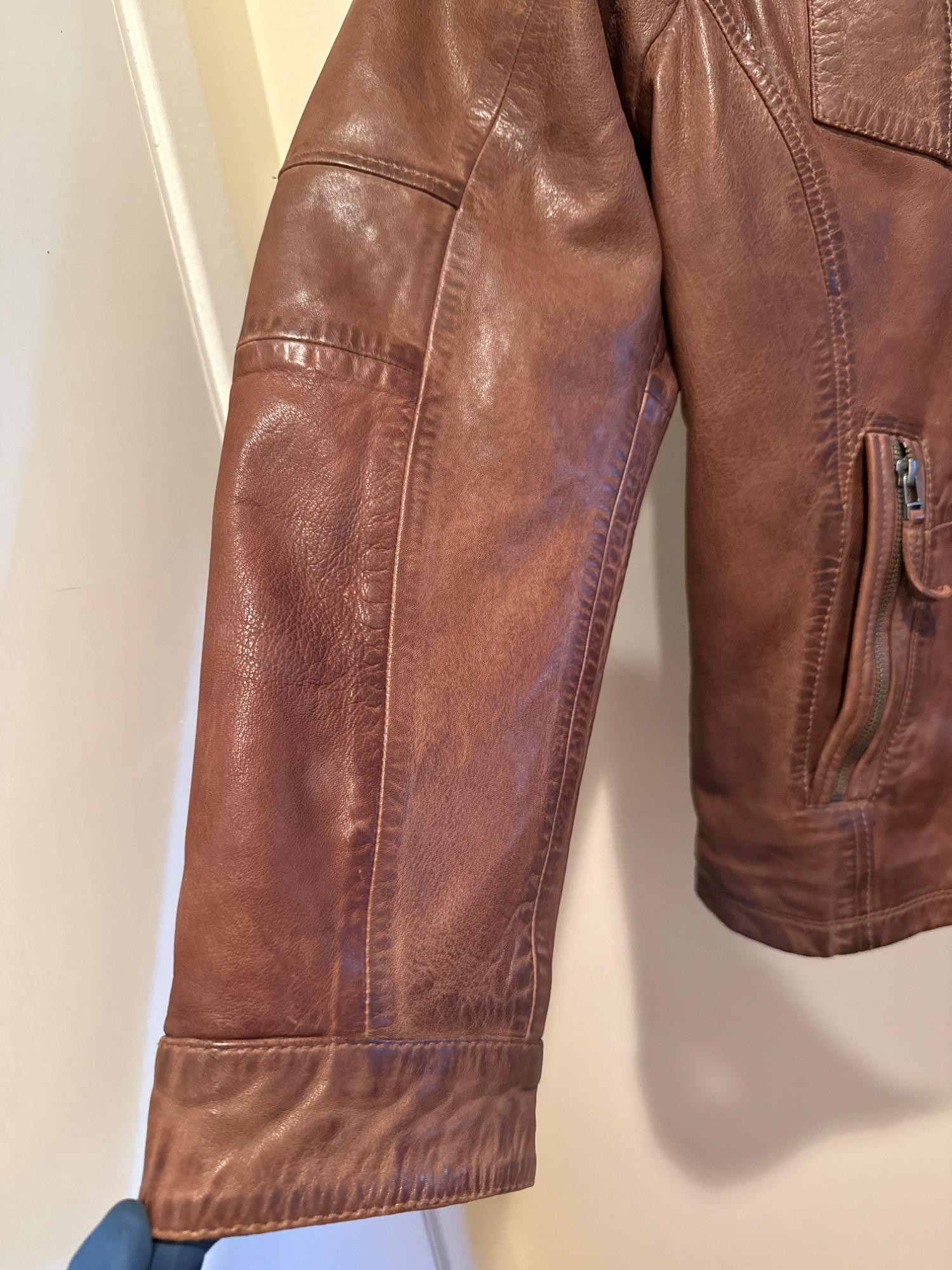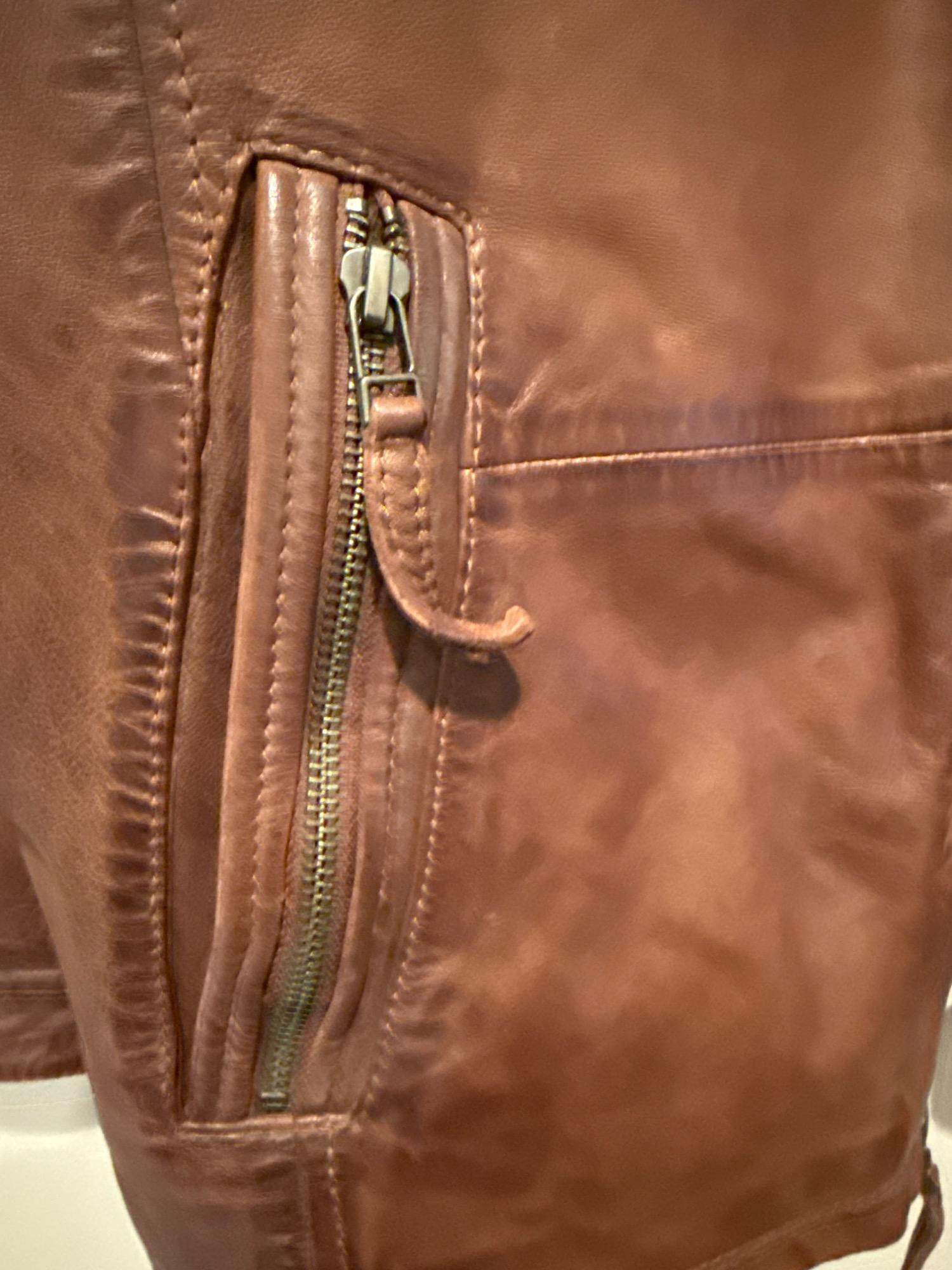Elevate your outerwear game with this rugged and stylish Carbon2Cobalt genuine leather jacket in a rich reddish-brown hue. Designed for comfort and built to last, this extra-large jacket features: Soft, broken-in leather exterior with a naturally worn finish Four front pockets (two zippered hand pockets, two snap chest pockets) Cozy light tan interior lining with inner zip and slip pockets for added utility Full front zip closure with additional inner button strap for security Classic stand collar that can be folded down or zipped up for warmth Size: XL (see inner tag) Made in India | RN# 129641