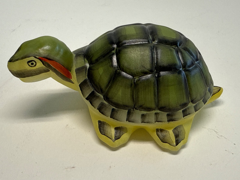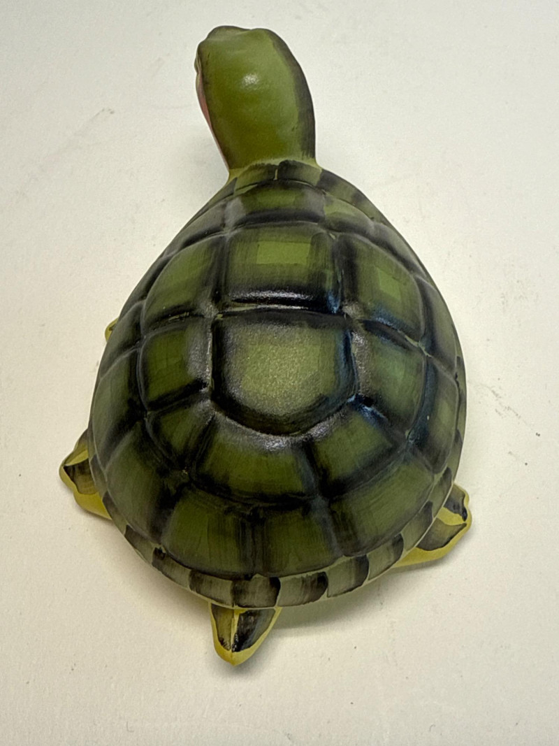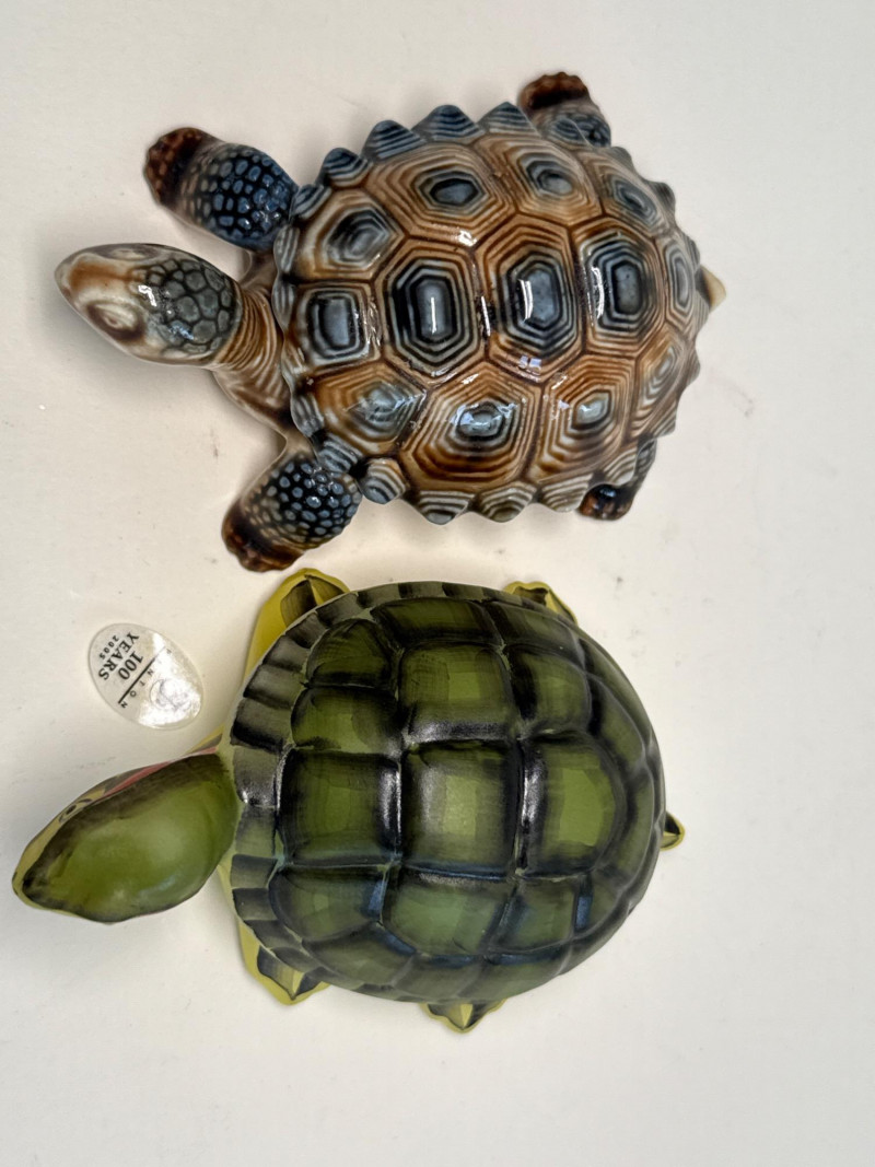 Add character and collectability to your shelf with this charming turtle duo. Fenton Glass Turtle (100-Year Edition) Dimensions: 4.25" L x 2.5" W x 1.75" T Wade Ceramic Turtle Box (England) Dimensions: 4" L x 3" W x 1.5" T