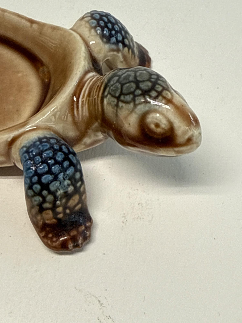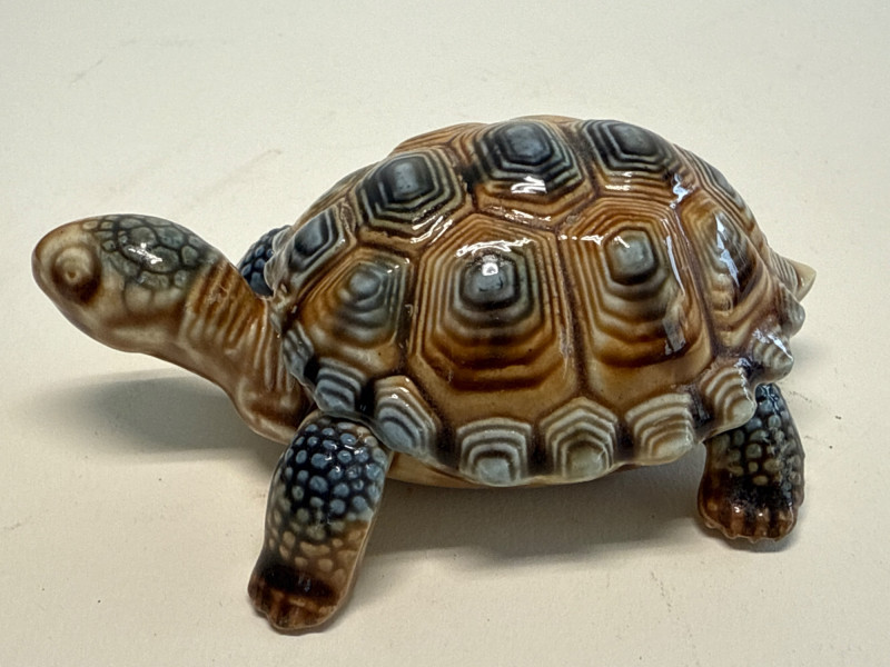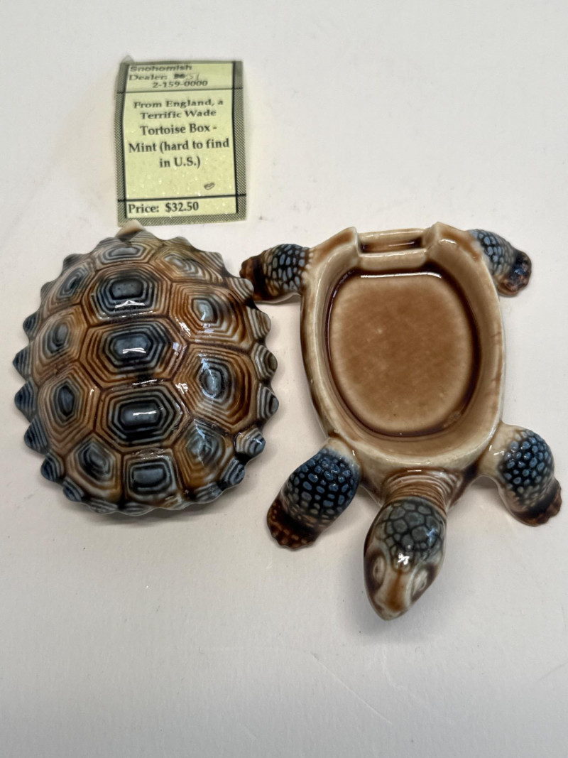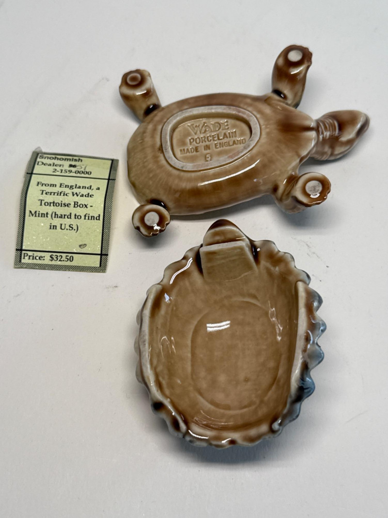 This adorable ceramic tortoise box is not only beautifully detailed but also practical. The shell lifts off to reveal a small compartment. Labeled "From England, a Terrific Wade Tortoise Box – Mint (hard to find in U.S.)" with a marked price of $32.50. A collectible gem from Wade, known for their whimsical and finely glazed figurines.