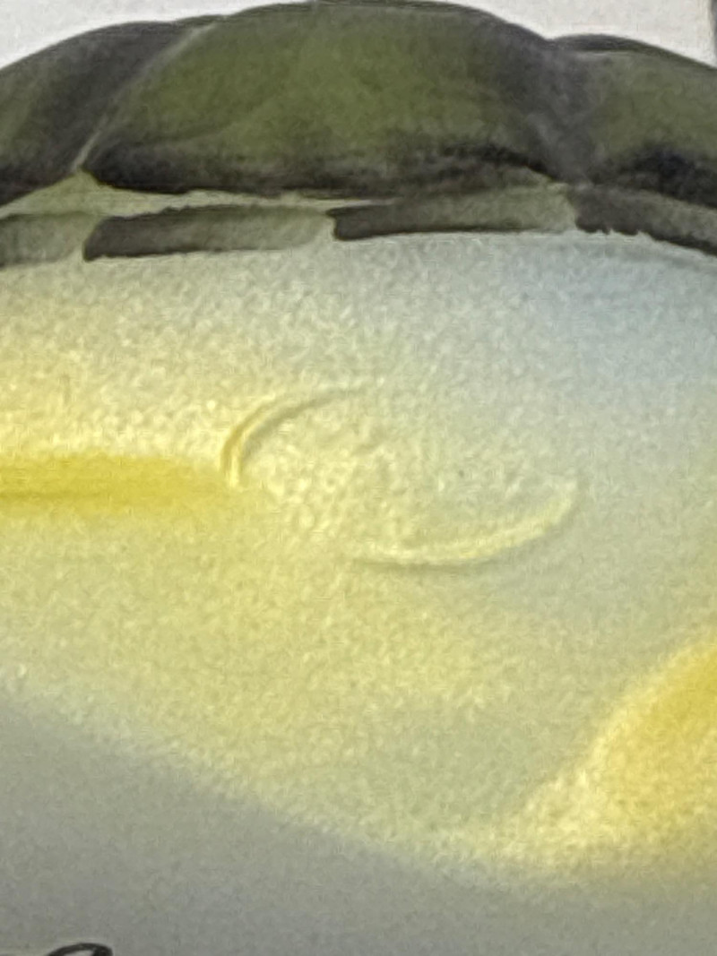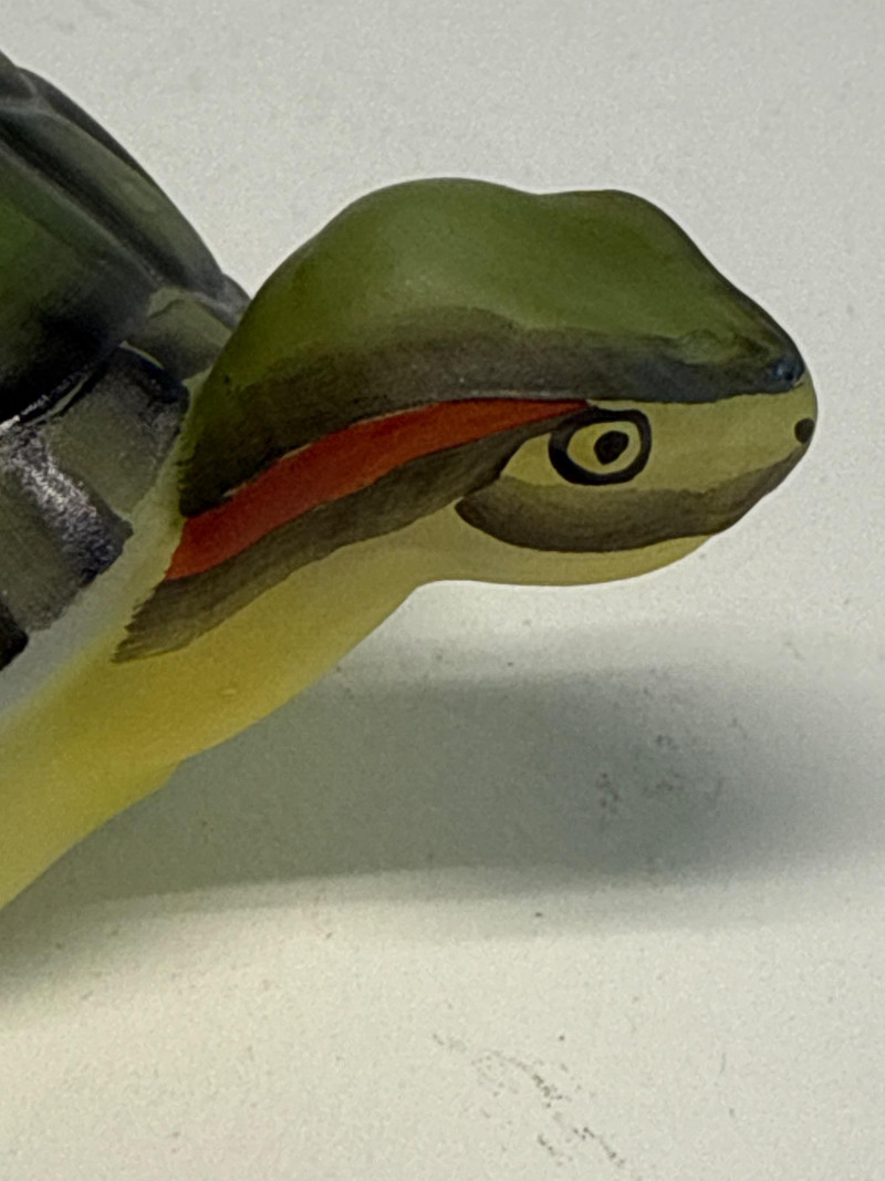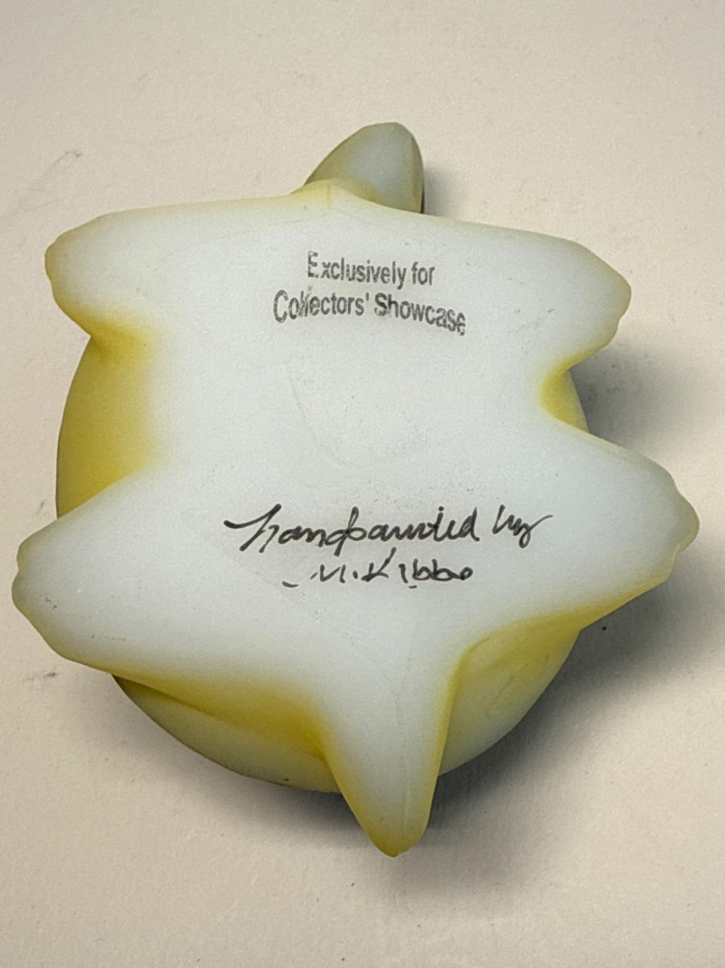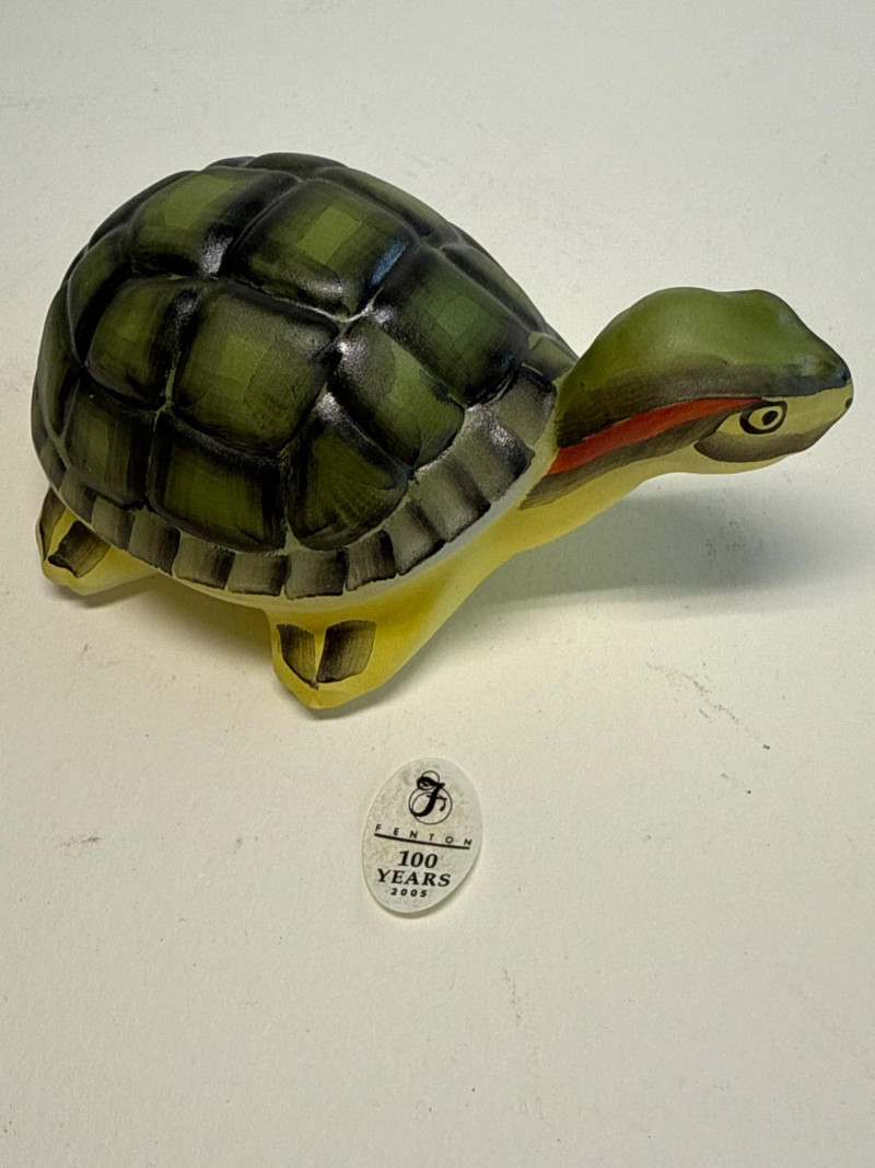 This hand-painted green glass turtle commemorates Fenton's 100th anniversary. Marked "Exclusively for Collectors' Showcase" and signed by the artist M. Kibbe, it features smooth satin glass with rich airbrushed tones and bold black outlines. A true showcase piece for glass and Fenton enthusiasts.