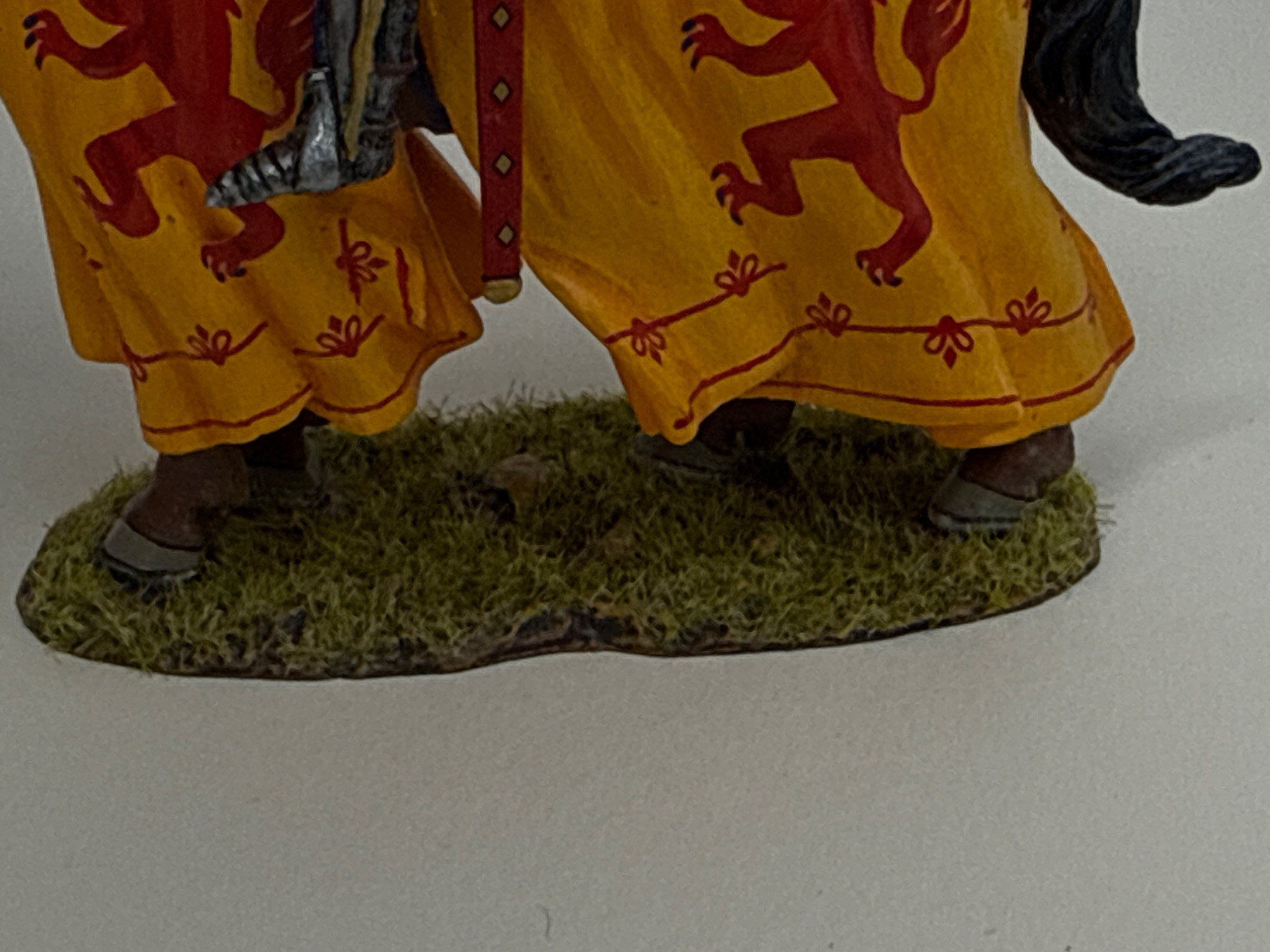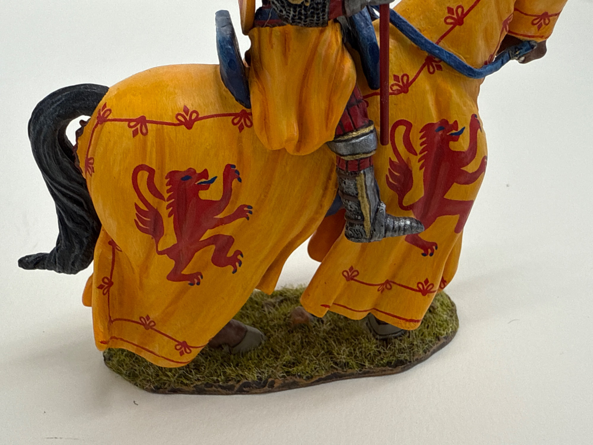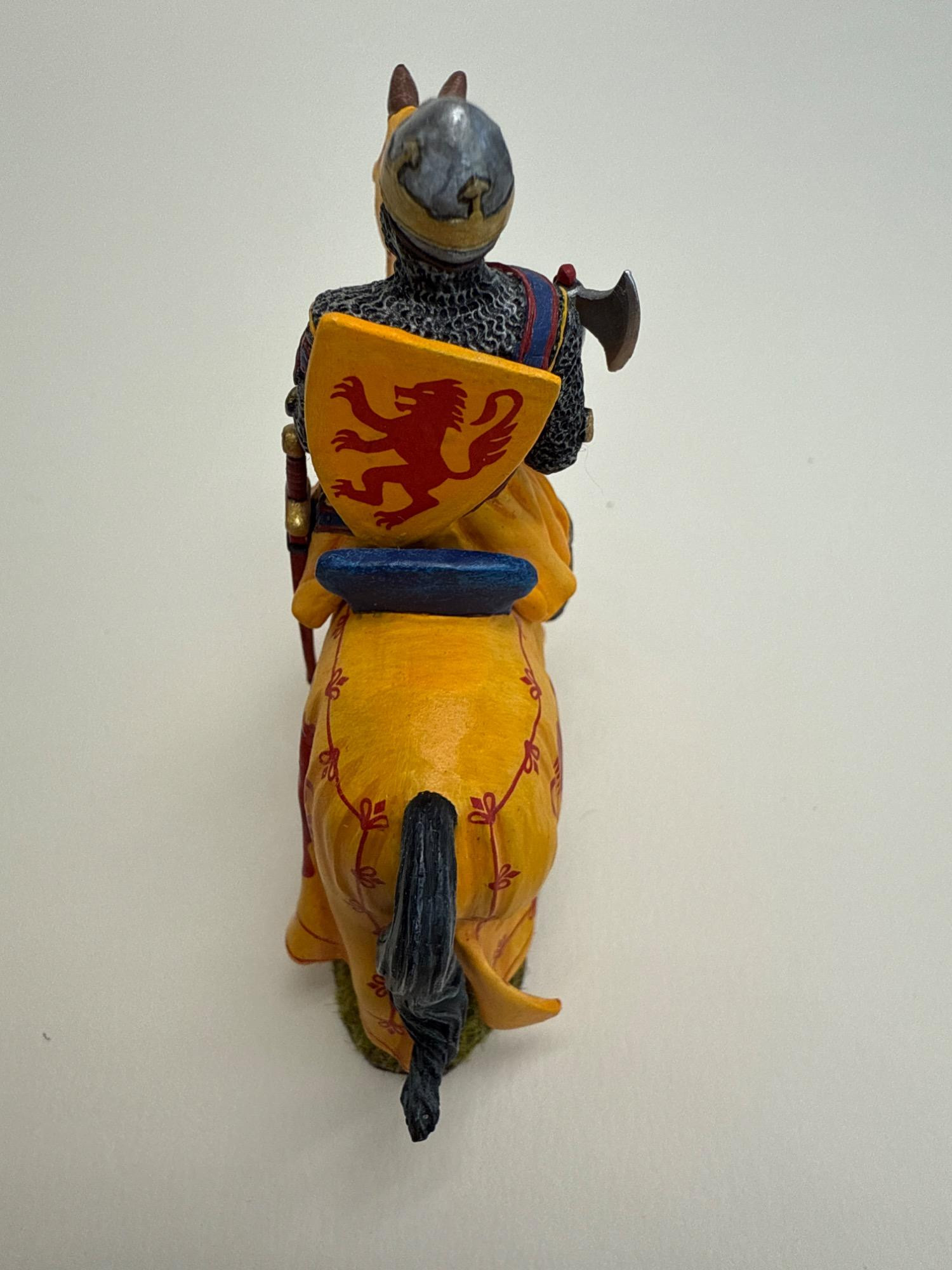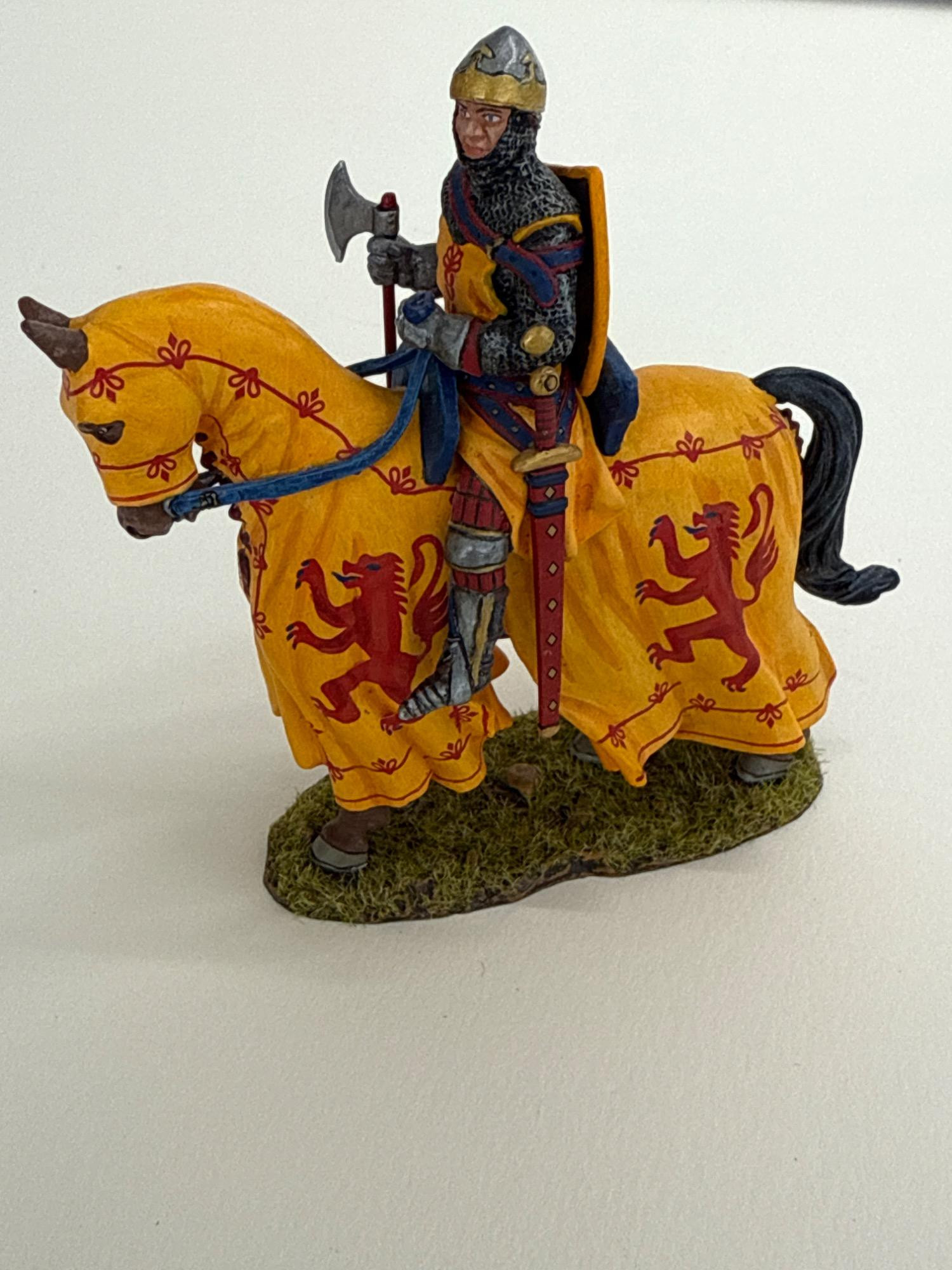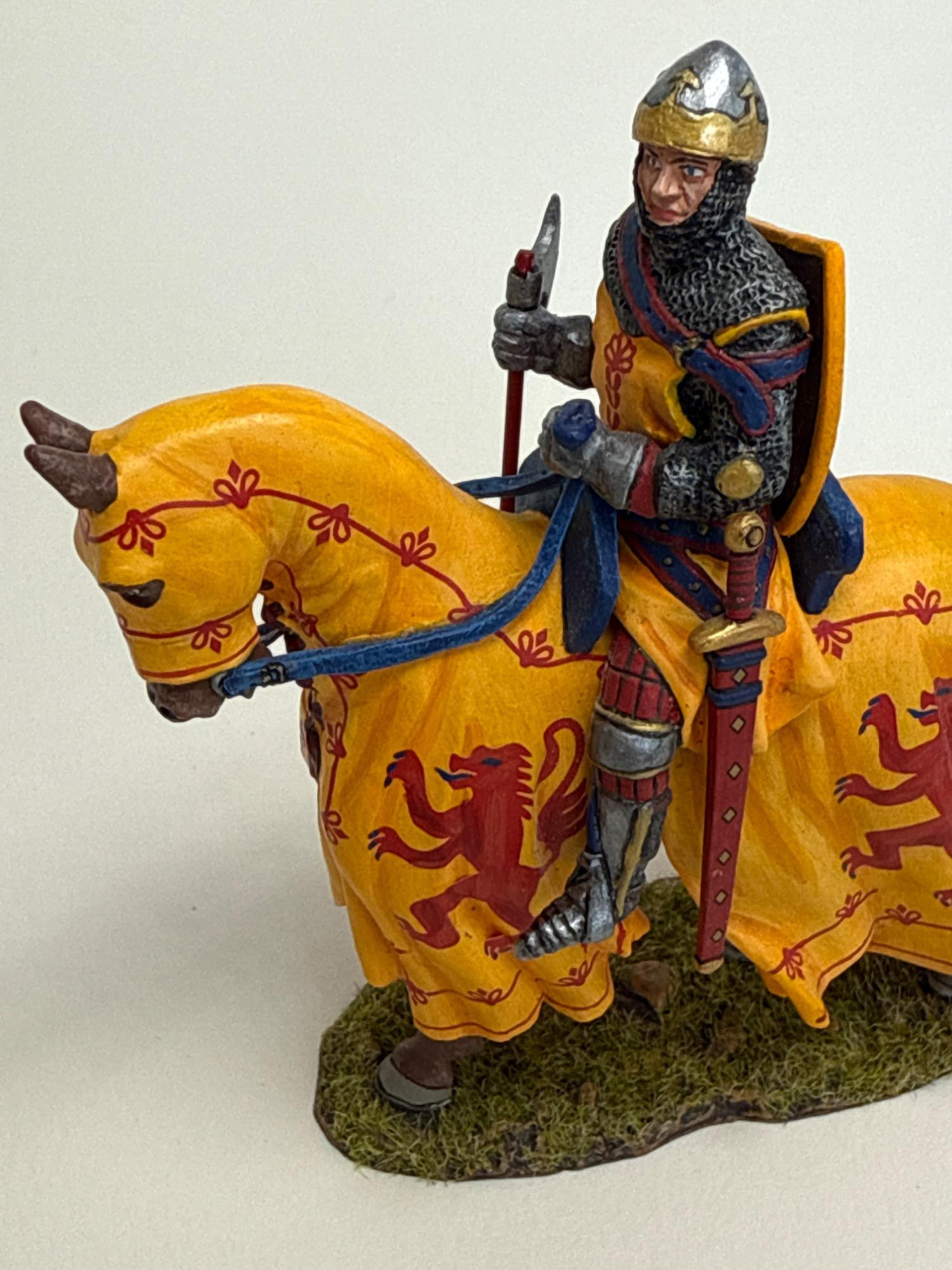 Add a bold piece of Scottish history to your collection with this exquisitely detailed Robert the Bruce metal and resin figurine by King & Country. This is Model MK200, produced in 2020, and depicts the legendary Scottish king clad in full battle regalia atop his steed, both draped in vibrant heraldic banners featuring the red lion rampant. Dimensions: 3.75" long x 4" tall Materials: Heavy metal and resin construction Features: Includes removable weaponry Includes original box and fitted foam insert for secure display or storage Markings: Underside is stamped with “King & Country’s Robert the Bruce ©2020”