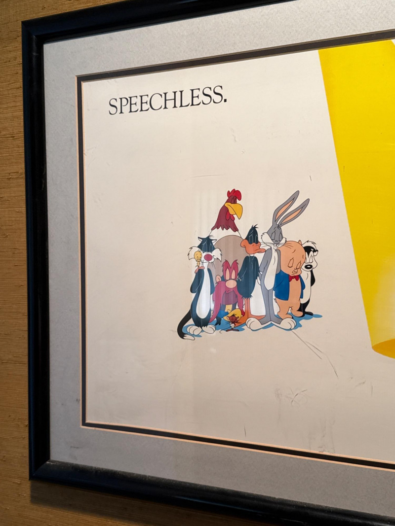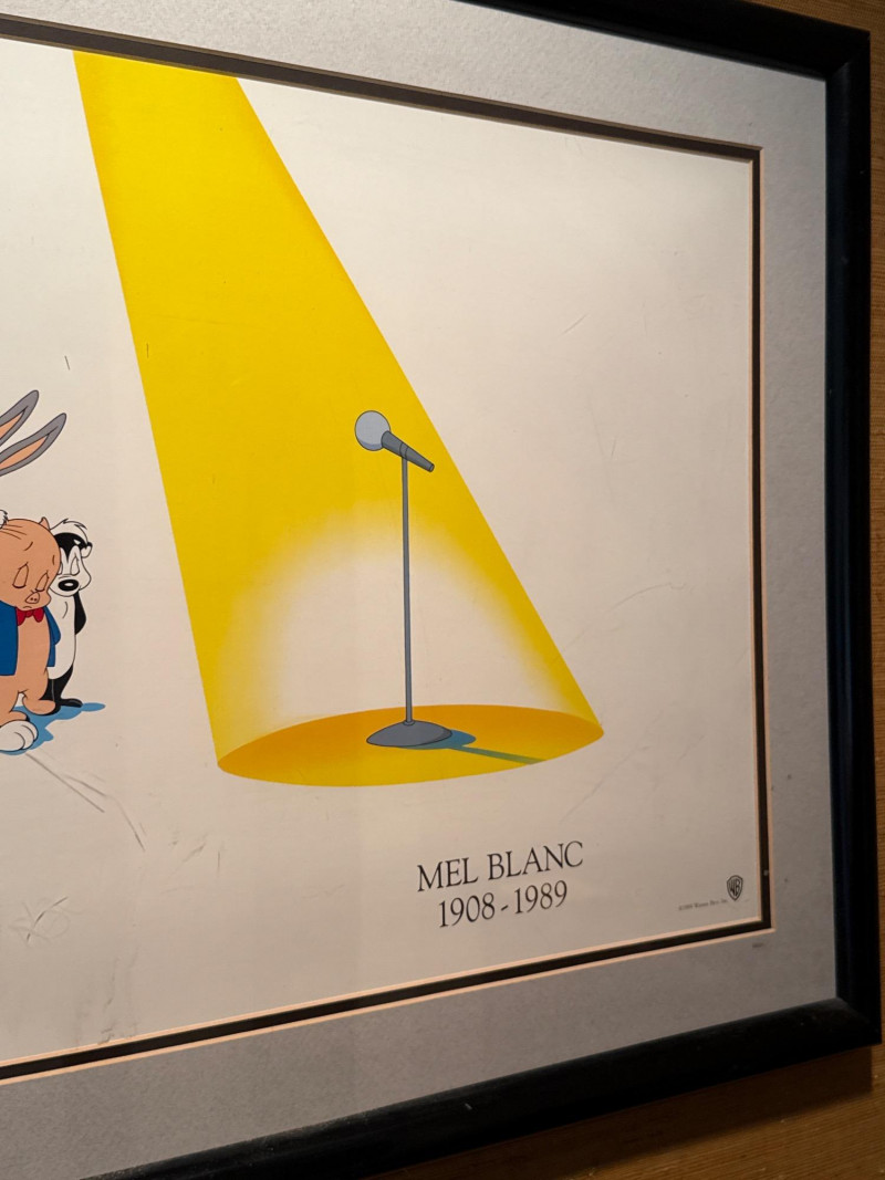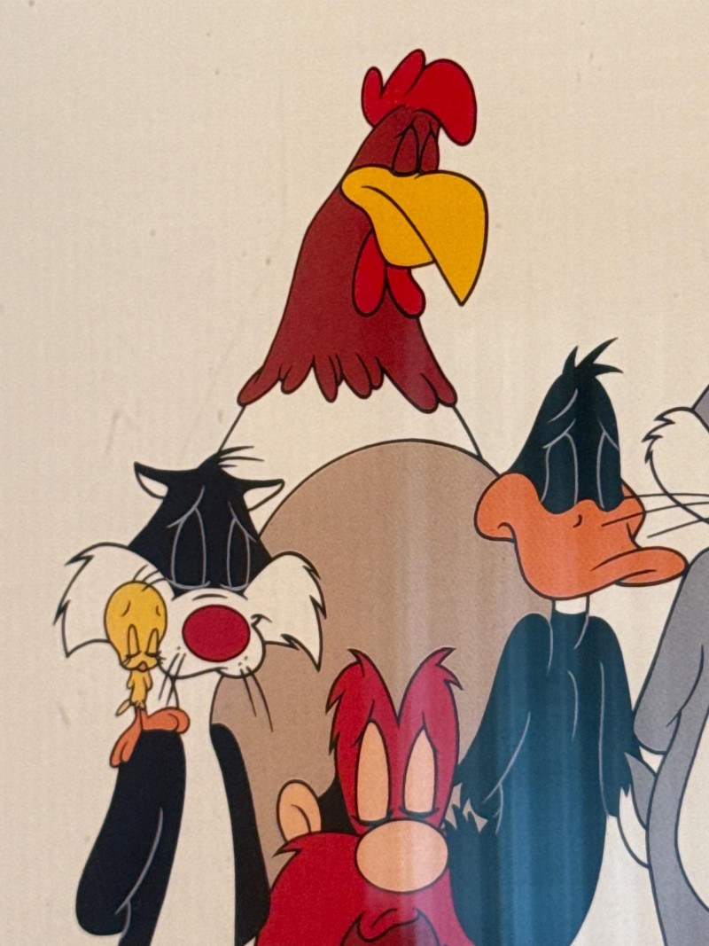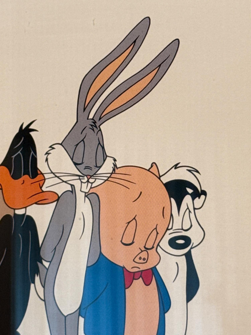 This beautifully framed Warner Bros. animation art cel titled “Speechless” is a heartfelt tribute to the legendary Mel Blanc, the voice behind iconic characters such as Bugs Bunny, Daffy Duck, Porky Pig, Sylvester, Tweety, and more. Originally released in 1989, the year of Blanc’s passing, this piece poignantly captures the beloved Looney Tunes characters standing in solemn silence before a spotlighted microphone—an emotional nod to the silenced voice of animation’s greatest legend. Artwork Title: “Speechless” Dimensions: 31 inches long x 21.5 inches tall Studio: Warner Bros. Copyright: ©1989 Warner Bros. Inc. Framing: Black frame with grey matte and protective plexiglass cover Original Retail Tag Still Attached: $150.00