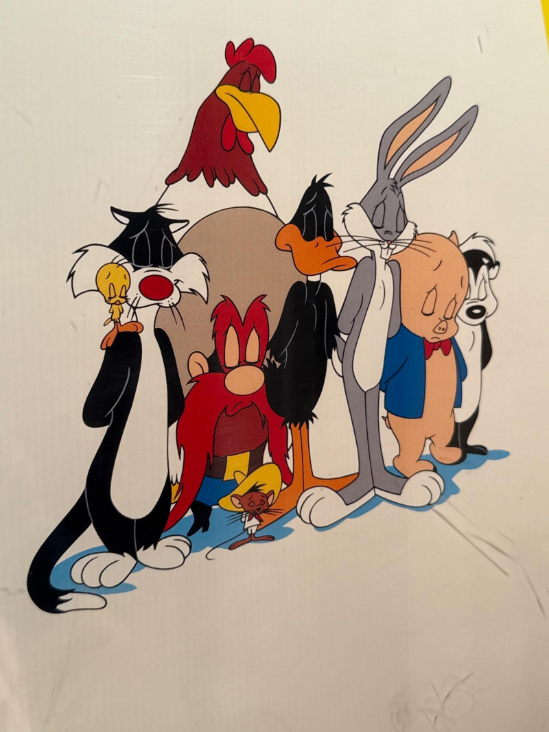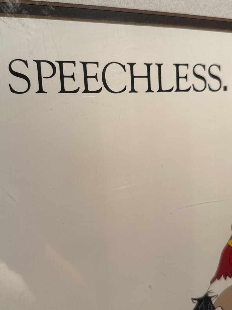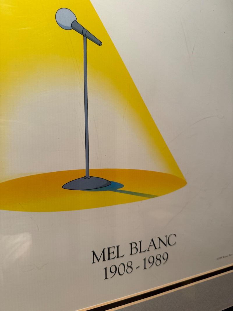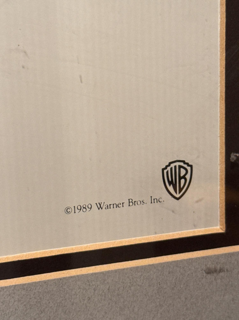This beautifully framed Warner Bros. animation art cel titled “Speechless” is a heartfelt tribute to the legendary Mel Blanc, the voice behind iconic characters such as Bugs Bunny, Daffy Duck, Porky Pig, Sylvester, Tweety, and more. Originally released in 1989, the year of Blanc’s passing, this piece poignantly captures the beloved Looney Tunes characters standing in solemn silence before a spotlighted microphone—an emotional nod to the silenced voice of animation’s greatest legend. Artwork Title: “Speechless” Dimensions: 31 inches long x 21.5 inches tall Studio: Warner Bros. Copyright: ©1989 Warner Bros. Inc. Framing: Black frame with grey matte and protective plexiglass cover Original Retail Tag Still Attached: $150.00