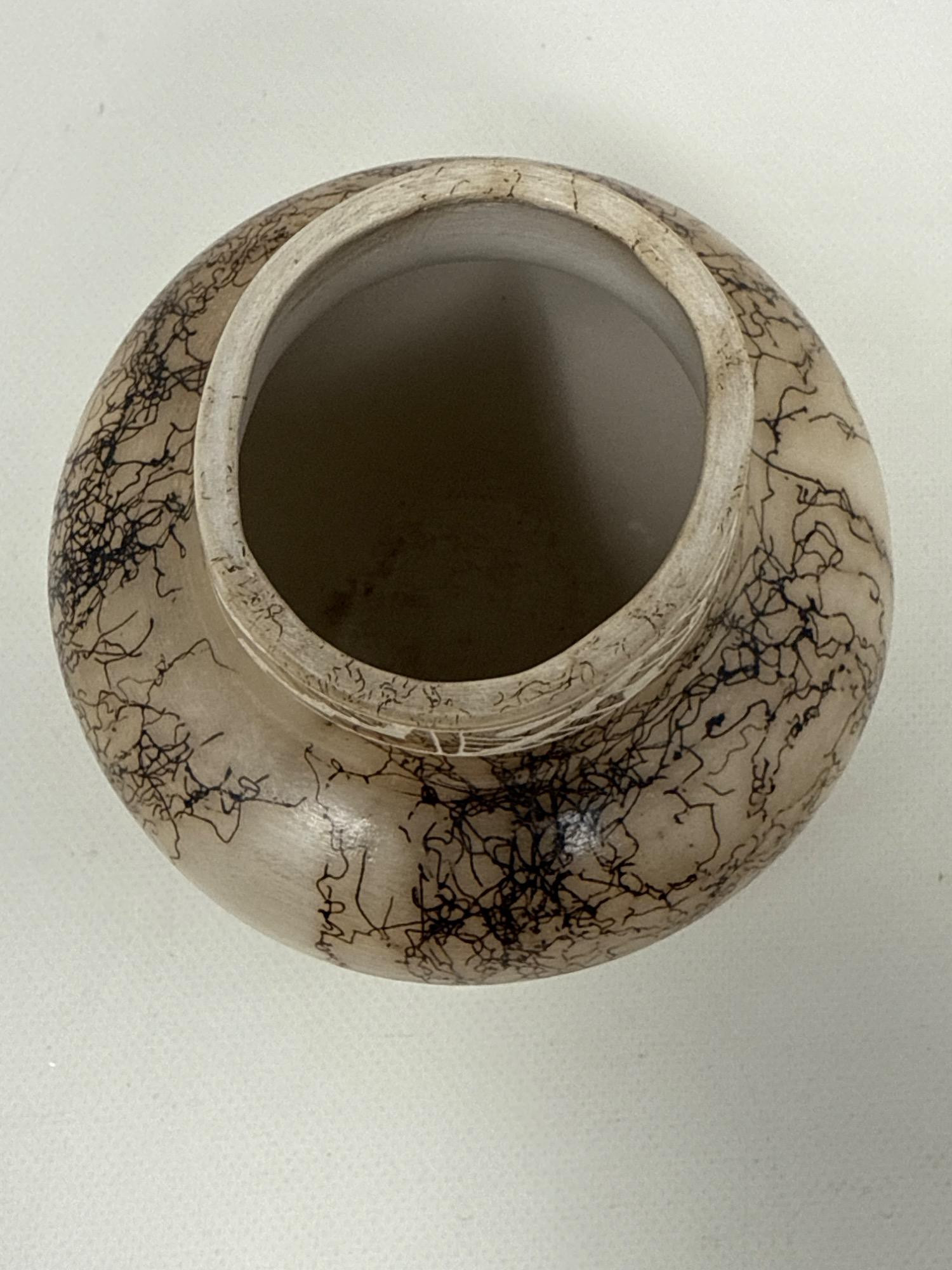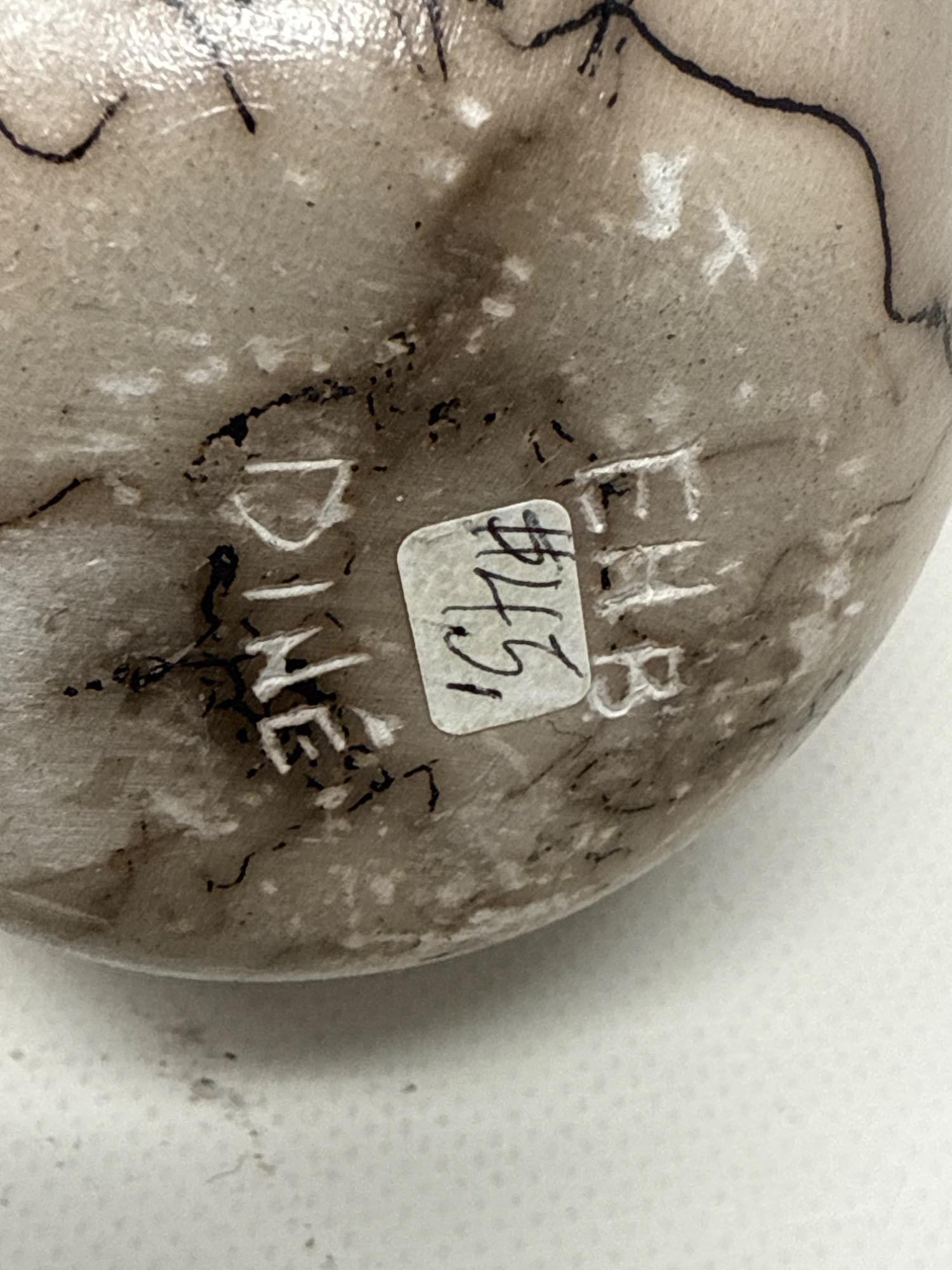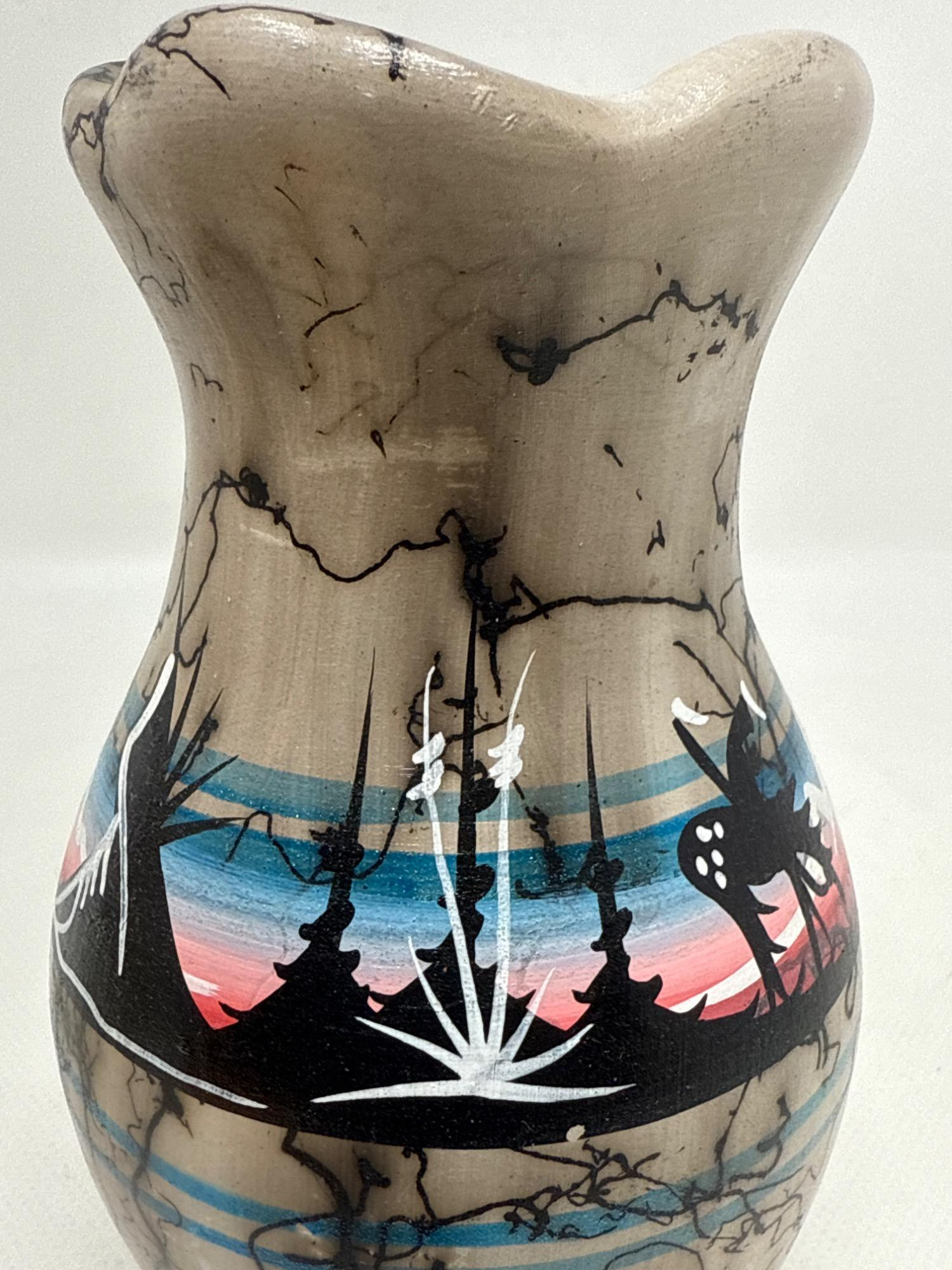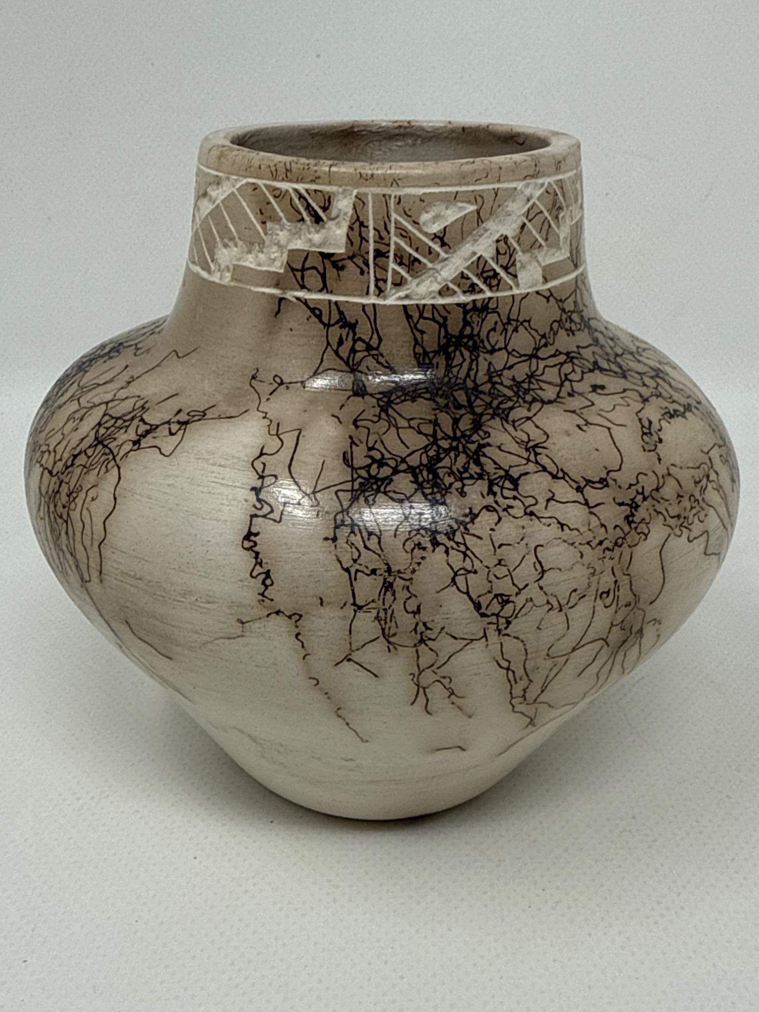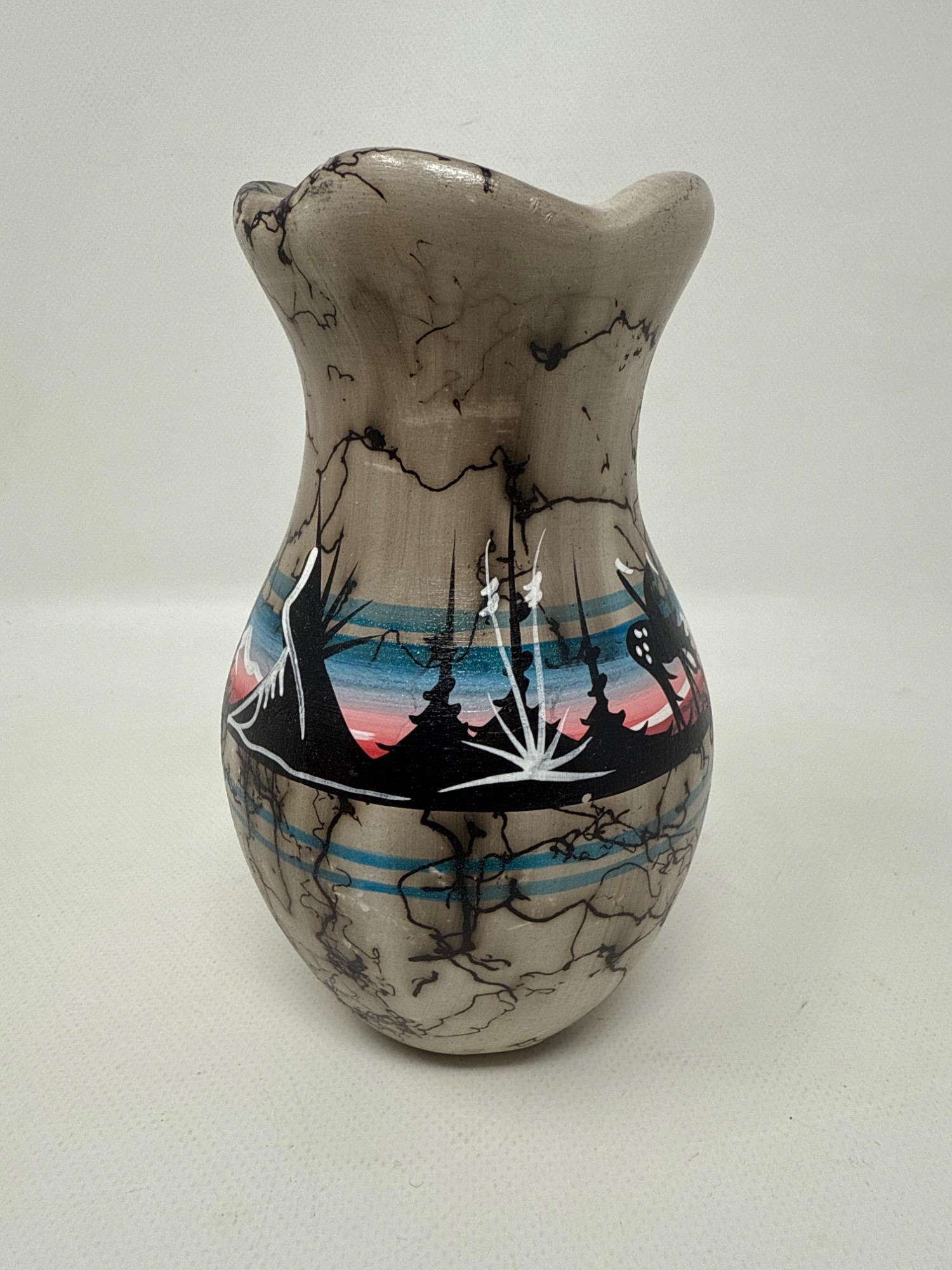 This collectible set includes two signed Navajo-style horsehair pottery vases, each created using the traditional horsehair firing technique. Real horsehair is applied to hot ceramic, burning delicate black veining into the surface and giving each piece a natural, smoky finish. These vases are true one-of-a-kind artworks that reflect the spirit of the Southwest. Set Includes: Vase 1 (signed “Vail SR”): Vase 2 (etched “Diné EHB”):