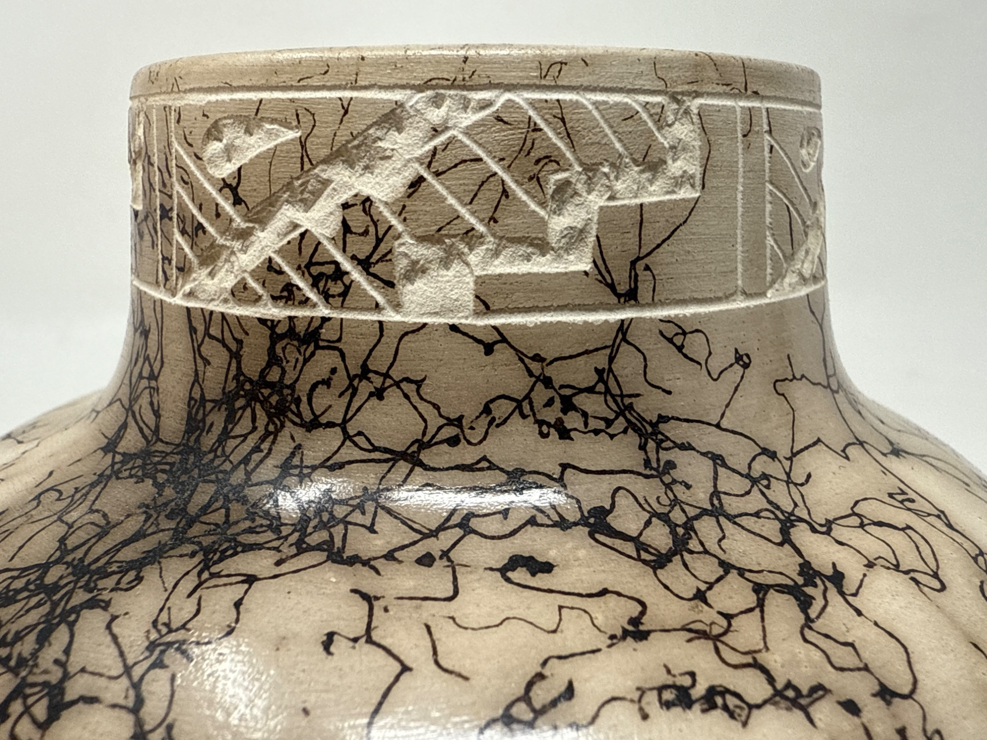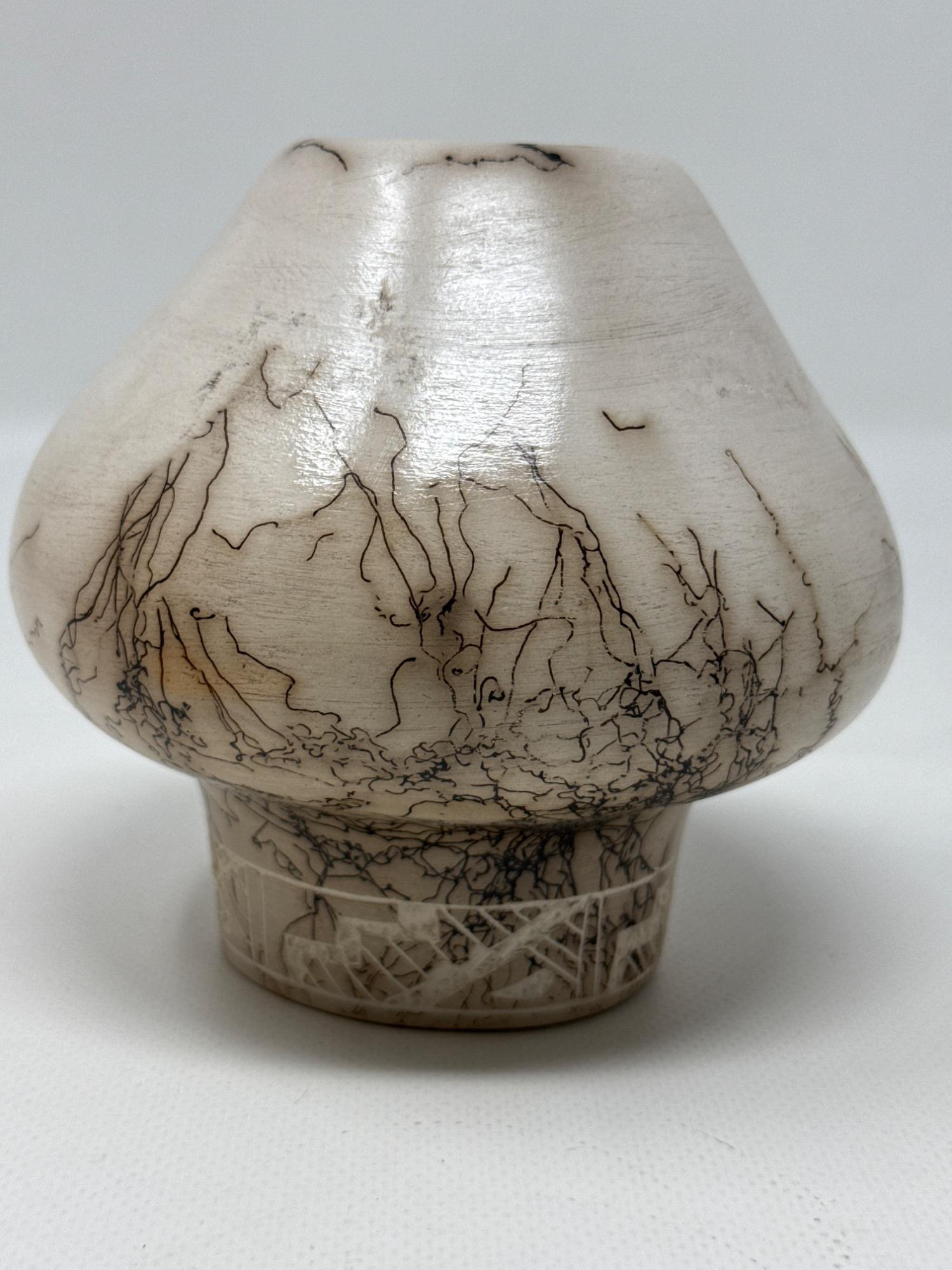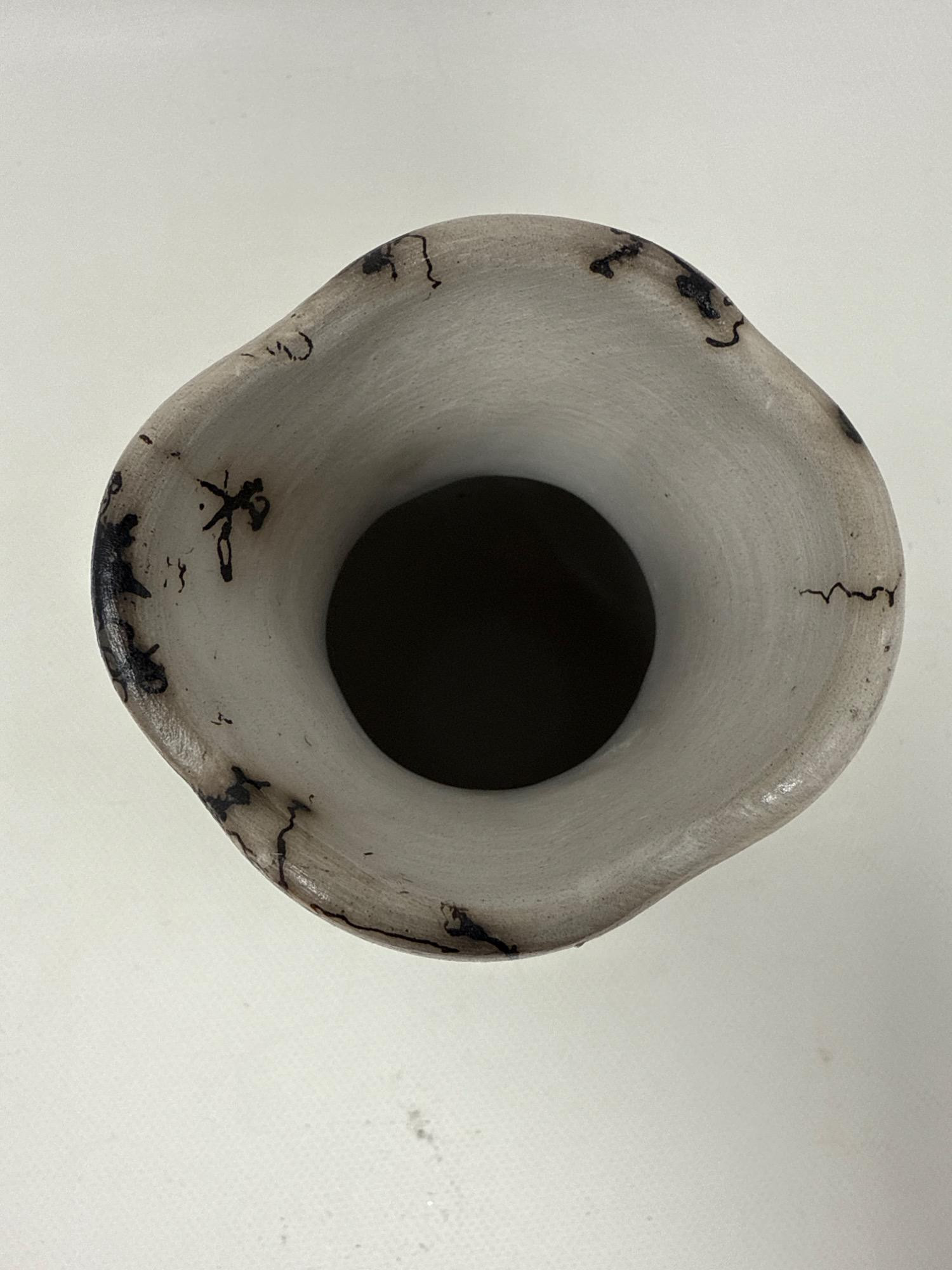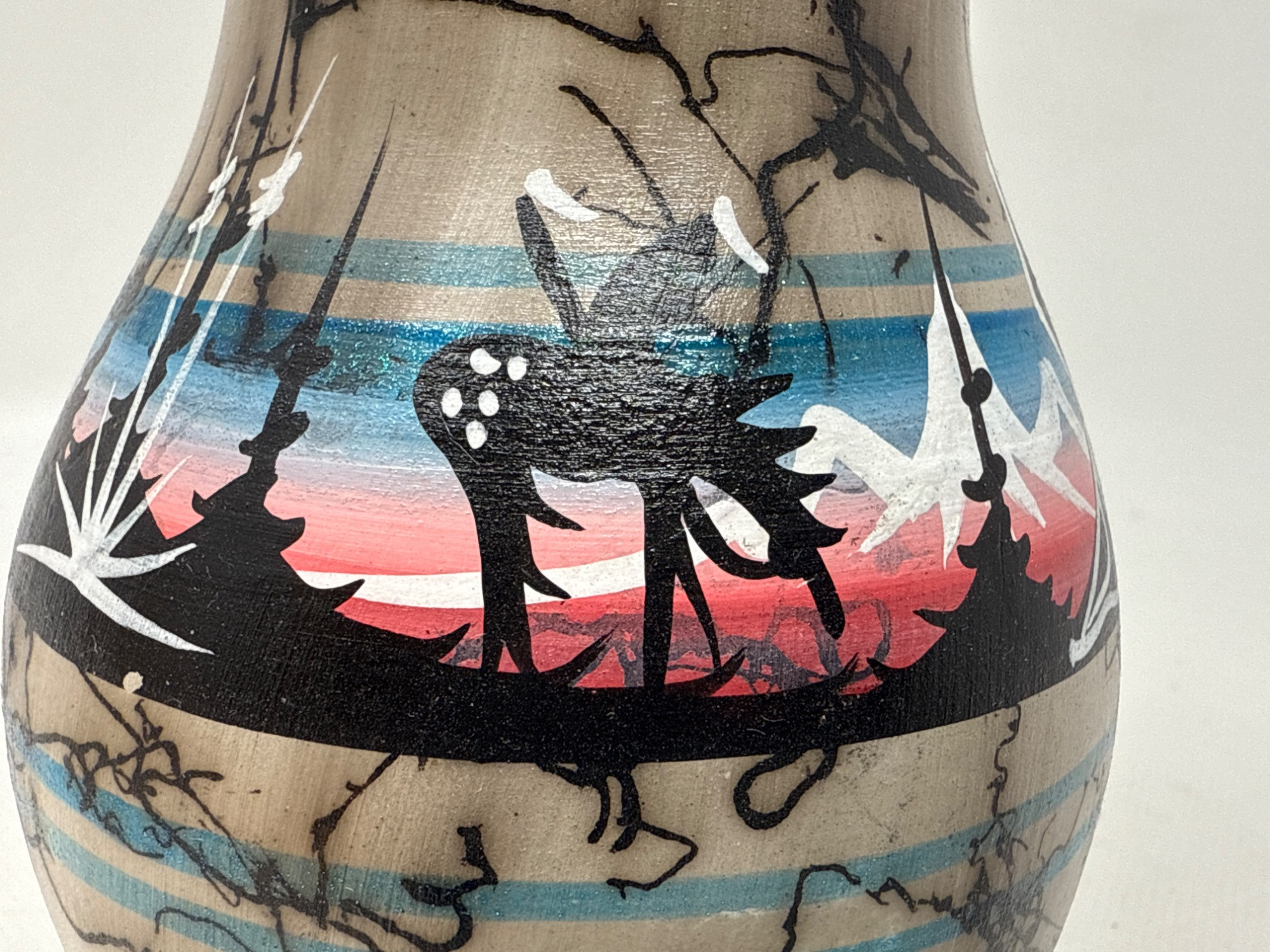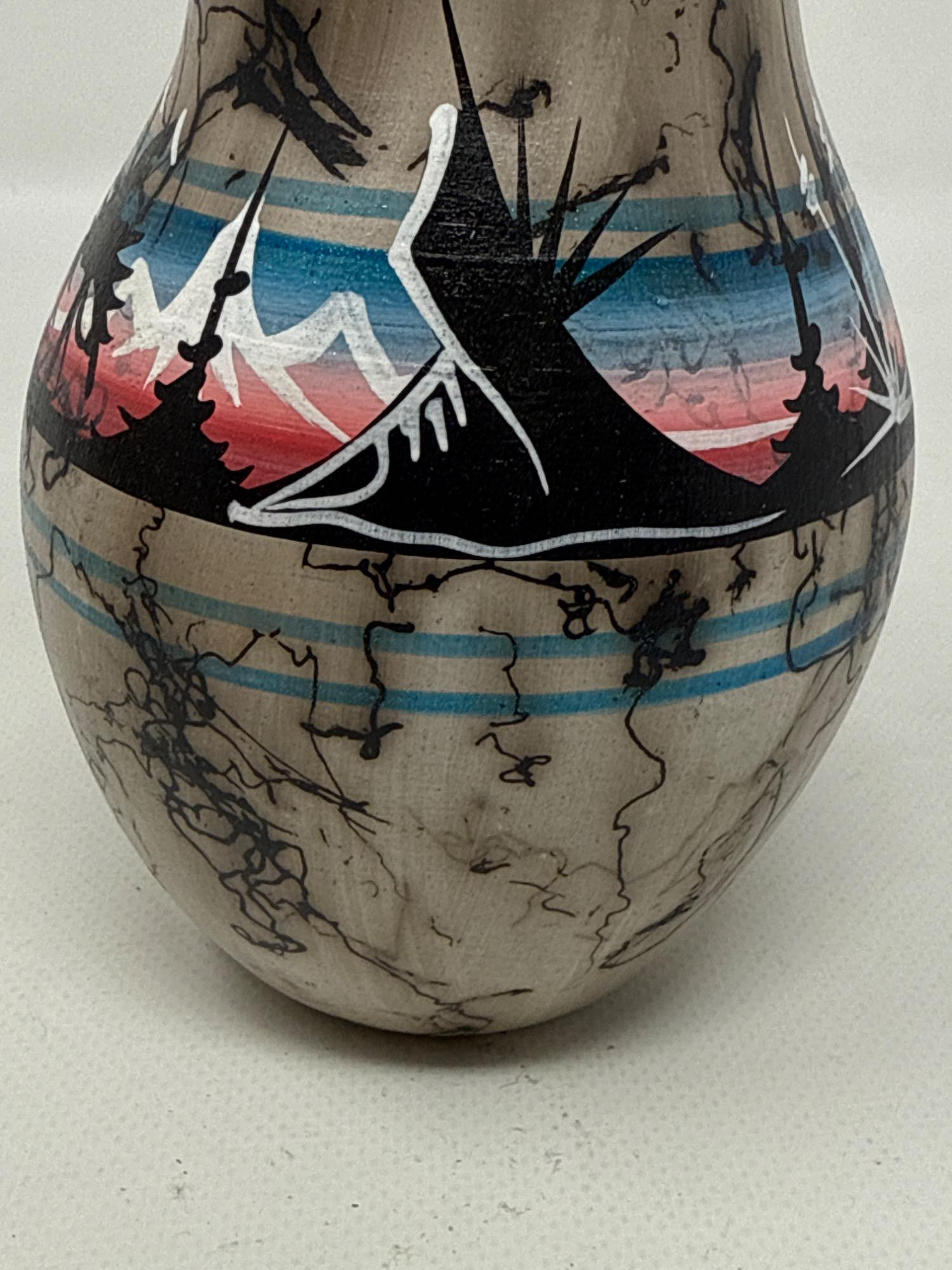 This collectible set includes two signed Navajo-style horsehair pottery vases, each created using the traditional horsehair firing technique. Real horsehair is applied to hot ceramic, burning delicate black veining into the surface and giving each piece a natural, smoky finish. These vases are true one-of-a-kind artworks that reflect the spirit of the Southwest. Set Includes: Vase 1 (signed “Vail SR”): Vase 2 (etched “Diné EHB”):