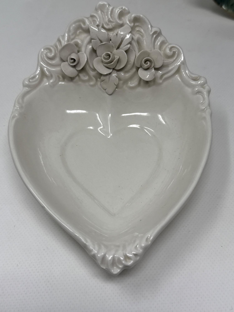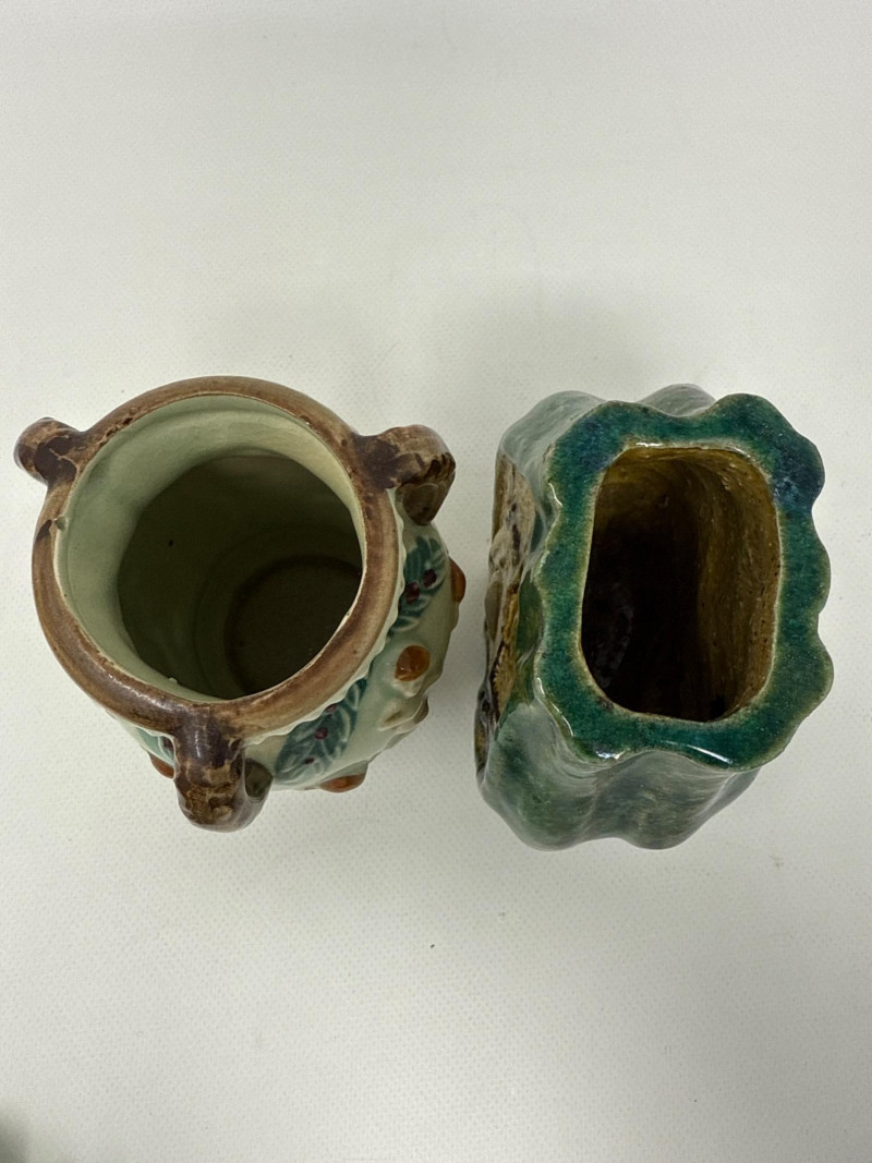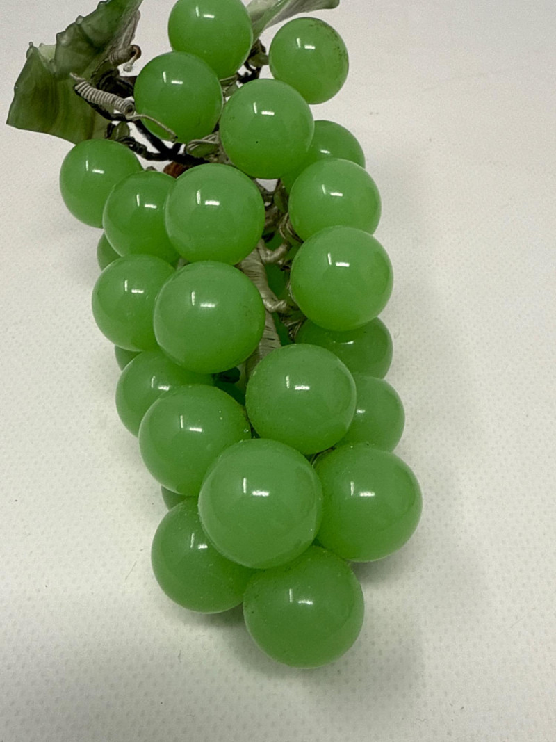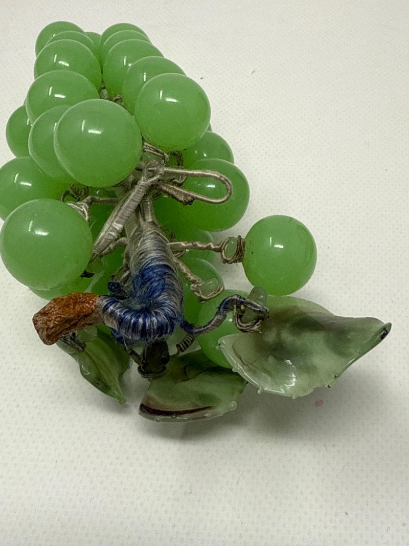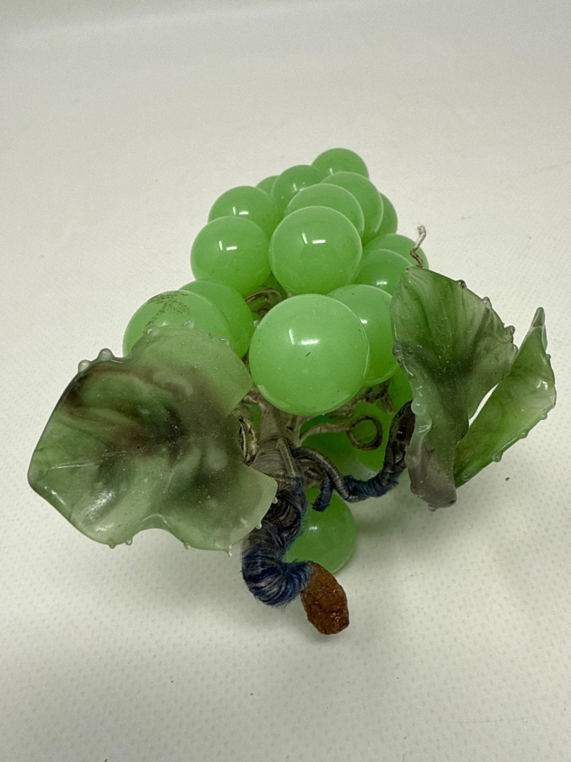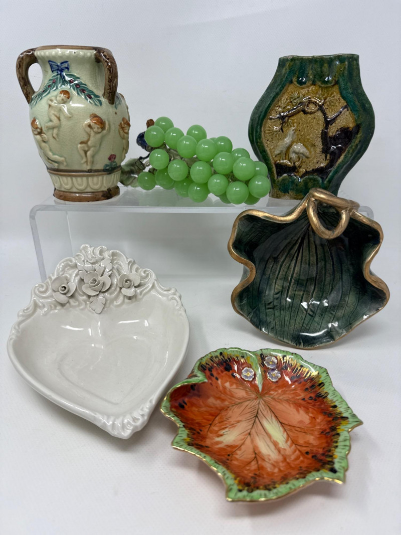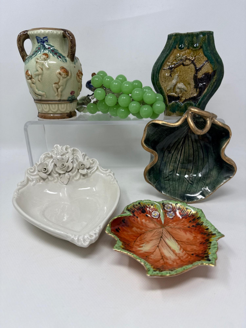 This charming collection includes: A stunning cluster of vintage jade grapes, intricately wired and accented with detailed glass leaves and a wrapped stem. Two decorative ceramic vases – one featuring cherubs and a bow motif (marked Made in Japan), and the other with a raised scenic design in deep green and earthy tones. Three unique ceramic bowls in various shapes and glaze finishes, including: A white heart-shaped bowl with intricate floral relief (marked Made in Italy) A leaf-shaped orange and green dish (marked Sakura China, Japan) A scallop-edged green dish with gold trim