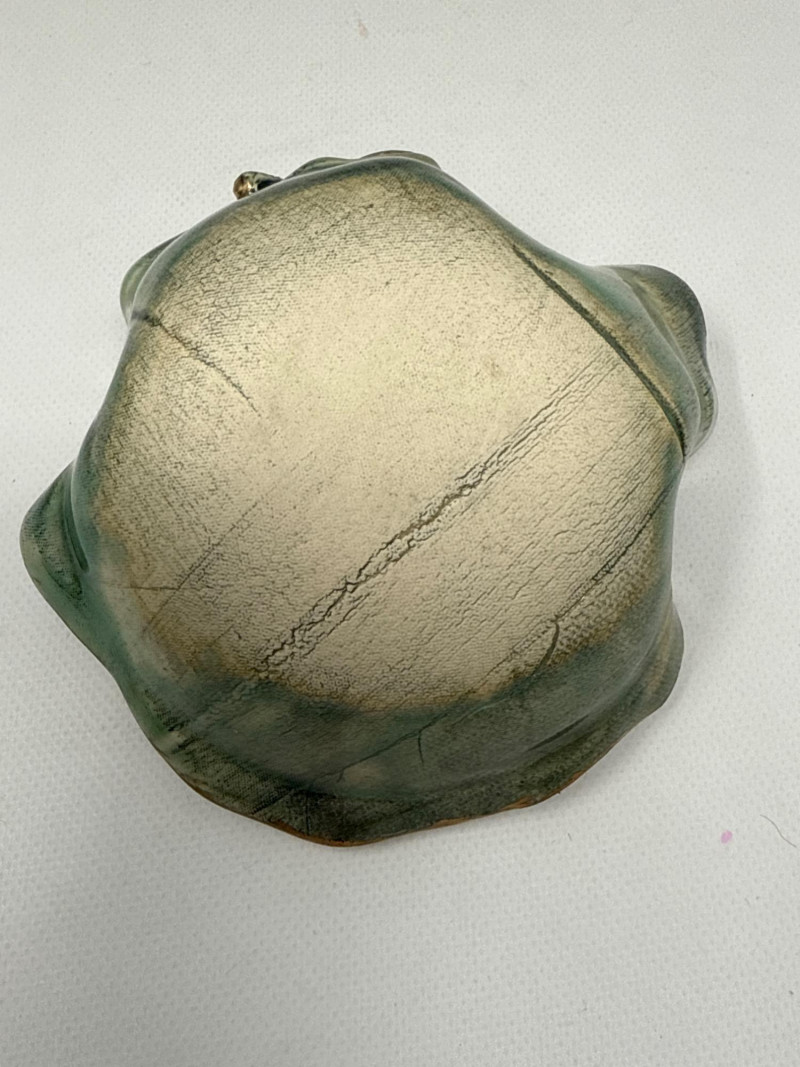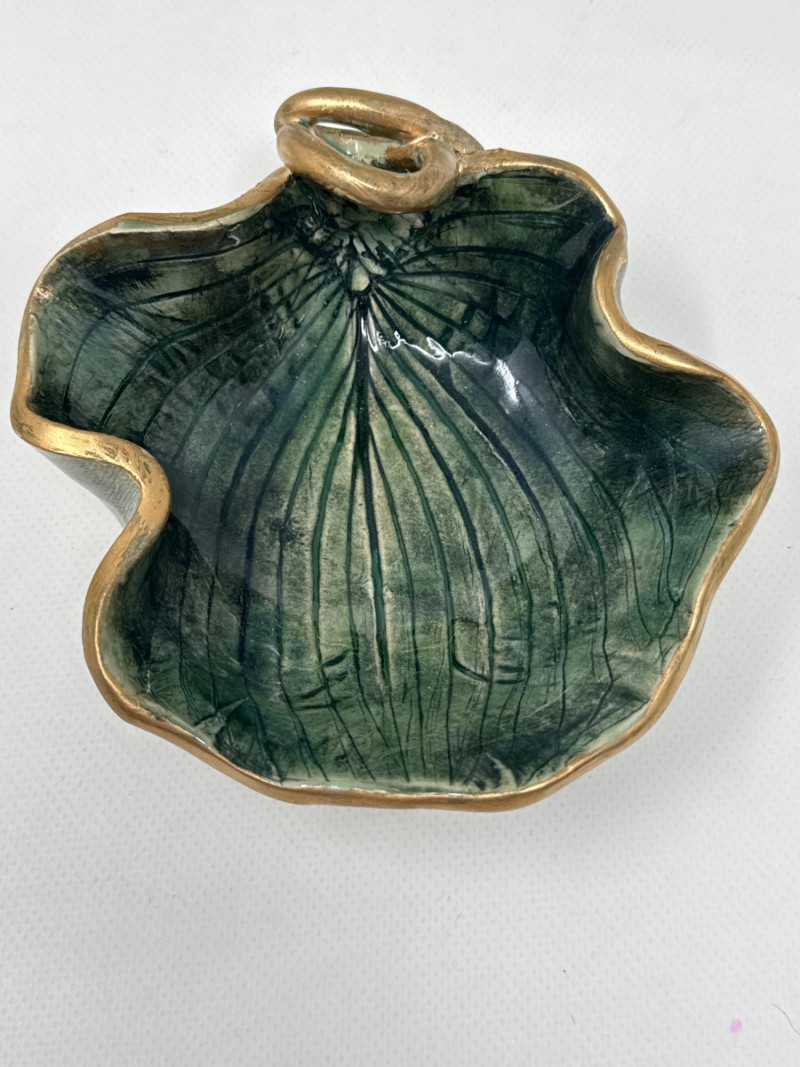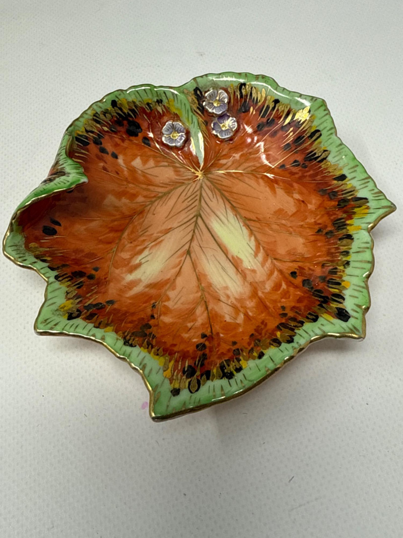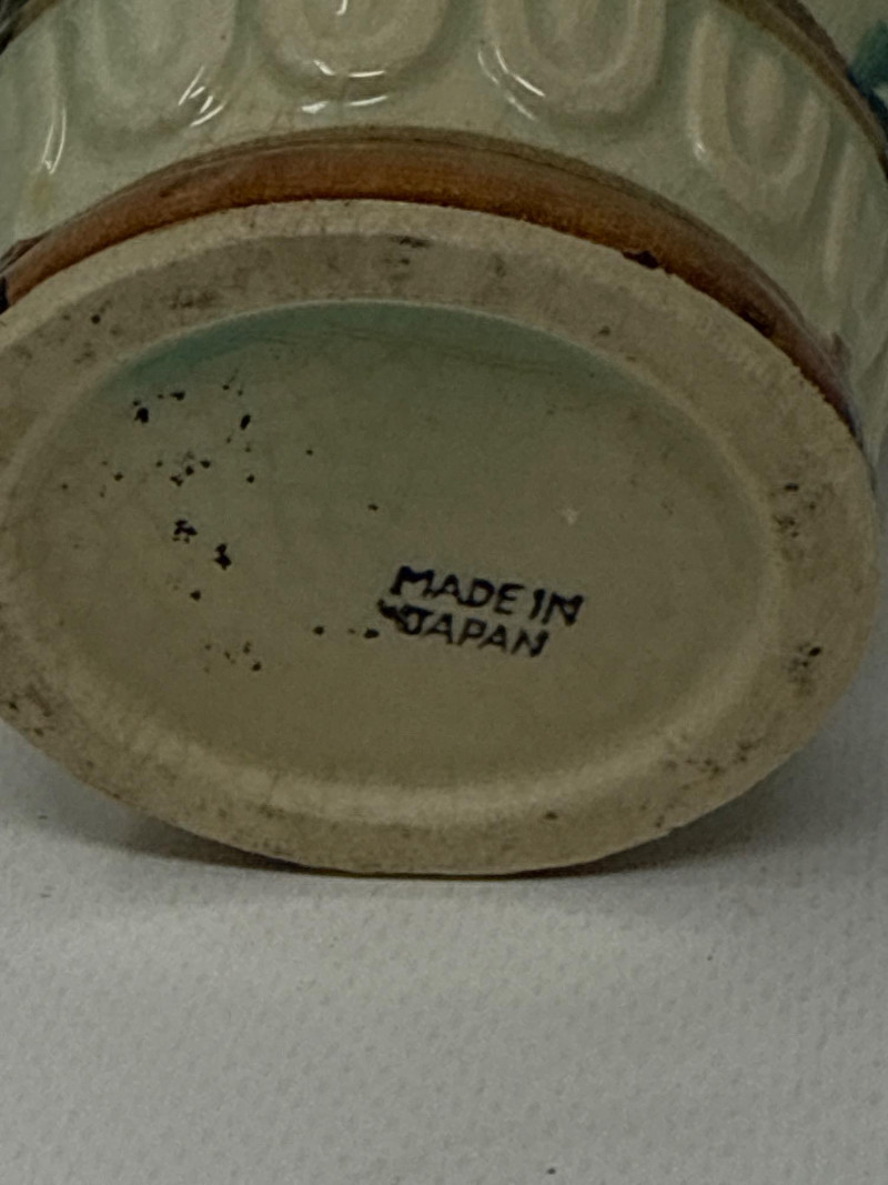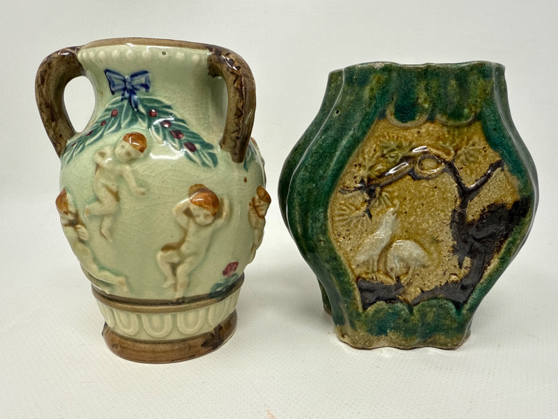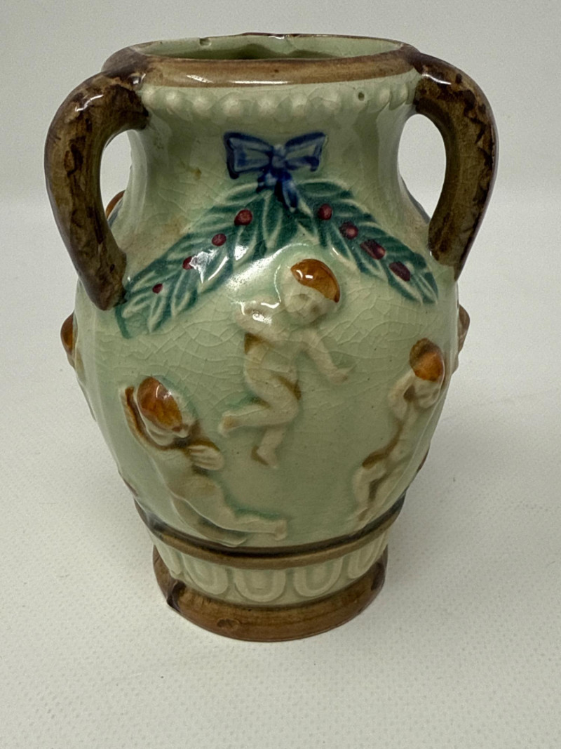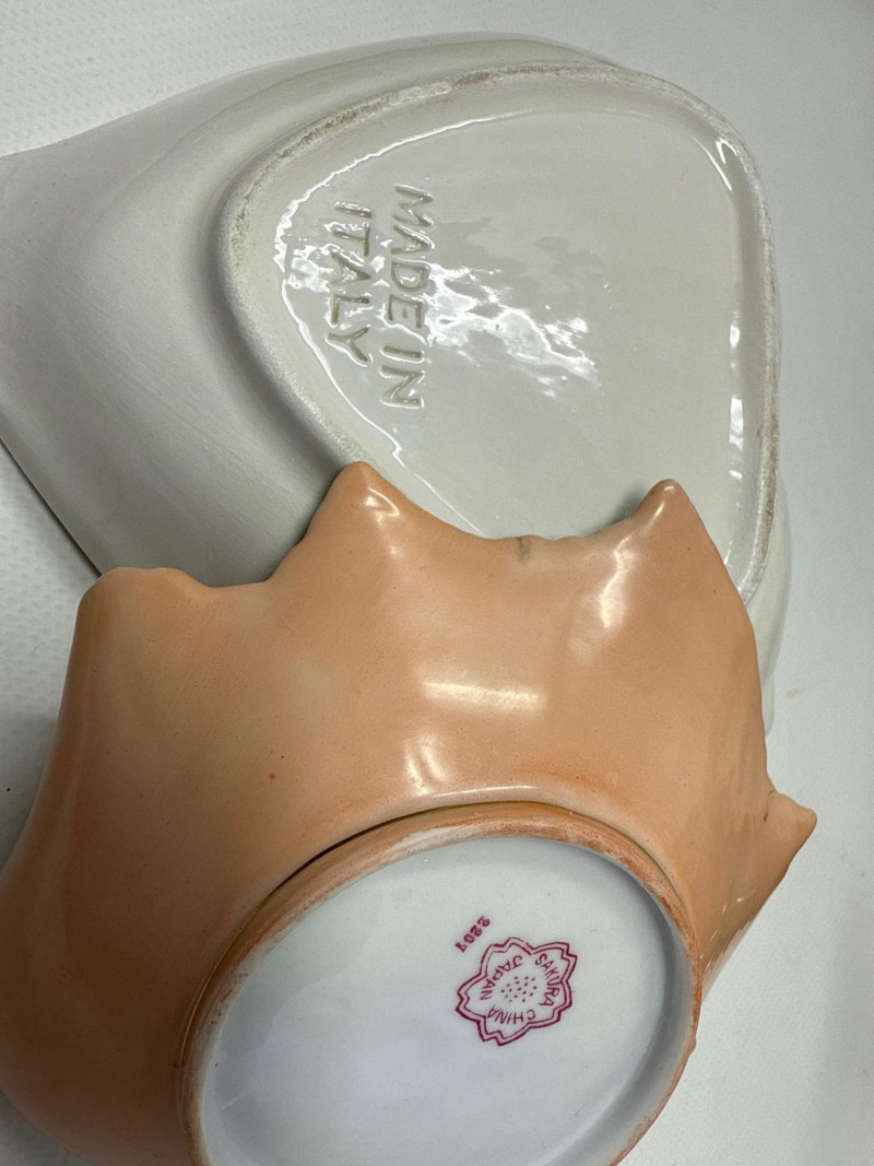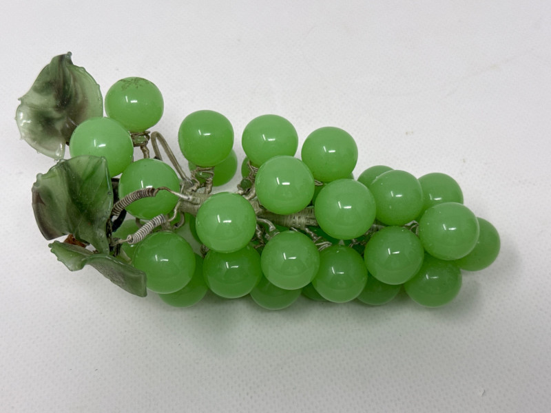 This charming collection includes: A stunning cluster of vintage jade grapes, intricately wired and accented with detailed glass leaves and a wrapped stem. Two decorative ceramic vases – one featuring cherubs and a bow motif (marked Made in Japan), and the other with a raised scenic design in deep green and earthy tones. Three unique ceramic bowls in various shapes and glaze finishes, including: A white heart-shaped bowl with intricate floral relief (marked Made in Italy) A leaf-shaped orange and green dish (marked Sakura China, Japan) A scallop-edged green dish with gold trim
