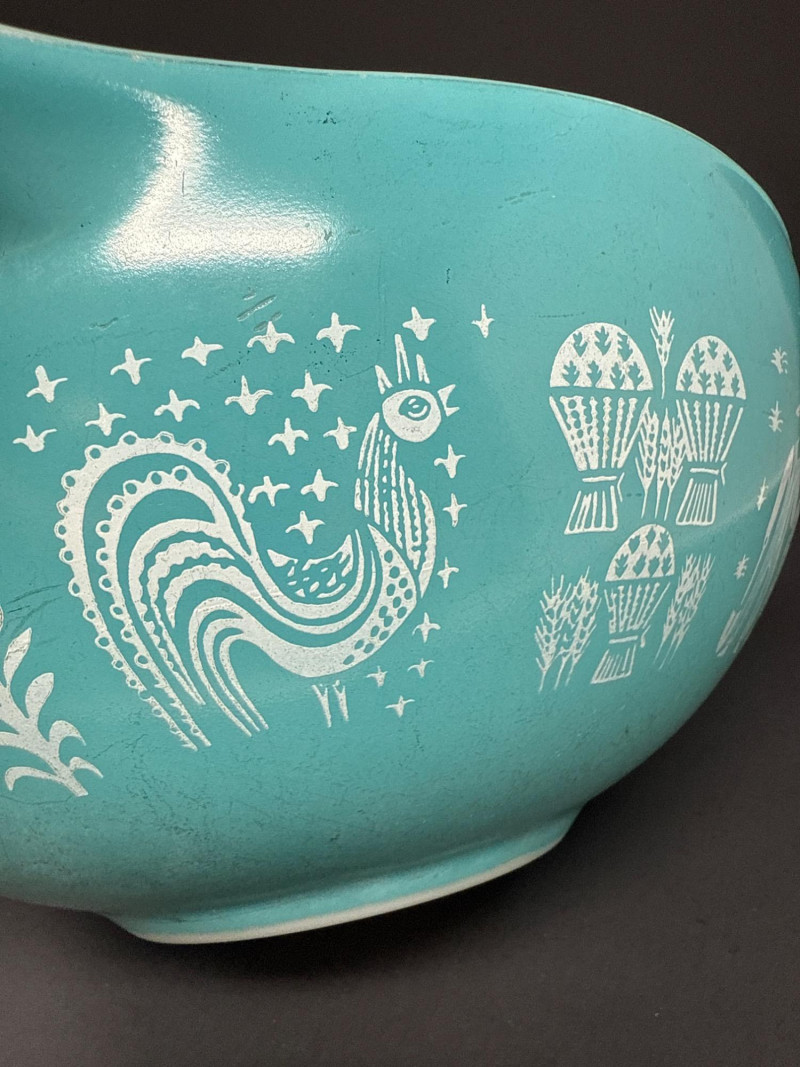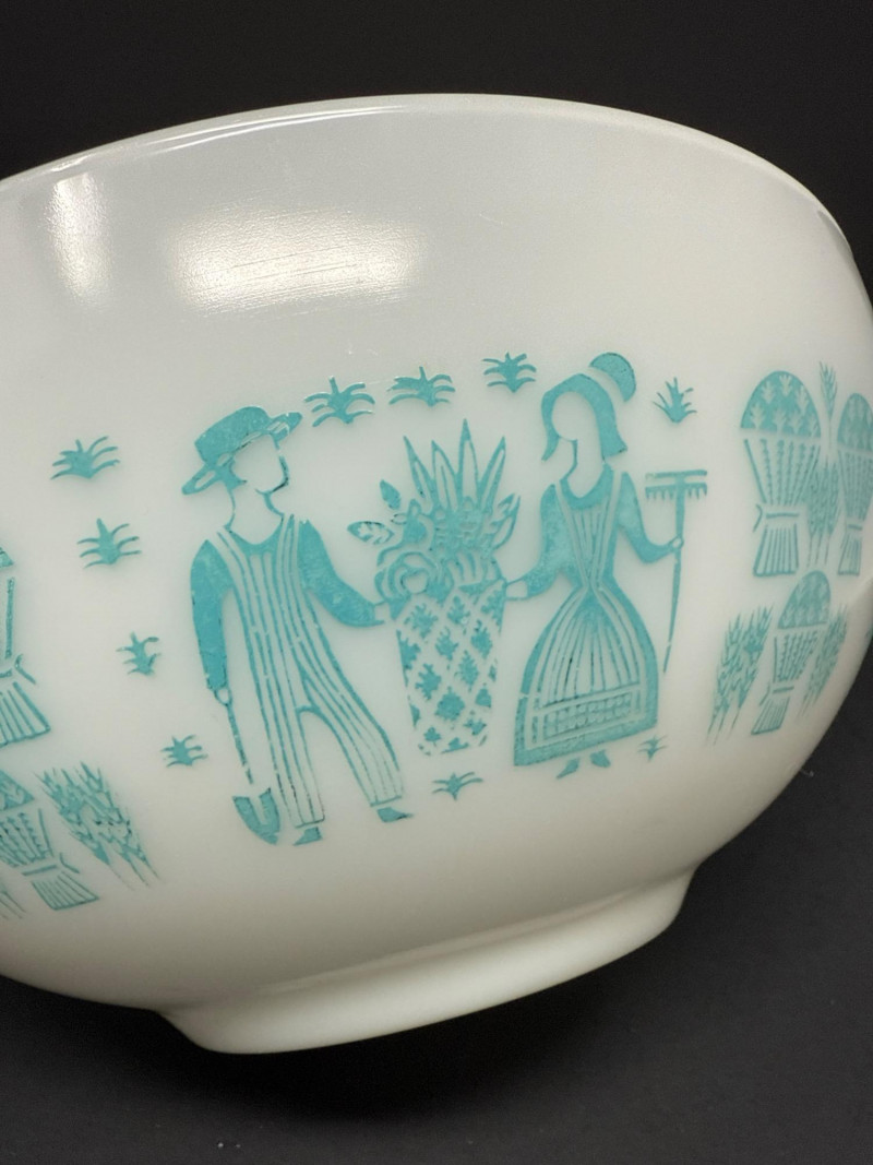 Charming set of vintage Pyrex nesting bowls in the iconic teal and white Amish Butterprint pattern. This collectible set features four handled Cinderella mixing bowls in graduating sizes, known for their vibrant turquoise color and whimsical mid-century farm motif depicting a rooster, wheat sheaves, and traditional figures. Pattern: Amish Butterprint Color: Teal and white Type: Cinderella-style nesting mixing bowls Marked: PYREX, Made in USA Dimensions (largest bowl approx.): 13"L x 10.5"W x 4.25"T