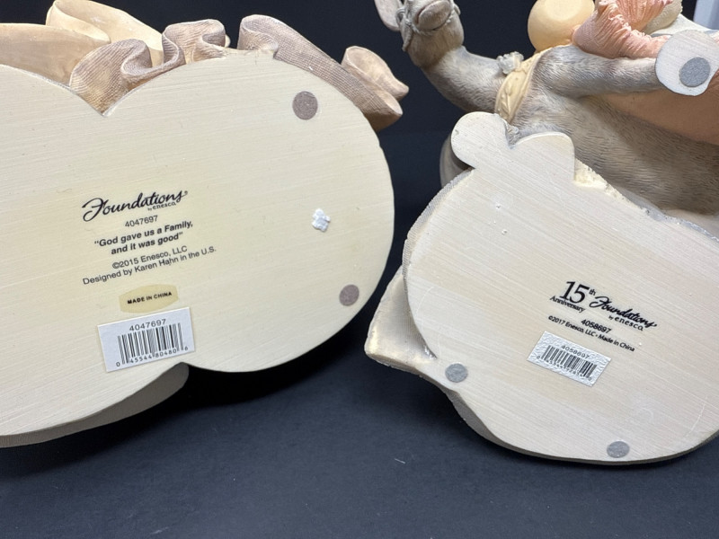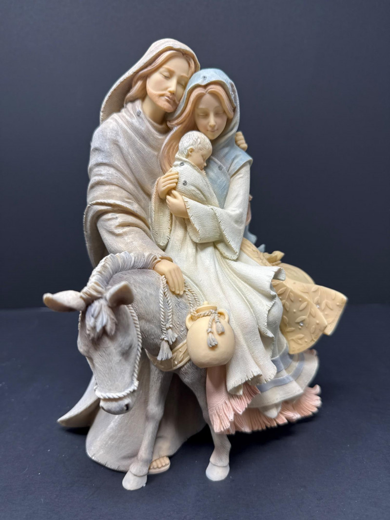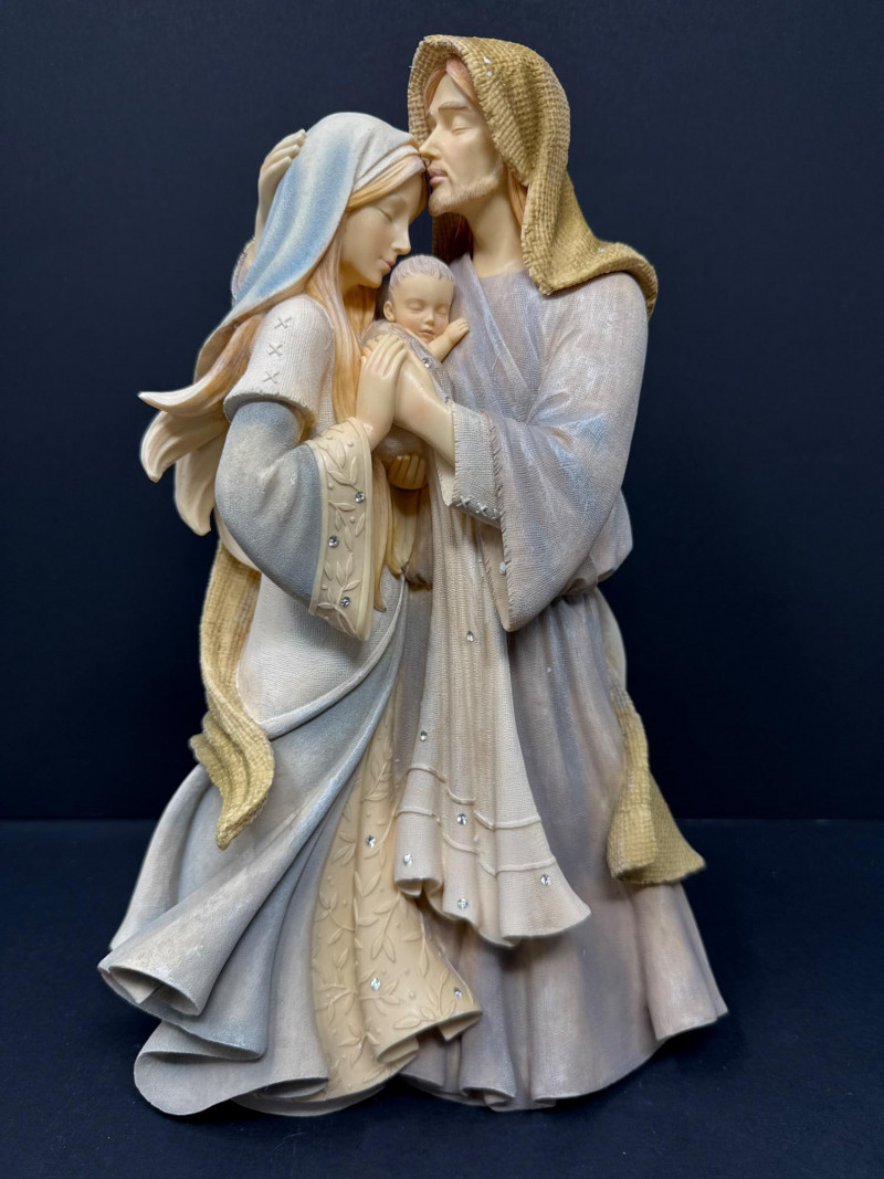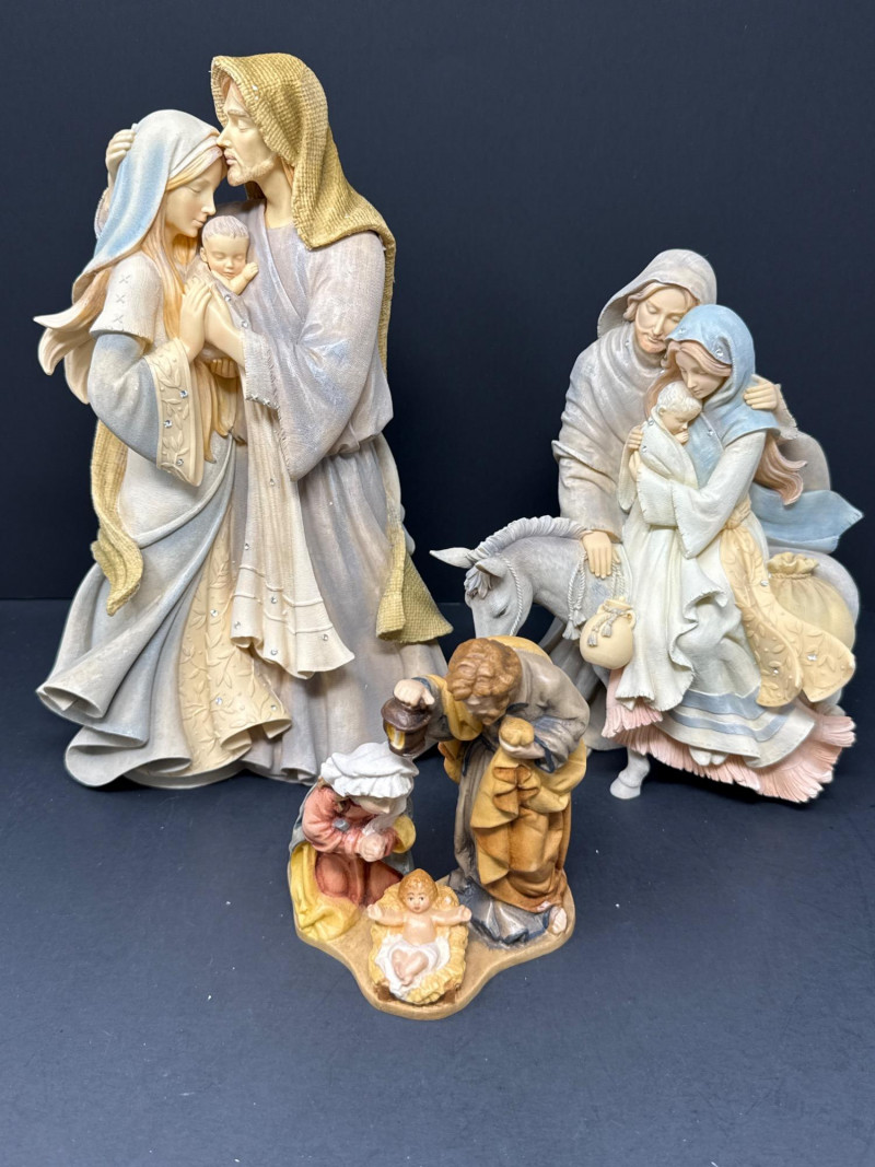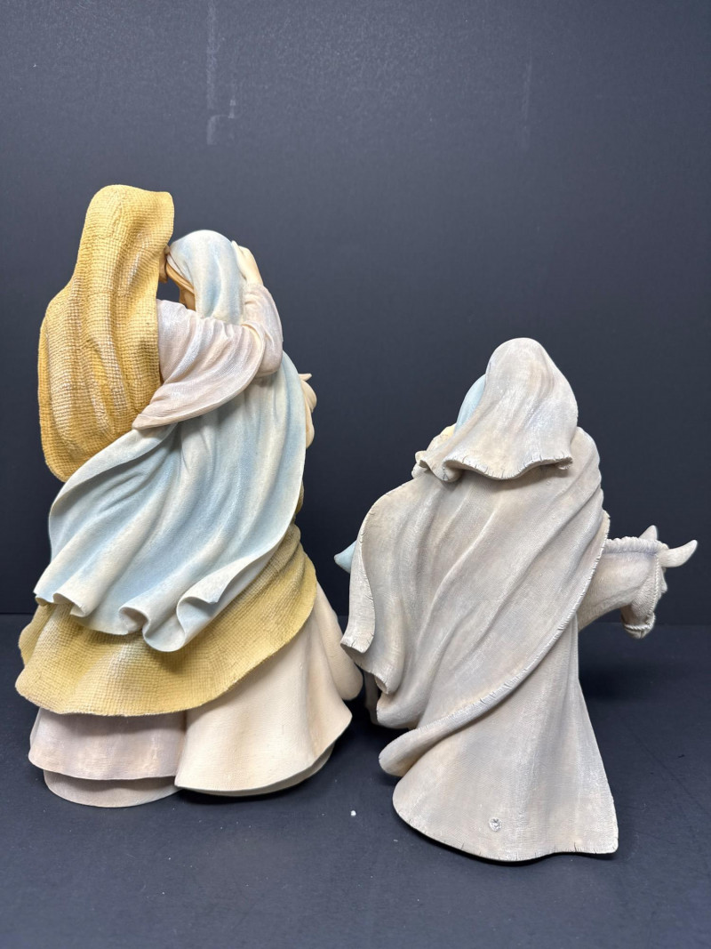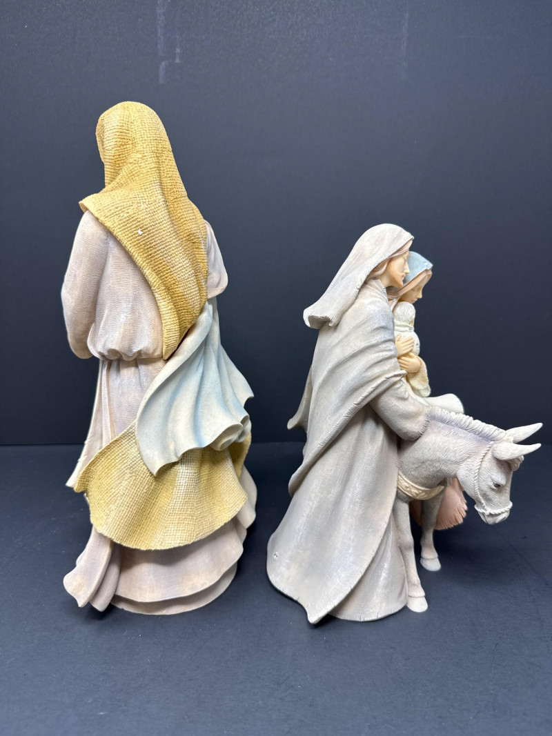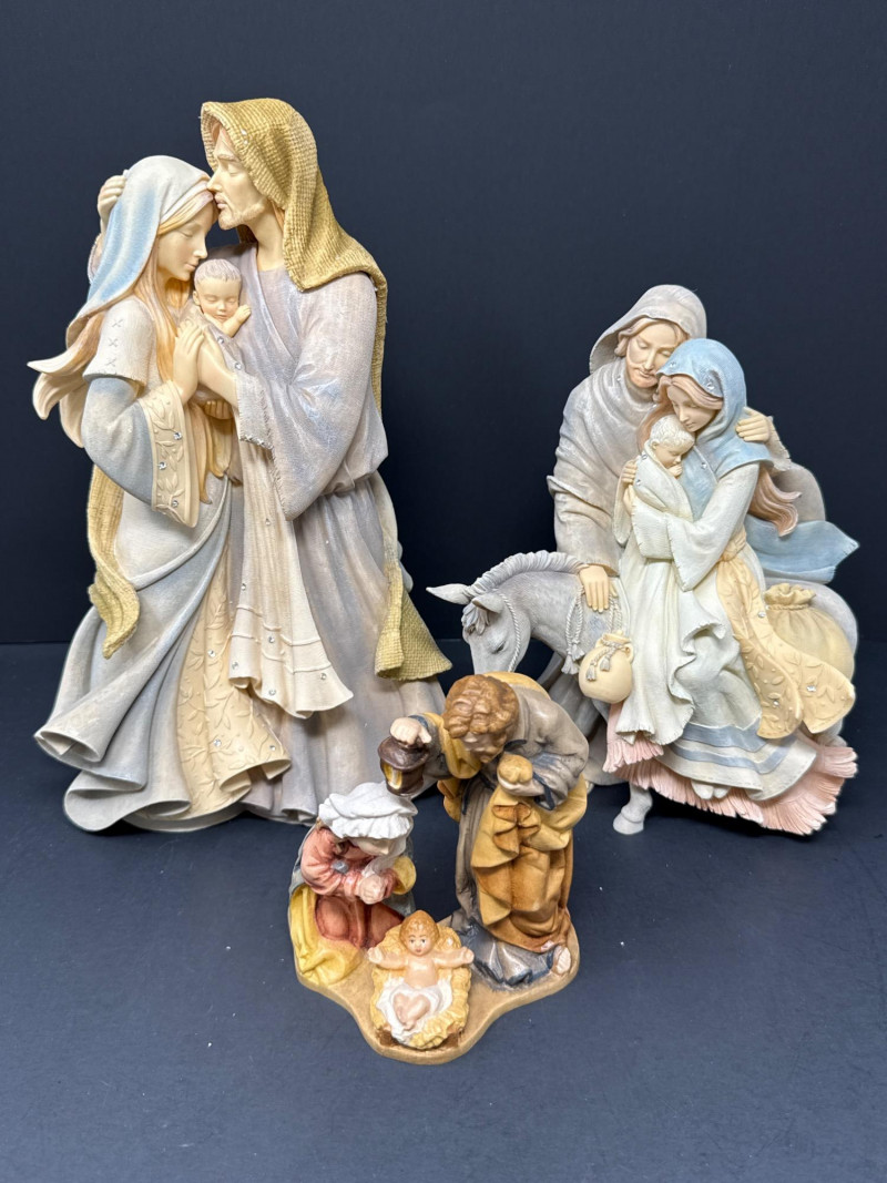 This lot includes three Holy Family figurines by Dolfi (Italy) and Foundations by Enesco (USA), each crafted with delicate detail and spiritual elegance. Set Includes: Foundations by Enesco Figurine (2015, designed by Karen Hahn) Foundations 15th Anniversary Edition Figurine (2017) Dolfi Nativity Figurine Features: Includes all original boxes Material: Resin/stone mix Markings present on bases for authenticity Made in China (Foundations) and Italy (Dolfi)