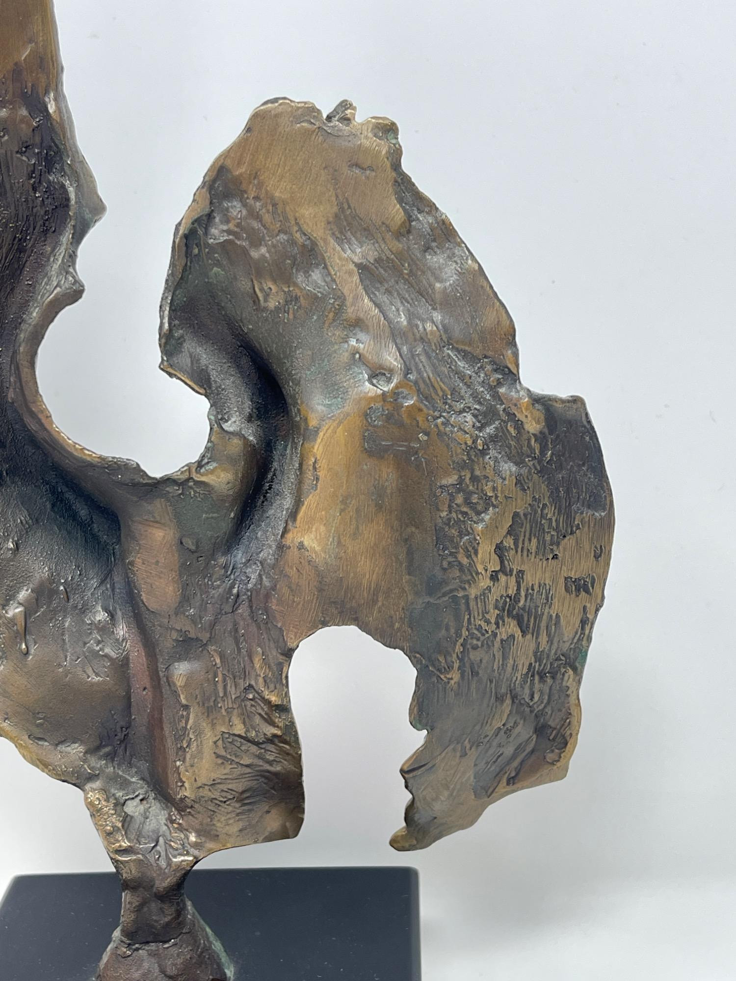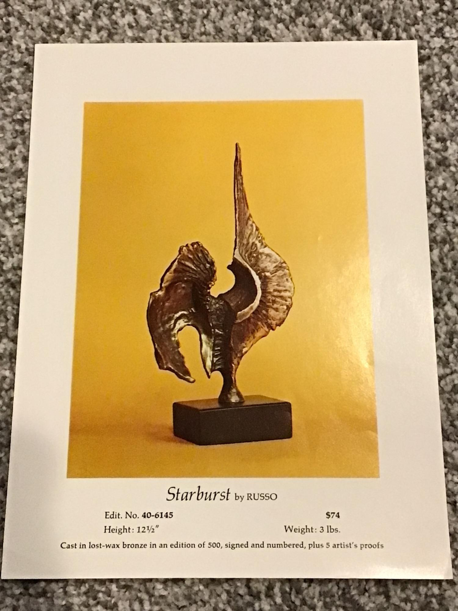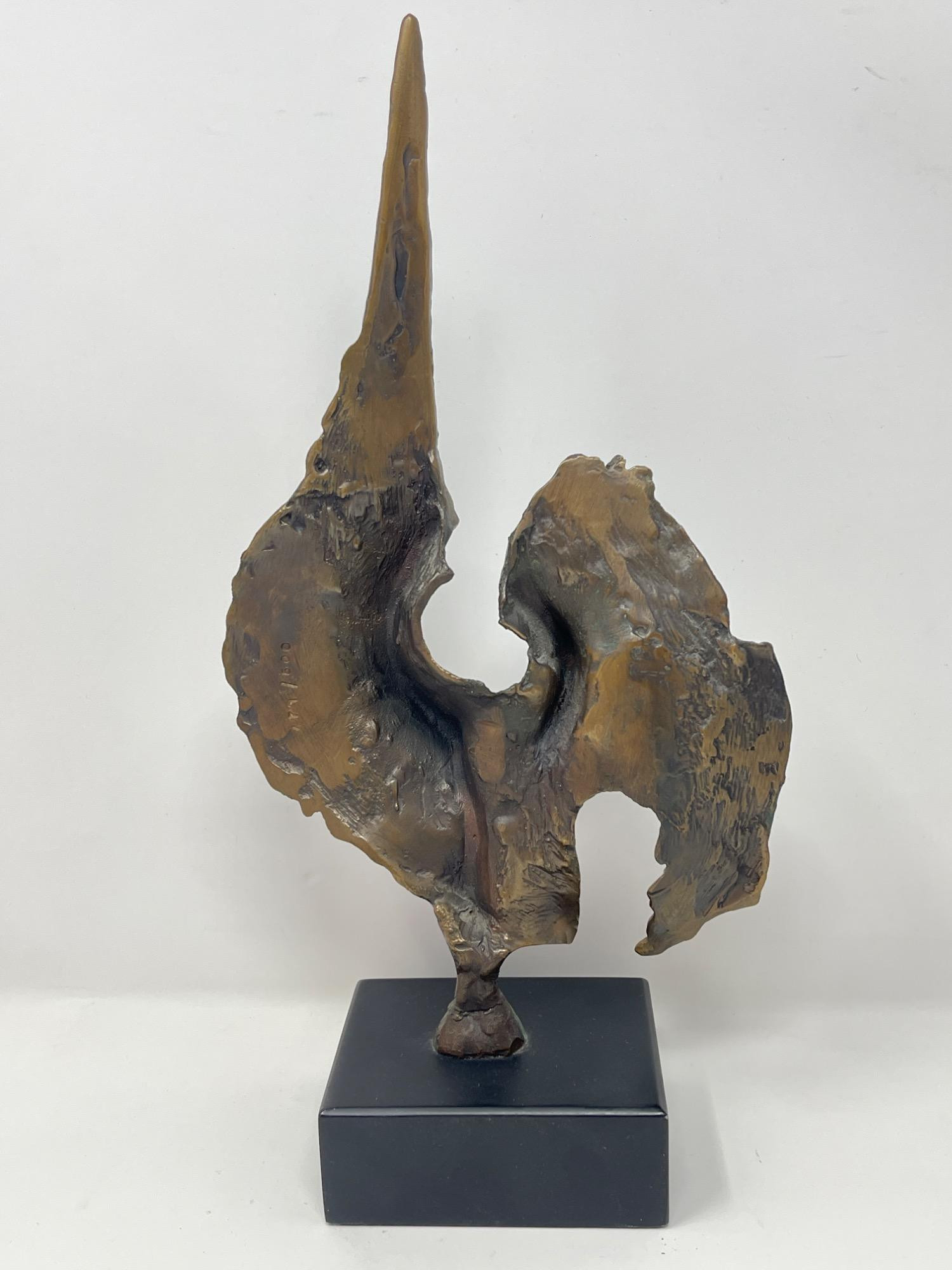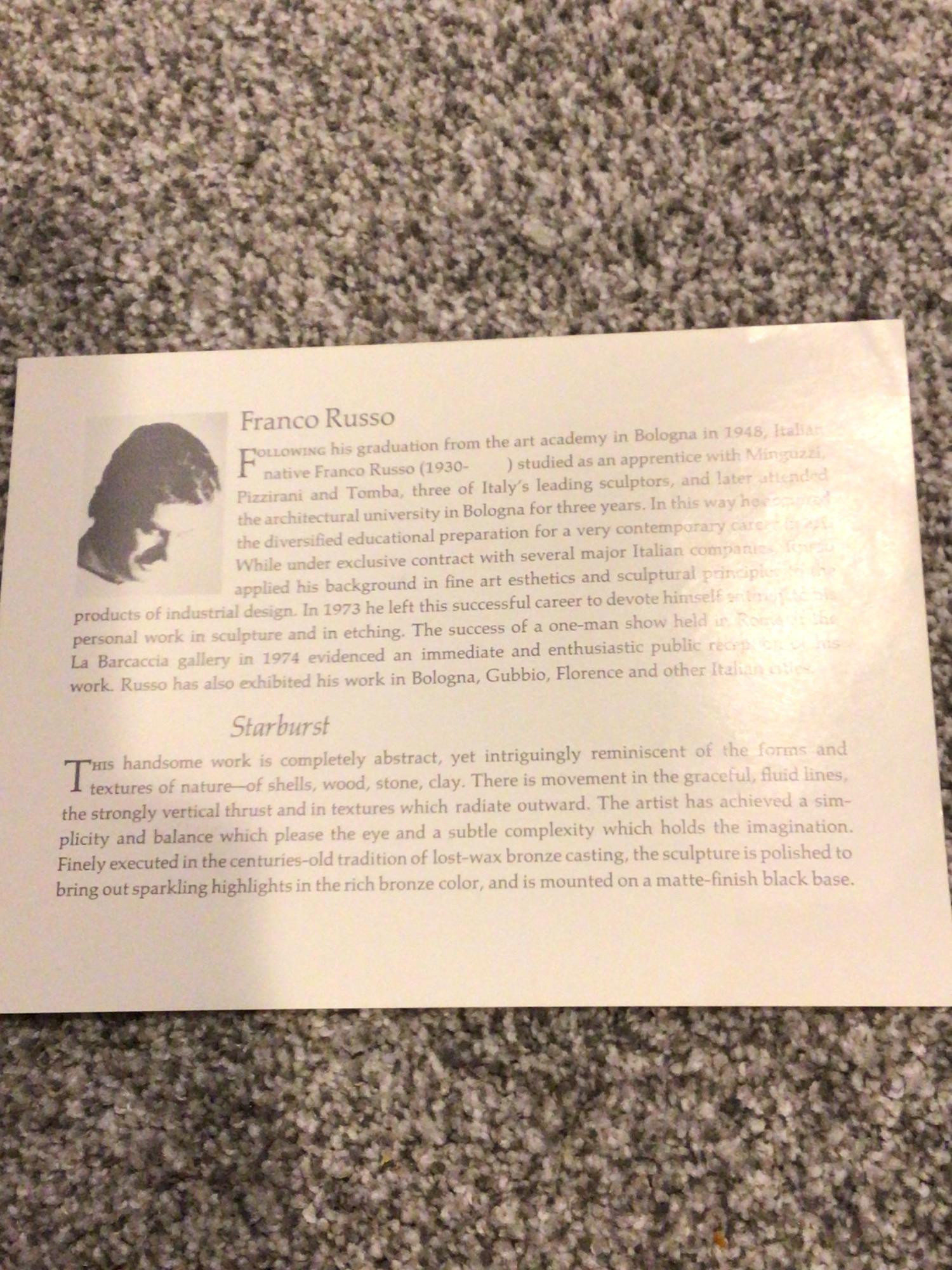 Mid Century Franco Russo Sunburst Bronze Sculpture 471/800 Capture the essence of mid-century abstract art with this limited edition 'Starburst' bronze sculpture by Italian artist Franco Russo. This piece is number 471 out of 800, standing 12½ inches tall and cast in the traditional lost-wax method. It features an elegant design inspired by natural forms, with a rich bronze patina that highlights its dynamic textures. Mounted on a matte-finish black base, it makes a striking addition to any collection. Artist Background: