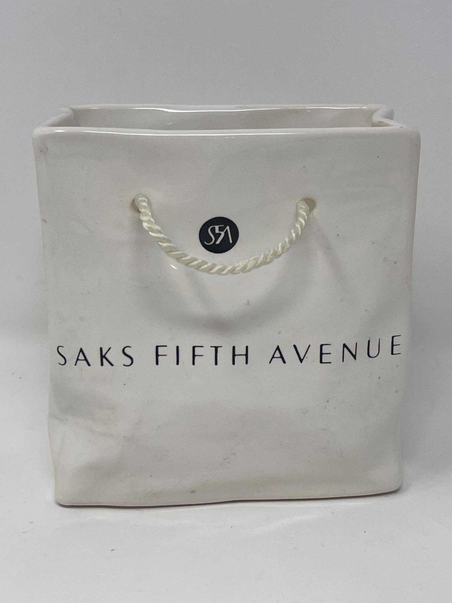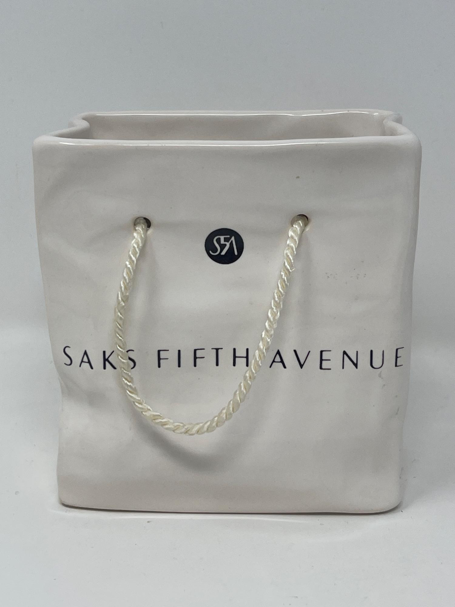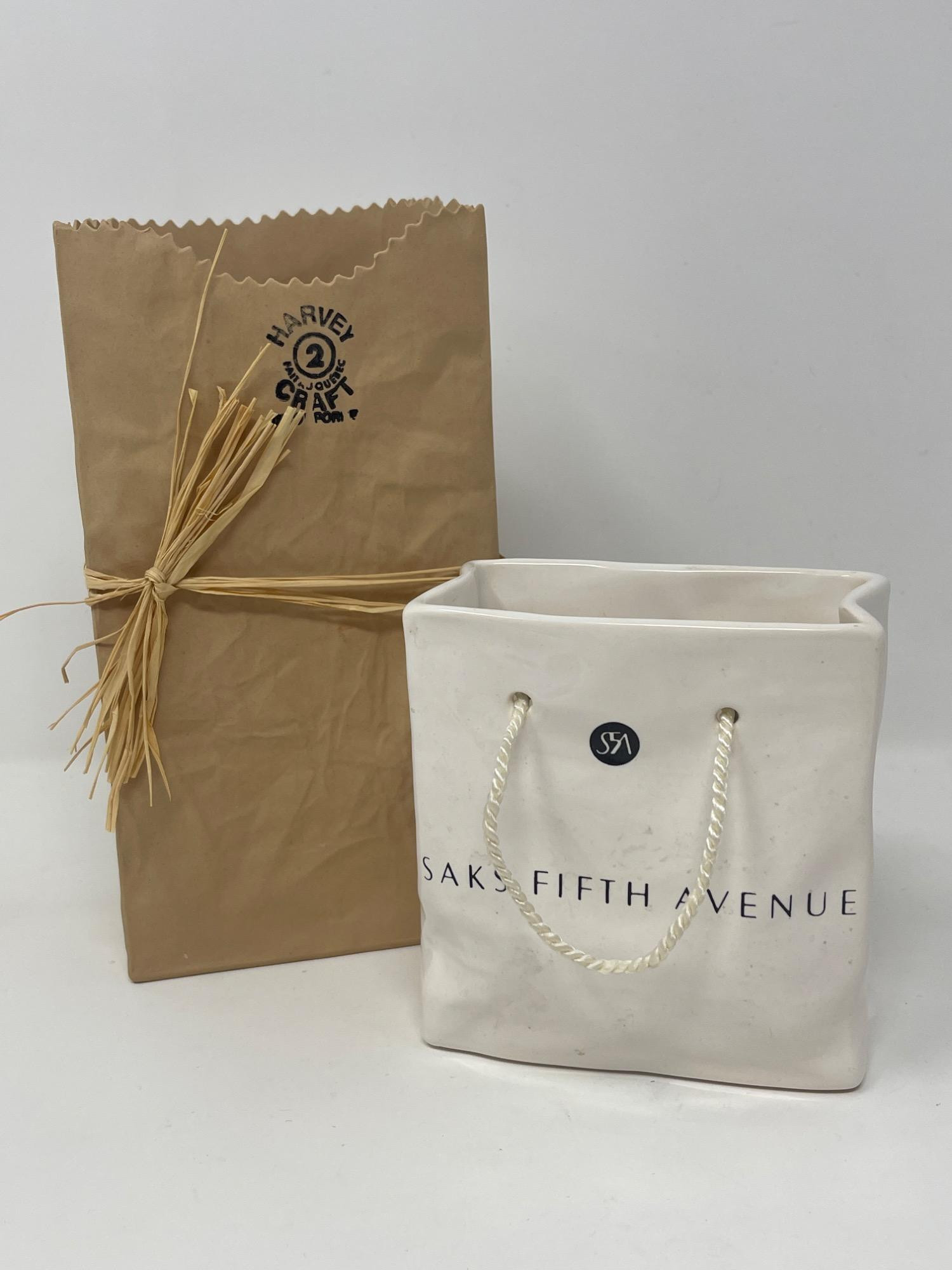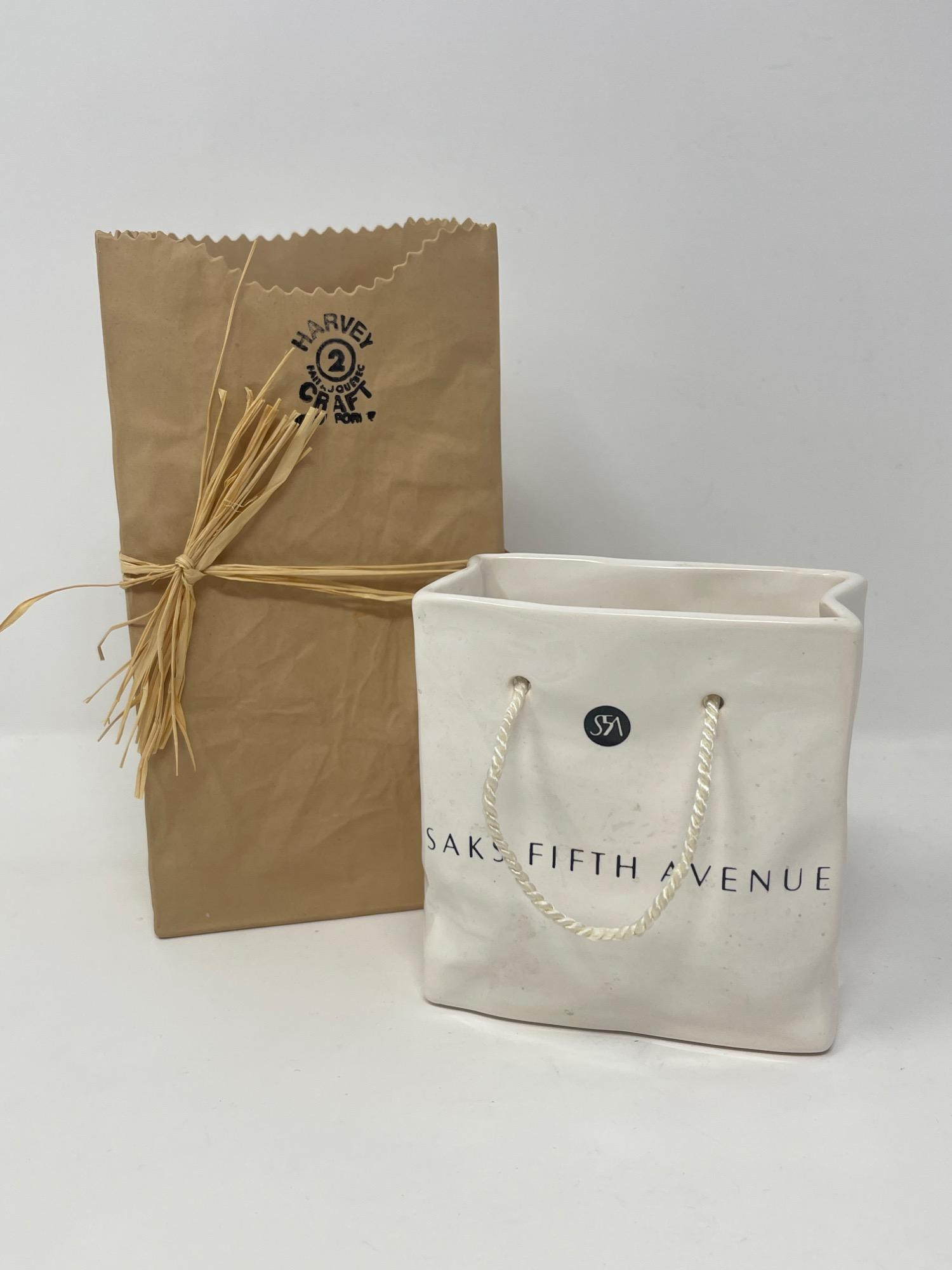 Ceramic Shopping Bag Sculptures - Saks Fifth Avenue & Harvey Craft Add a touch of whimsical elegance to your decor with these ceramic sculptures, creatively modeled after shopping bags from prestigious retailer Saks Fifth Avenue and Harvey Craft. The Saks bag measures 4 inches in height, while the Harvey bag stands at 7.25 inches, each crafted with meticulous attention to detail to mimic the iconic bag designs. These pieces are perfect for collectors of unique home decor or as chic, conversation-starting accessories in any space. Condition: Light stains and scratches.