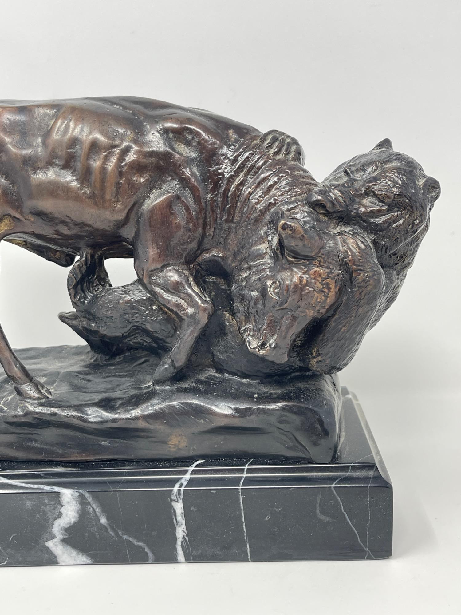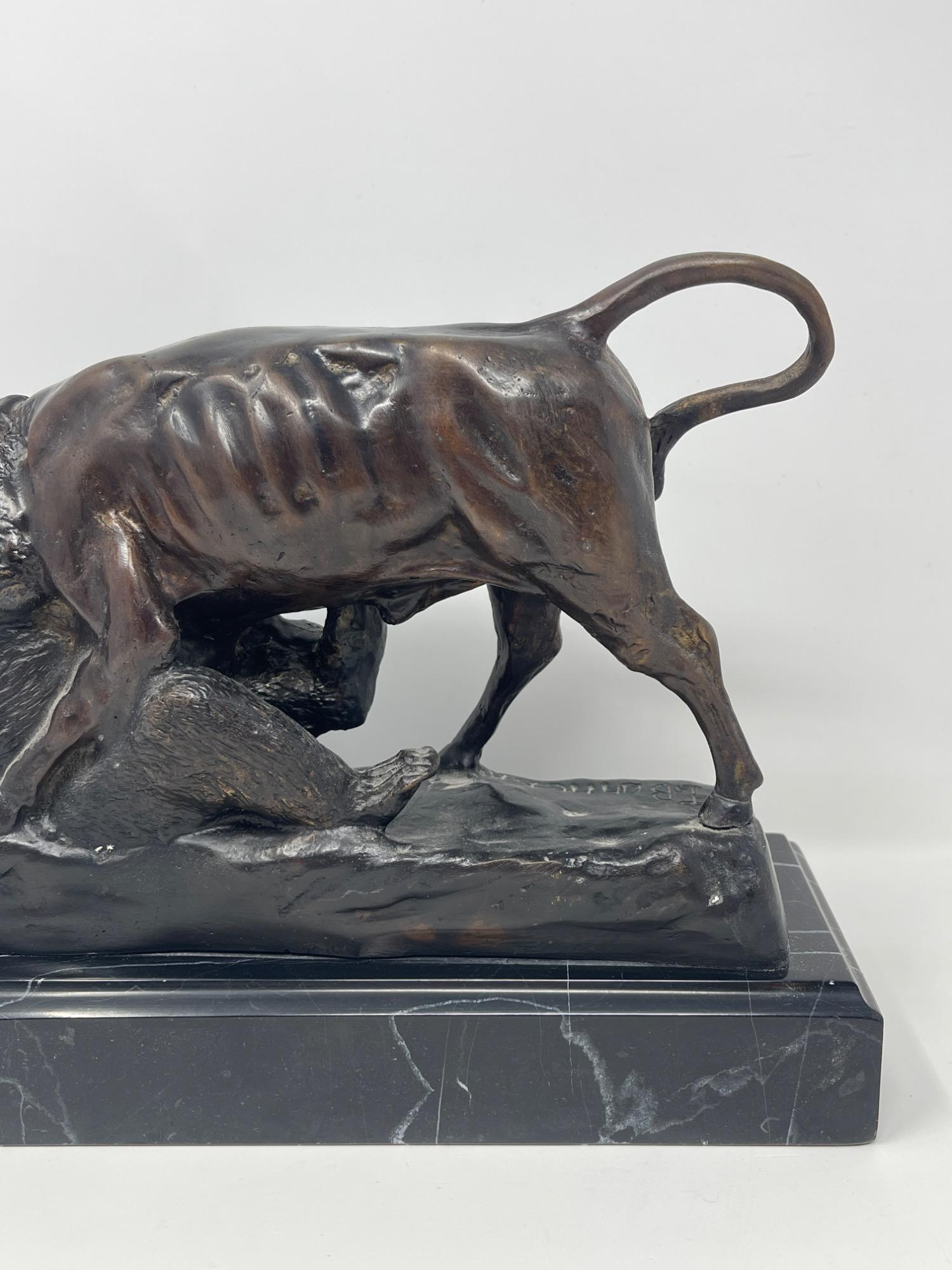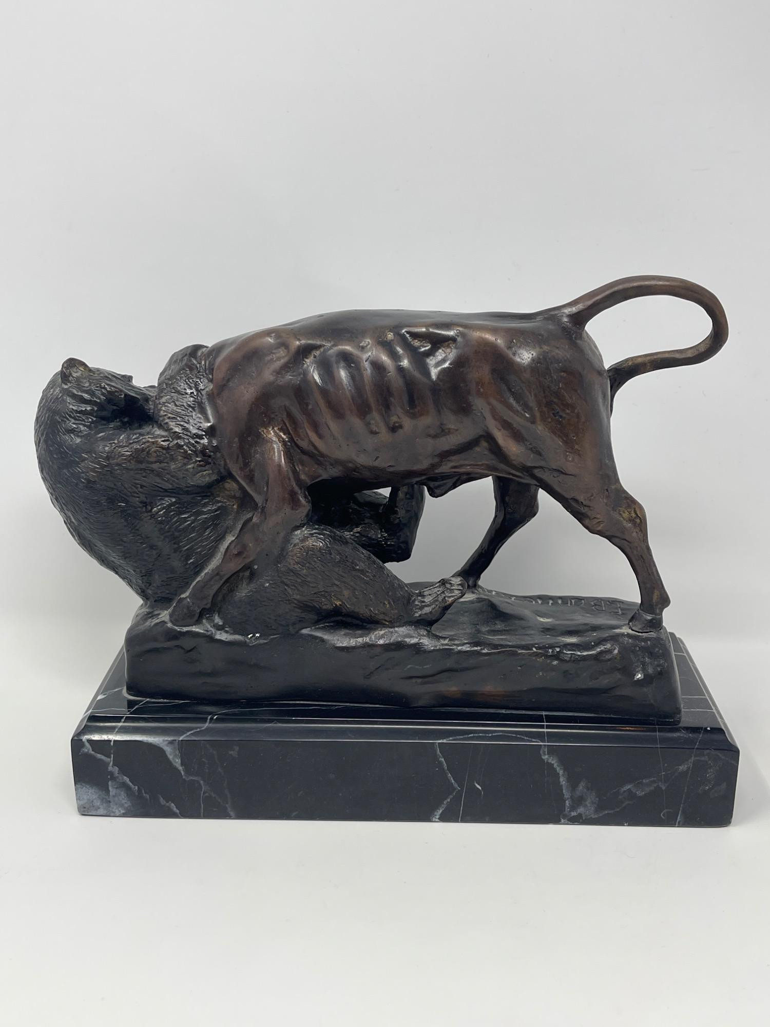 Original Isidore Jules Bonheur 'Bear & Bull' Bronze Sculpture Discover the artistry of Isidore Jules Bonheur with this original bronze sculpture depicting the iconic clash of a bear and bull. Measuring 10 inches long, 4 inches wide, and 8 inches high, this piece captures the intense energy and raw power of market symbolism. Mounted on a sleek marble base, it offers a compelling blend of realism and drama, ideal for collectors and enthusiasts of fine sculptures.