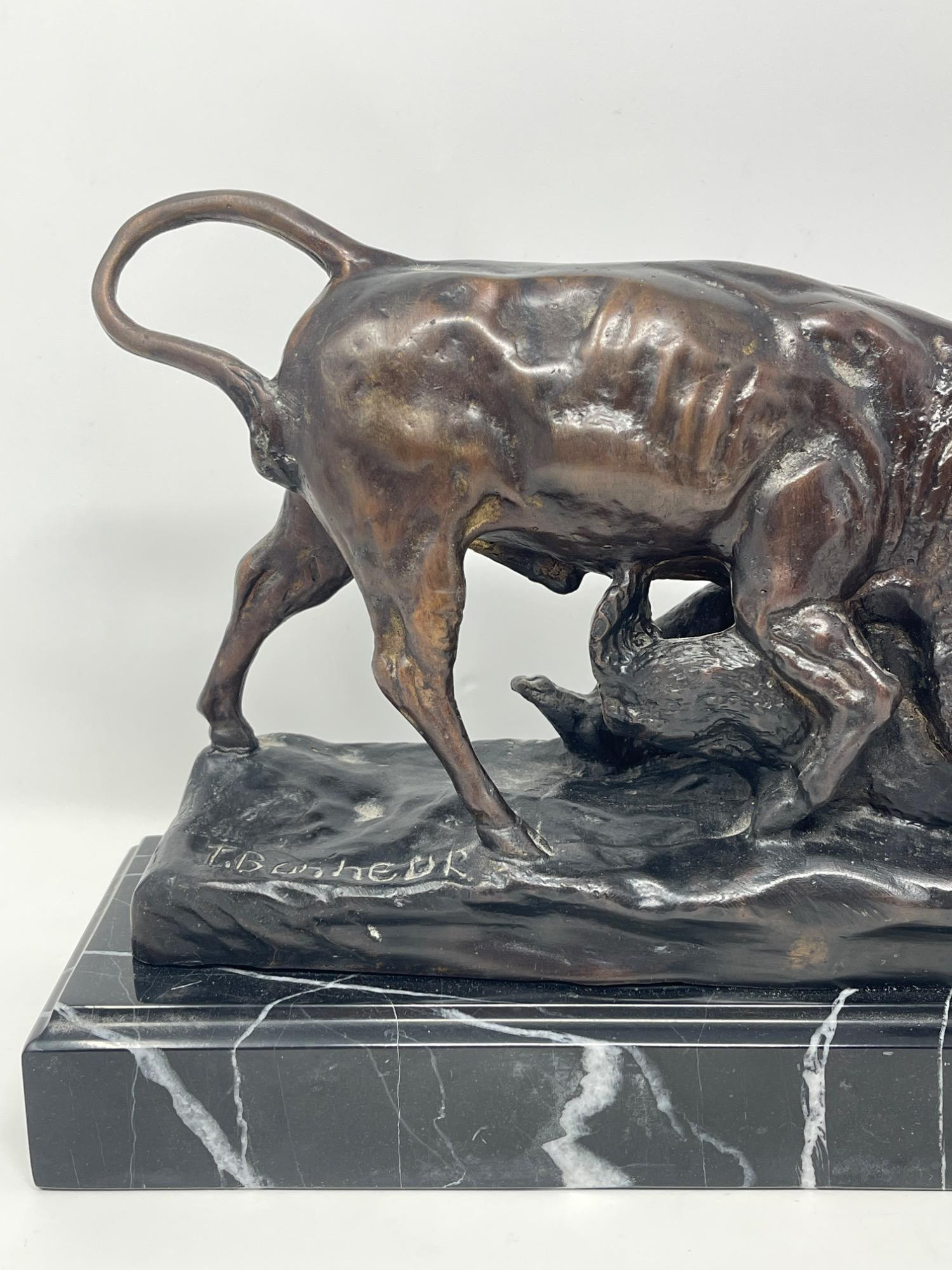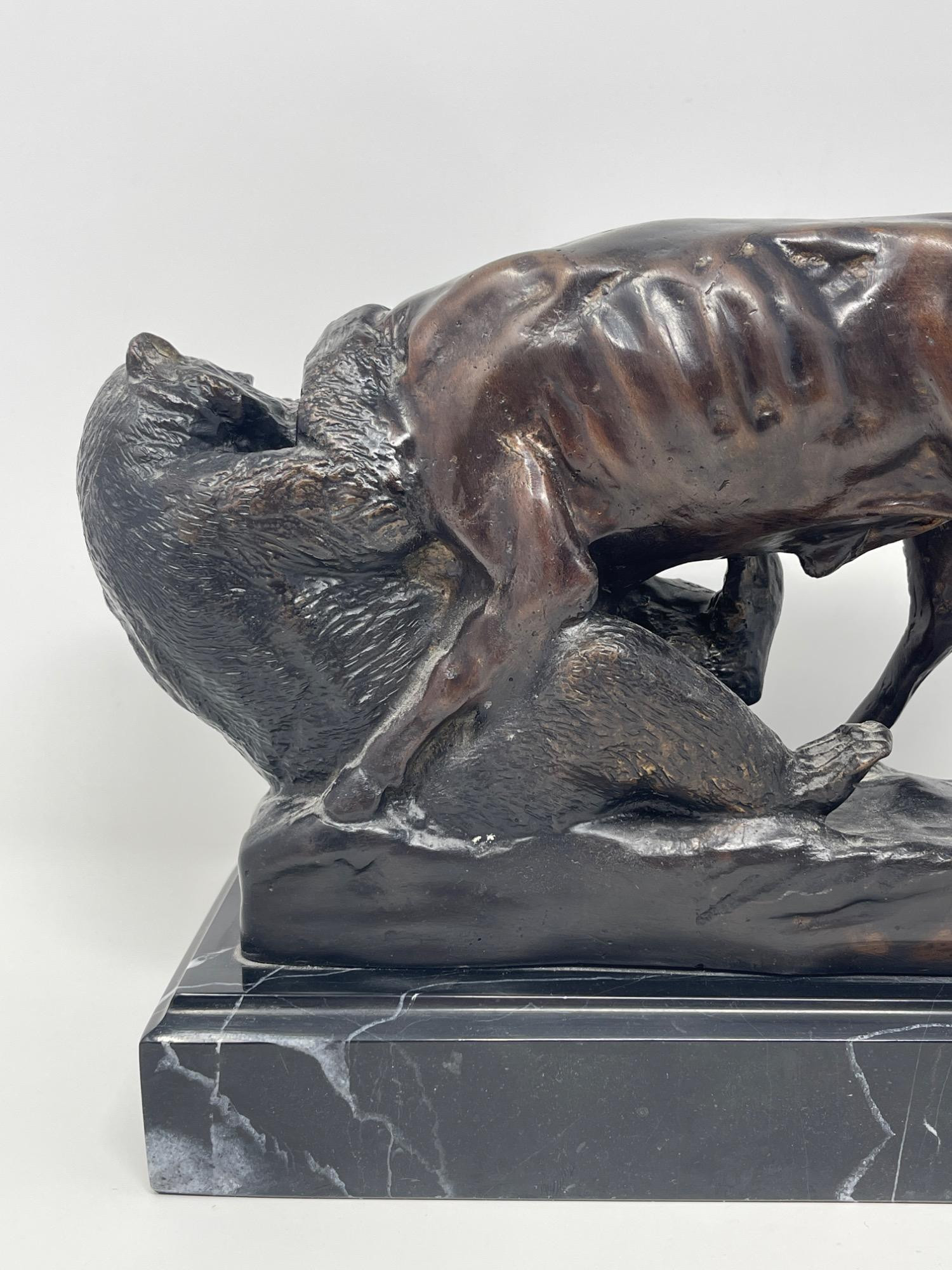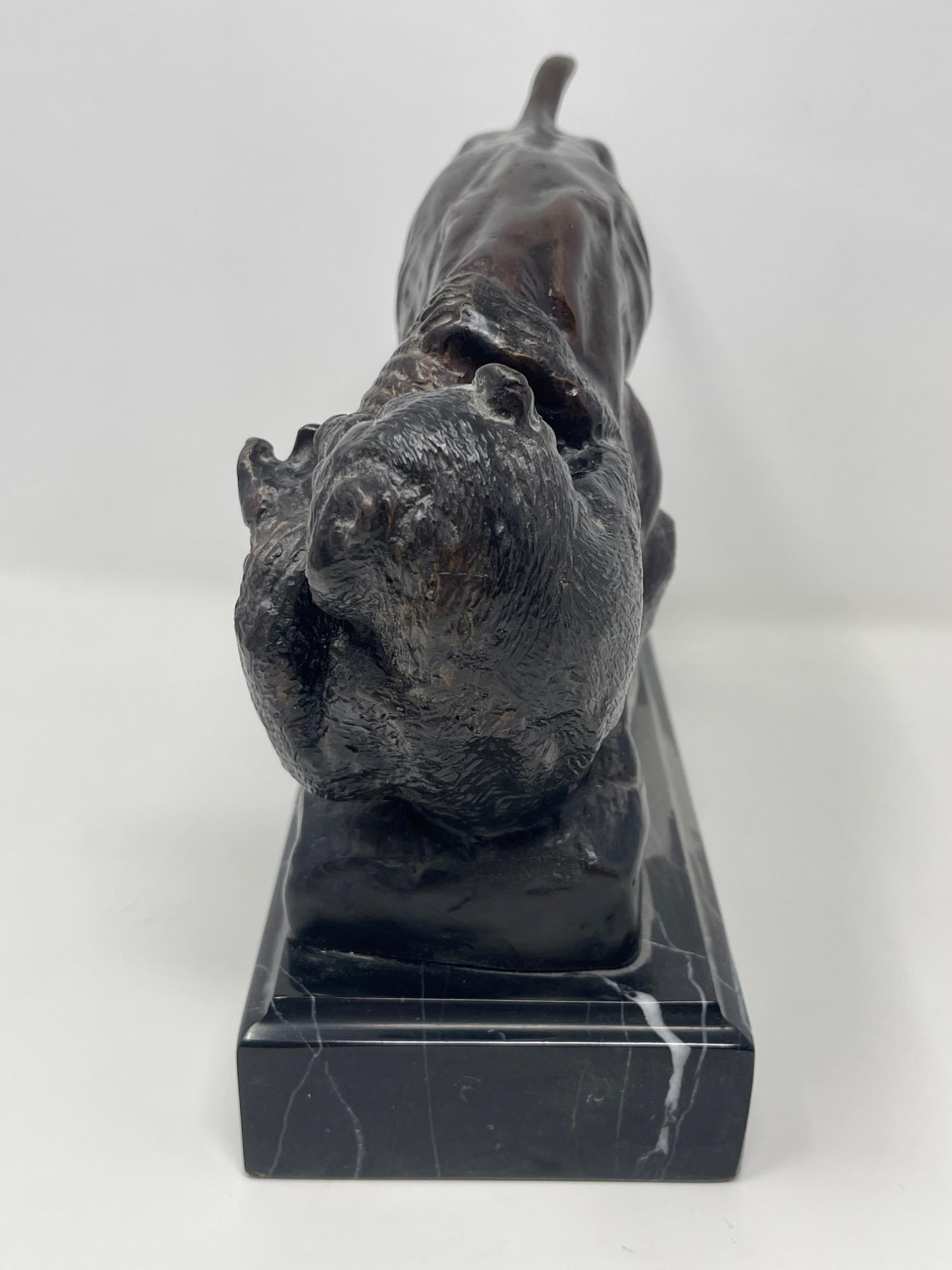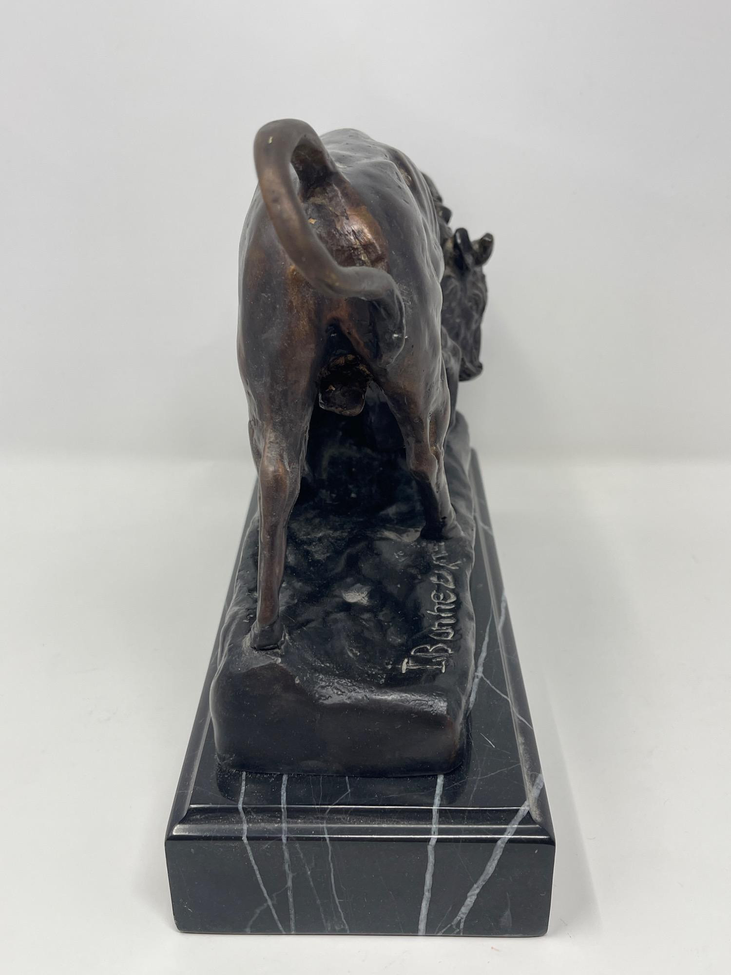 Original Isidore Jules Bonheur 'Bear & Bull' Bronze Sculpture Discover the artistry of Isidore Jules Bonheur with this original bronze sculpture depicting the iconic clash of a bear and bull. Measuring 10 inches long, 4 inches wide, and 8 inches high, this piece captures the intense energy and raw power of market symbolism. Mounted on a sleek marble base, it offers a compelling blend of realism and drama, ideal for collectors and enthusiasts of fine sculptures.