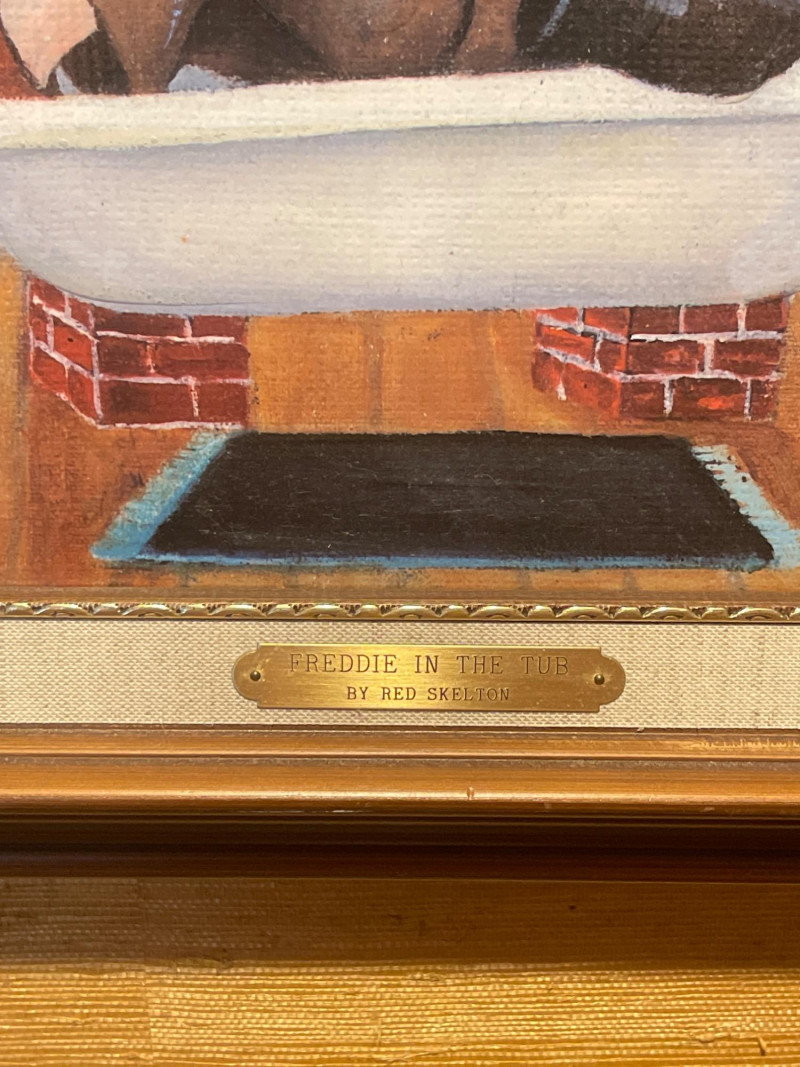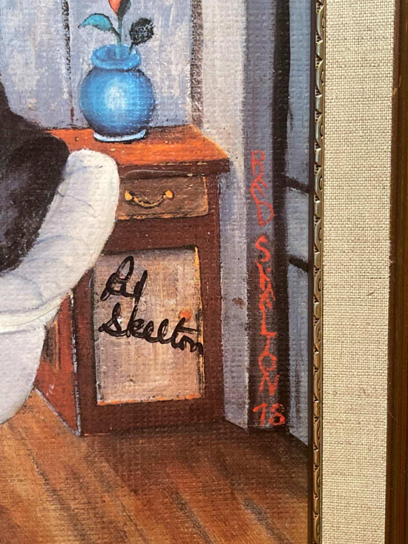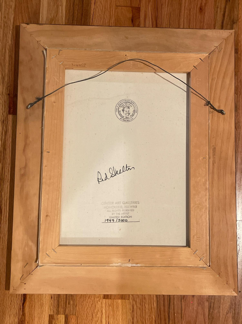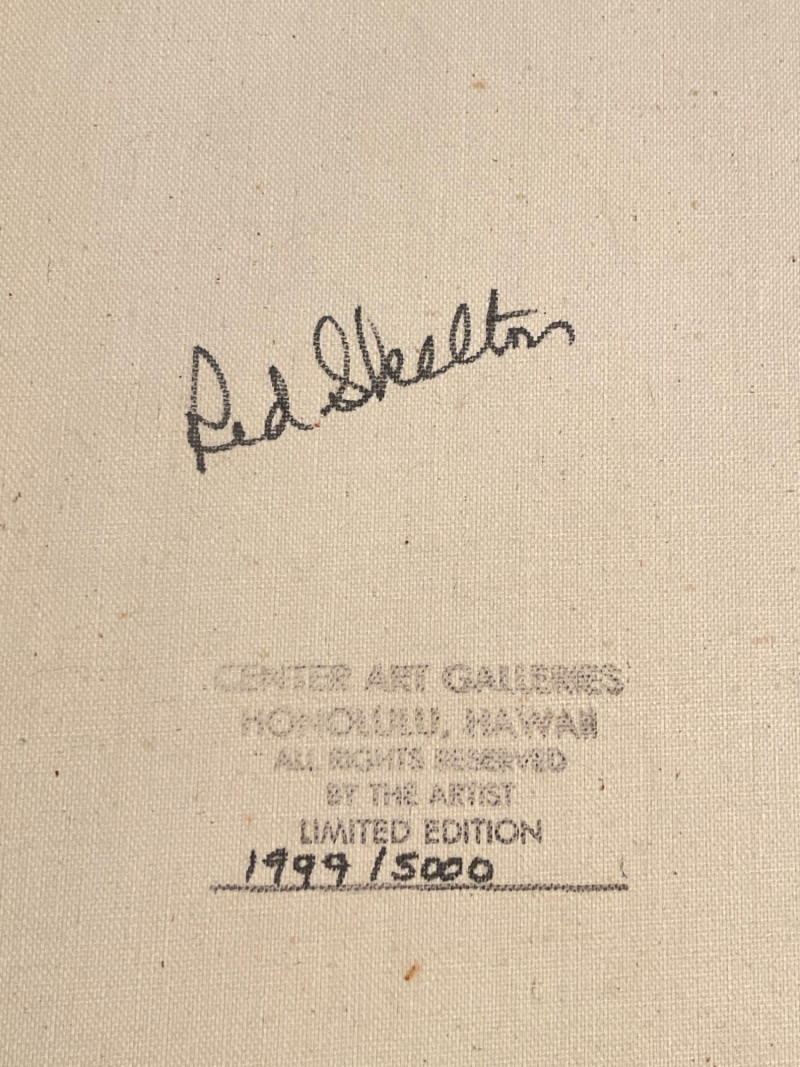 The first is a framed limited edition lithograph titled “Freddie in the Tub”, hand-numbered 1999/5000, distributed by Center Art Galleries in Honolulu, Hawaii. Skelton's signature appears both within the artwork and stamped on the canvas reverse. This charming piece captures Freddie relaxing in a rustic tub setting, complete with warm tones and comic serenity.