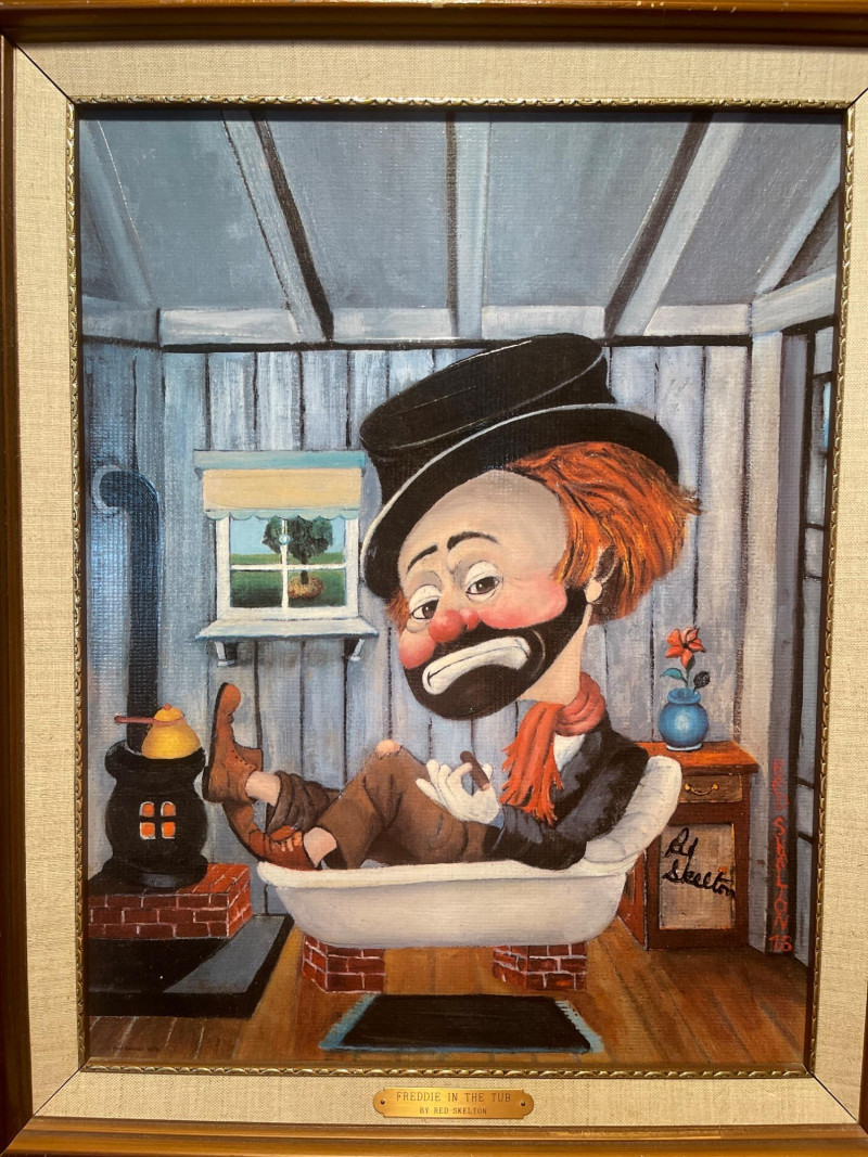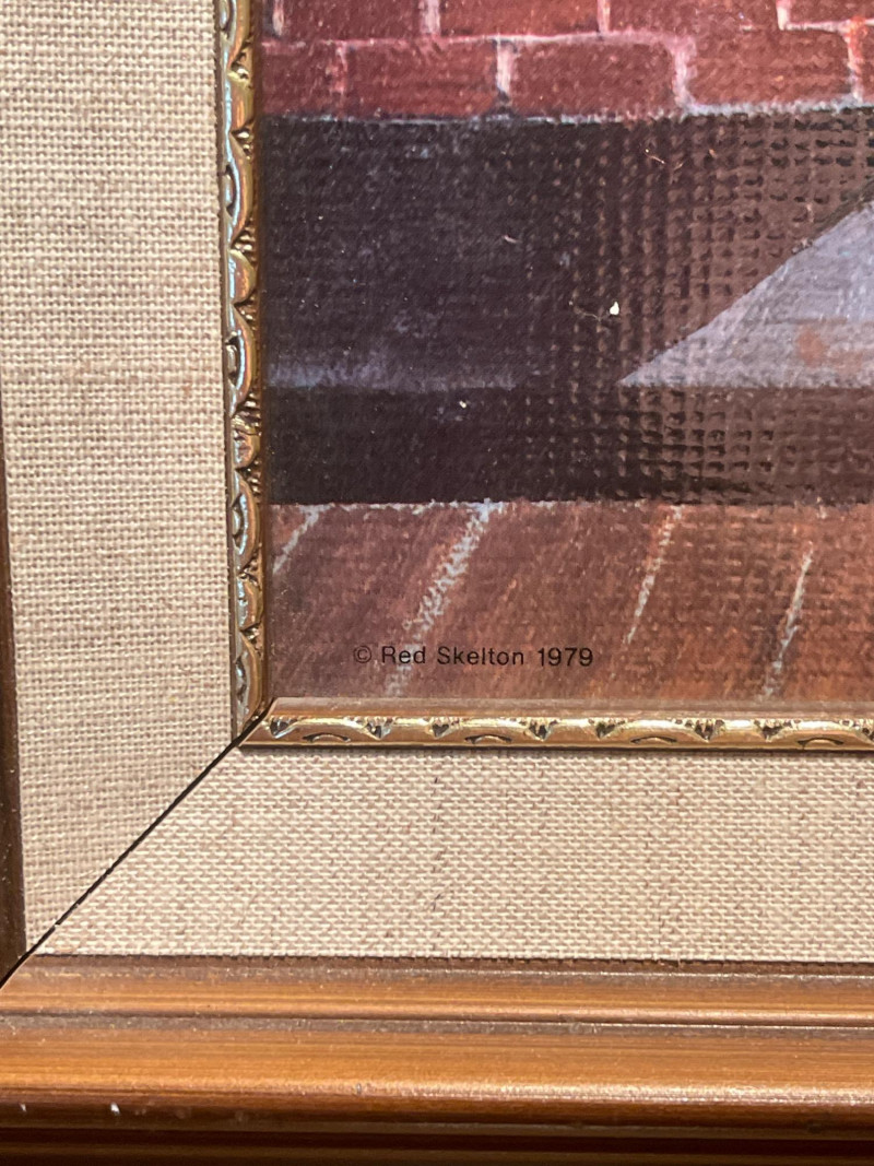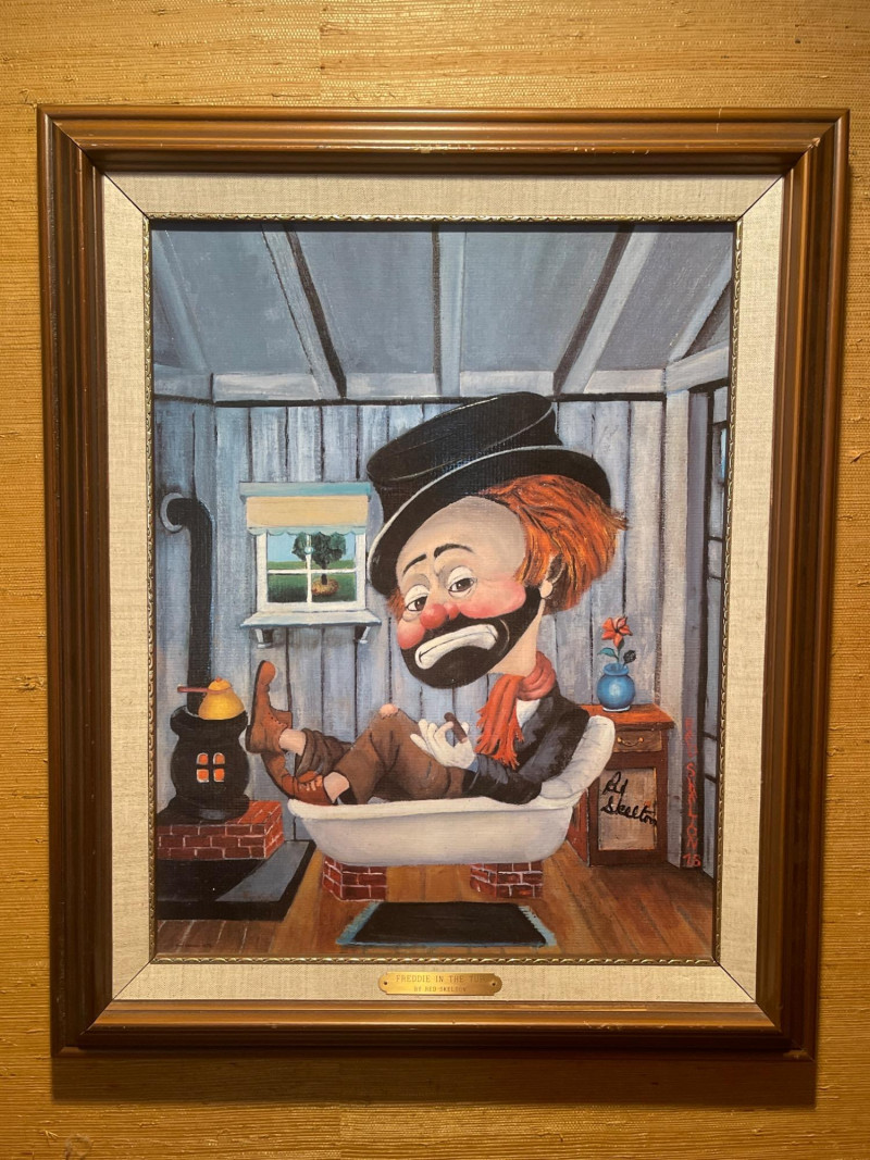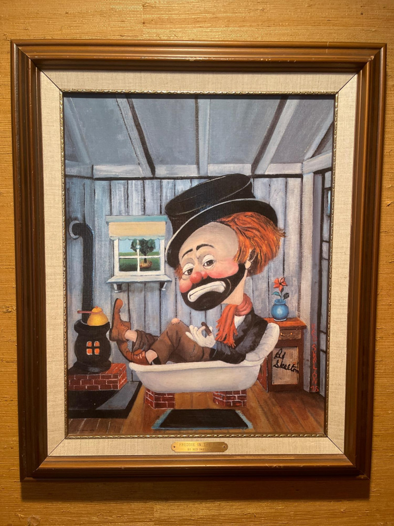 The first is a framed limited edition lithograph titled “Freddie in the Tub”, hand-numbered 1999/5000, distributed by Center Art Galleries in Honolulu, Hawaii. Skelton's signature appears both within the artwork and stamped on the canvas reverse. This charming piece captures Freddie relaxing in a rustic tub setting, complete with warm tones and comic serenity.