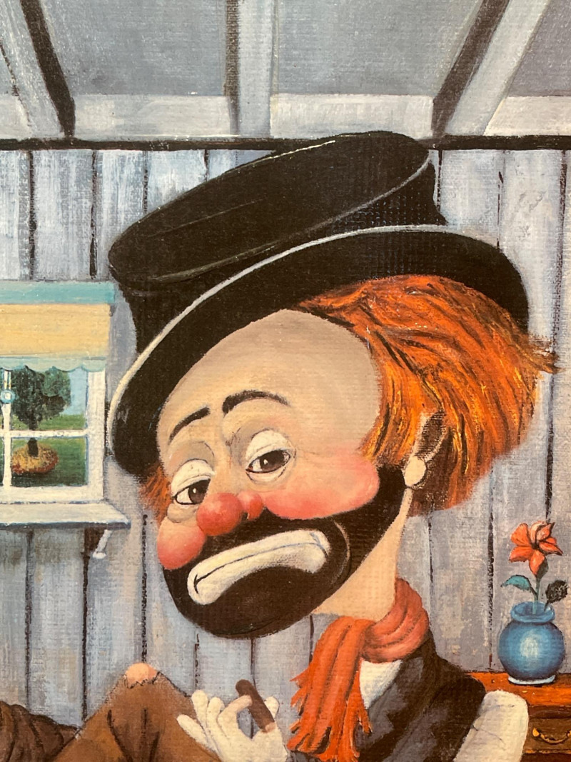 A delightful pairing of collectible art by beloved entertainer and painter Red Skelton, both highlighting his iconic clown character "Freddie the Freeloader" in humorous everyday scenes.