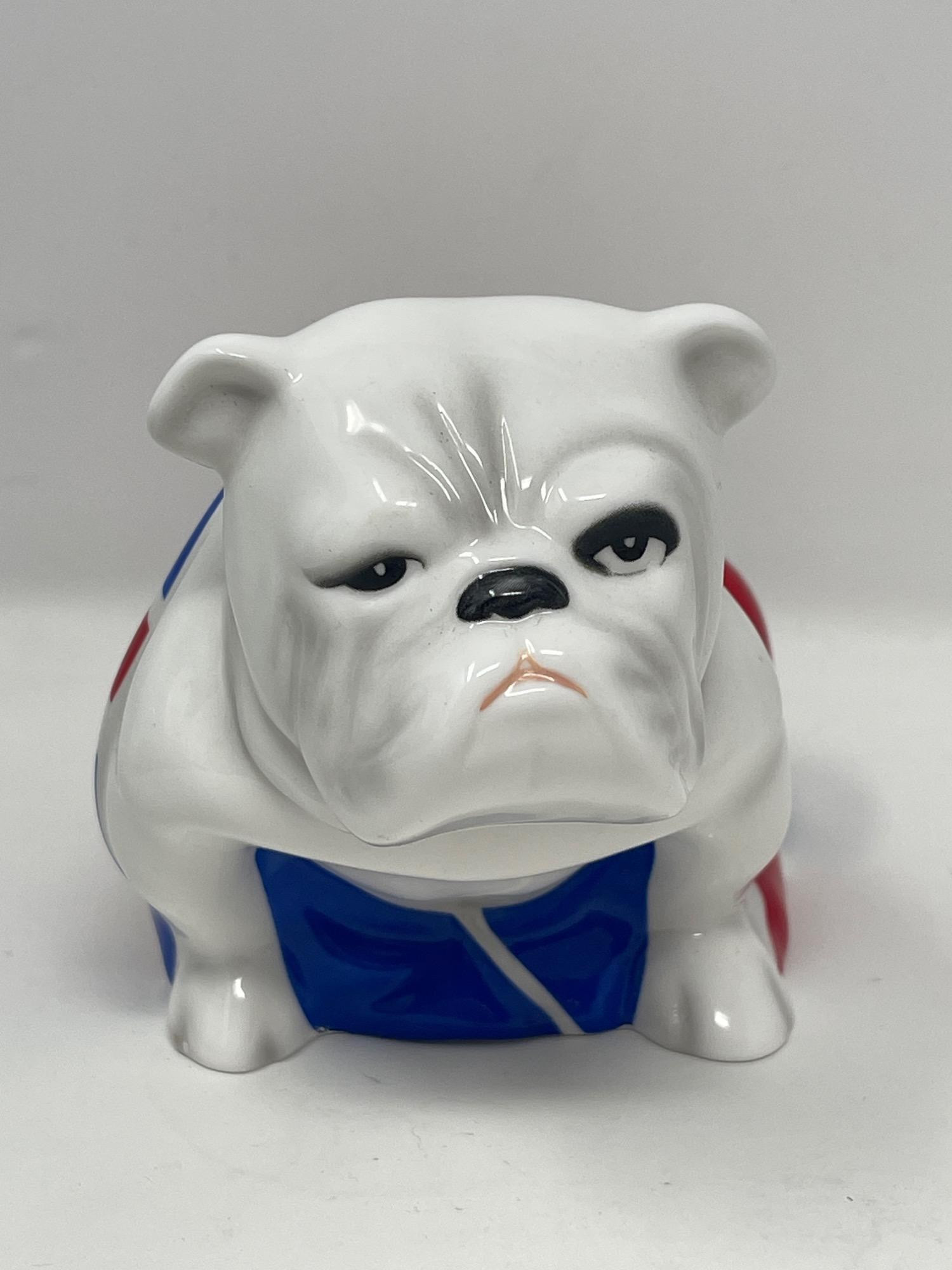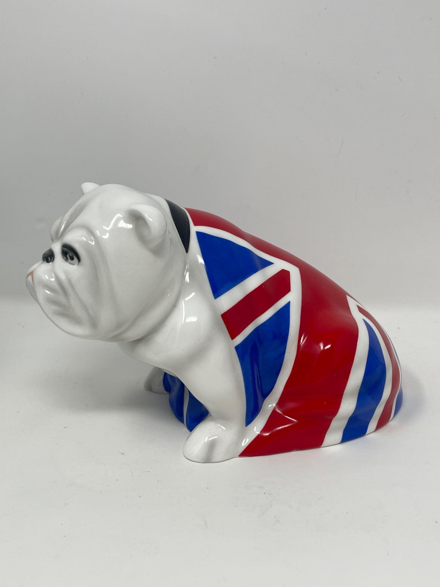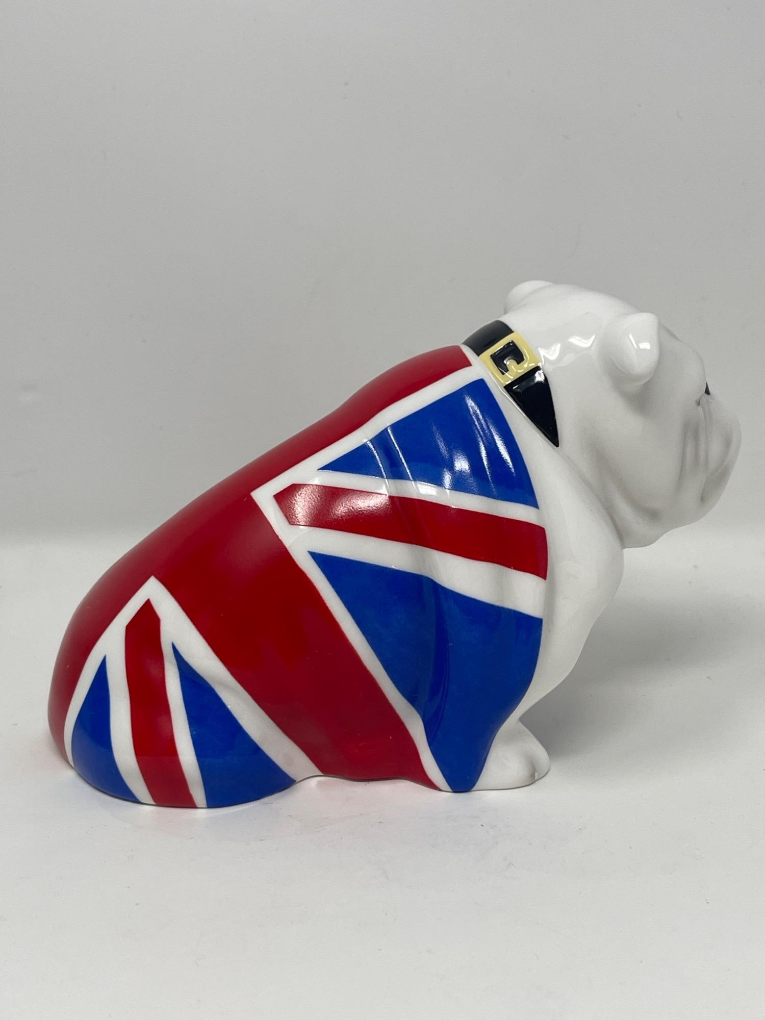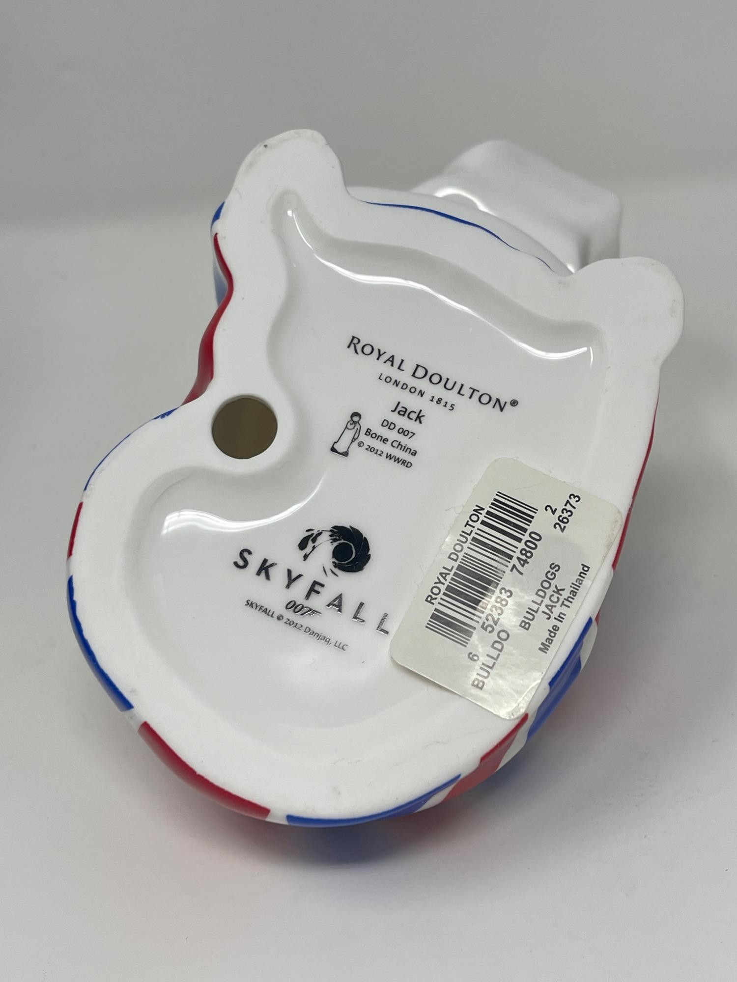 James Bond Royal Doulton 'Jack' Bulldog Figurine from Skyfall 007 4” Height Capture the essence of British resilience and espionage flair with this James Bond Royal Doulton 'Jack' Bulldog figurine, as seen in the 007 film 'Skyfall'. This iconic piece is meticulously crafted from fine bone china and features the distinctive Union Jack design. Complete with original packaging and a certificate of authenticity signed by Michael Doulton, it stands as a tribute to both British culture and the cinematic legacy of James Bond.