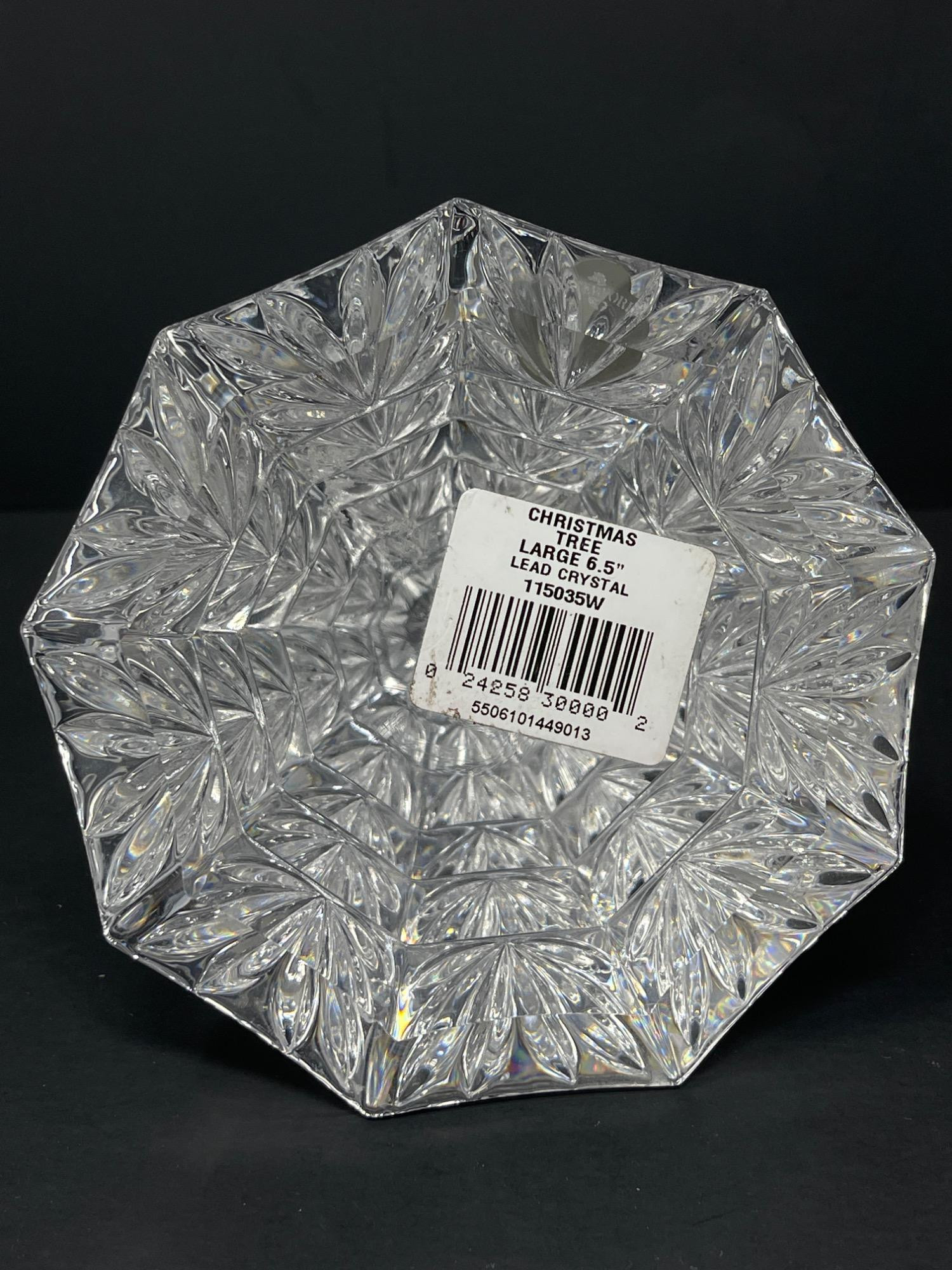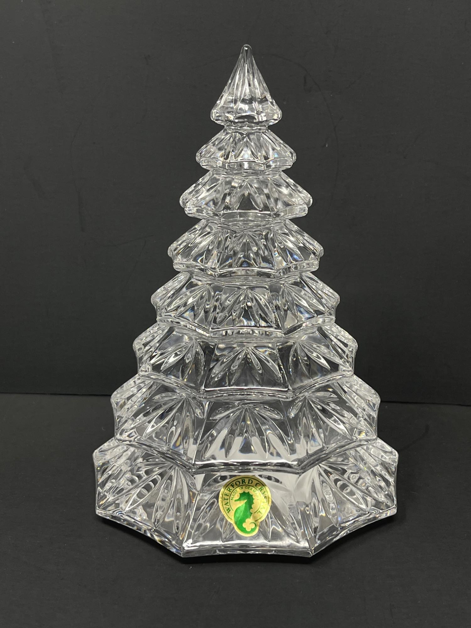 Elegant Waterford Crystal Christmas Tree - 6.5 Inches High Celebrate the season with this exquisite Waterford Crystal Christmas Tree, standing 6.5 inches tall. This finely crafted tree is a stunning display of craftsmanship, featuring intricate cuts that capture and reflect light beautifully, adding a sparkling ambiance to any holiday decor. With its classic design and high-quality crystal, this piece is a perfect addition to your festive decorations or as a cherished gift for someone special. Embodying the elegance and quality Waterford is known for, this crystal Christmas tree makes a timeless treasure in any collection.