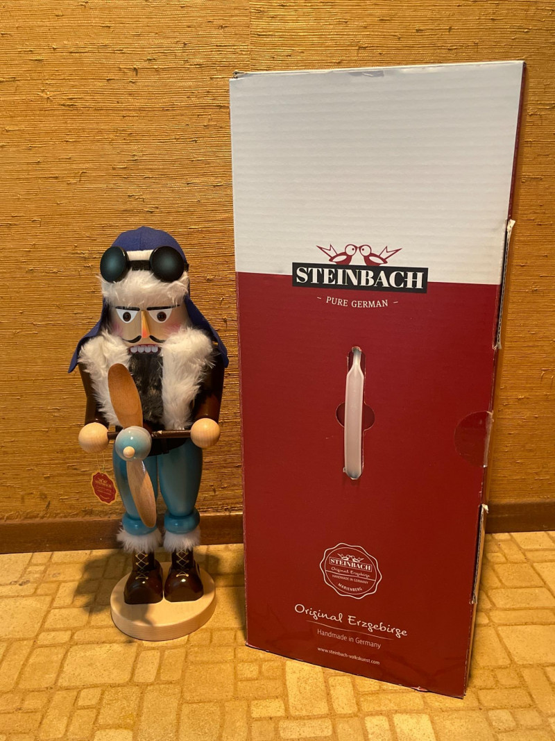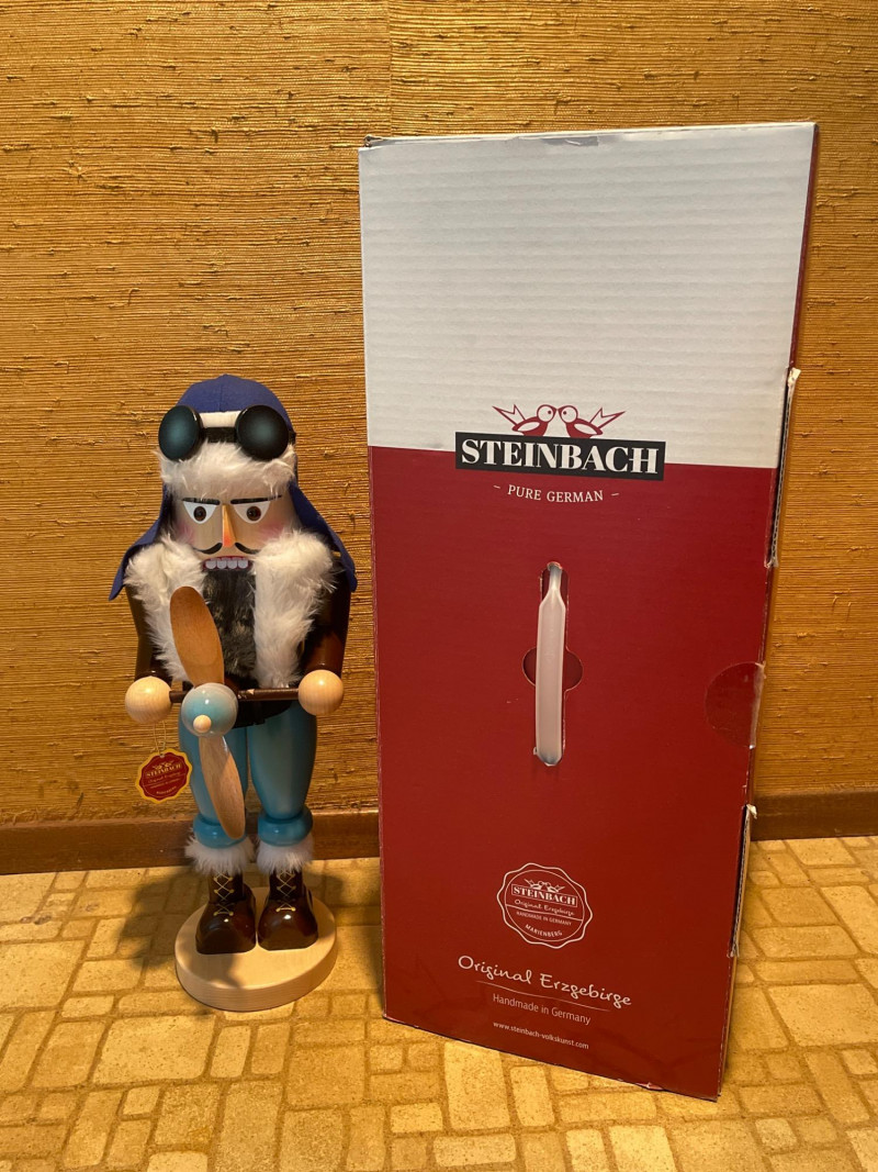 Steinbach German Nutcracker - Aviator Design, w/ Original Box Elevate your holiday decor or nutcracker collection with this exquisite Steinbach Nutcracker, expertly handcrafted in Germany. Known for their exceptional quality and intricate details, Steinbach nutcrackers are cherished by collectors worldwide. This particular model, featuring an aviator theme, makes a unique and charming addition. The nutcracker is dressed as an aviator, complete with goggles and a propeller, capturing the spirit of adventure and flight. The attention to detail in the clothing textures and accessories reflects the high craftsmanship Steinbach is known for. Includes the original Steinbach box, adding to its value as a collector's item and ensuring its condition is preserved. The box also confirms its authenticity as a genuine Steinbach product.