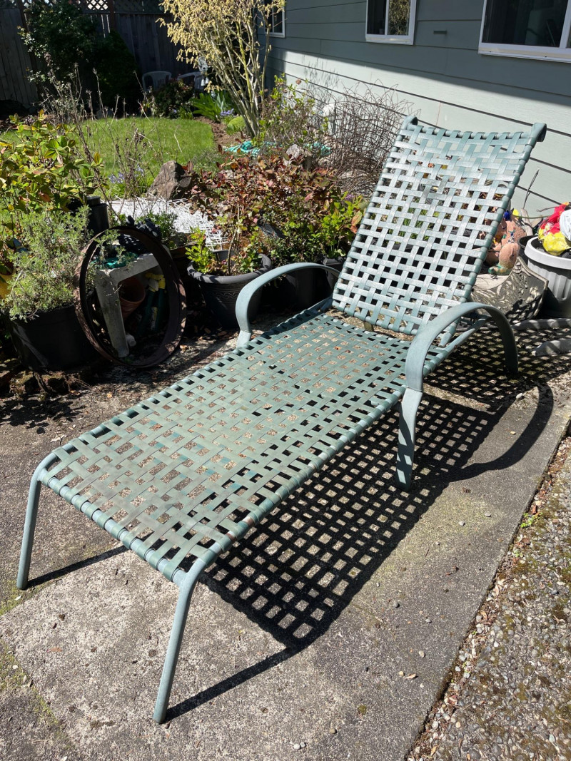 Green Outdoor Lounge Chair with Smith & Hawken Botanical Cushion Comfort meets classic garden style with this adjustable outdoor lounge chair, featuring a powder-coated green metal frame and a signature Smith & Hawken botanical cushion. Chair and cushion show light wear from outdoor use, with some patina on the frame and sun-fading on fabric. A lovely addition to your patio, deck, or garden.