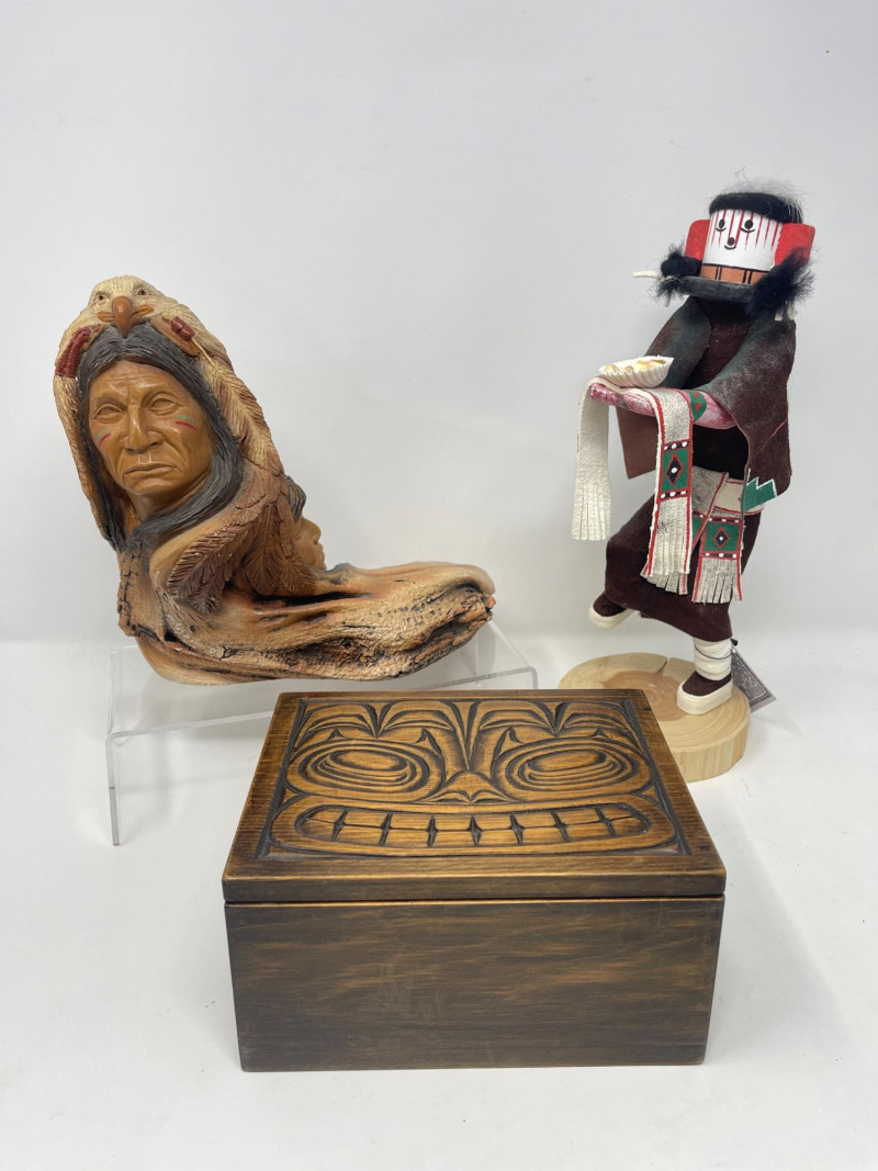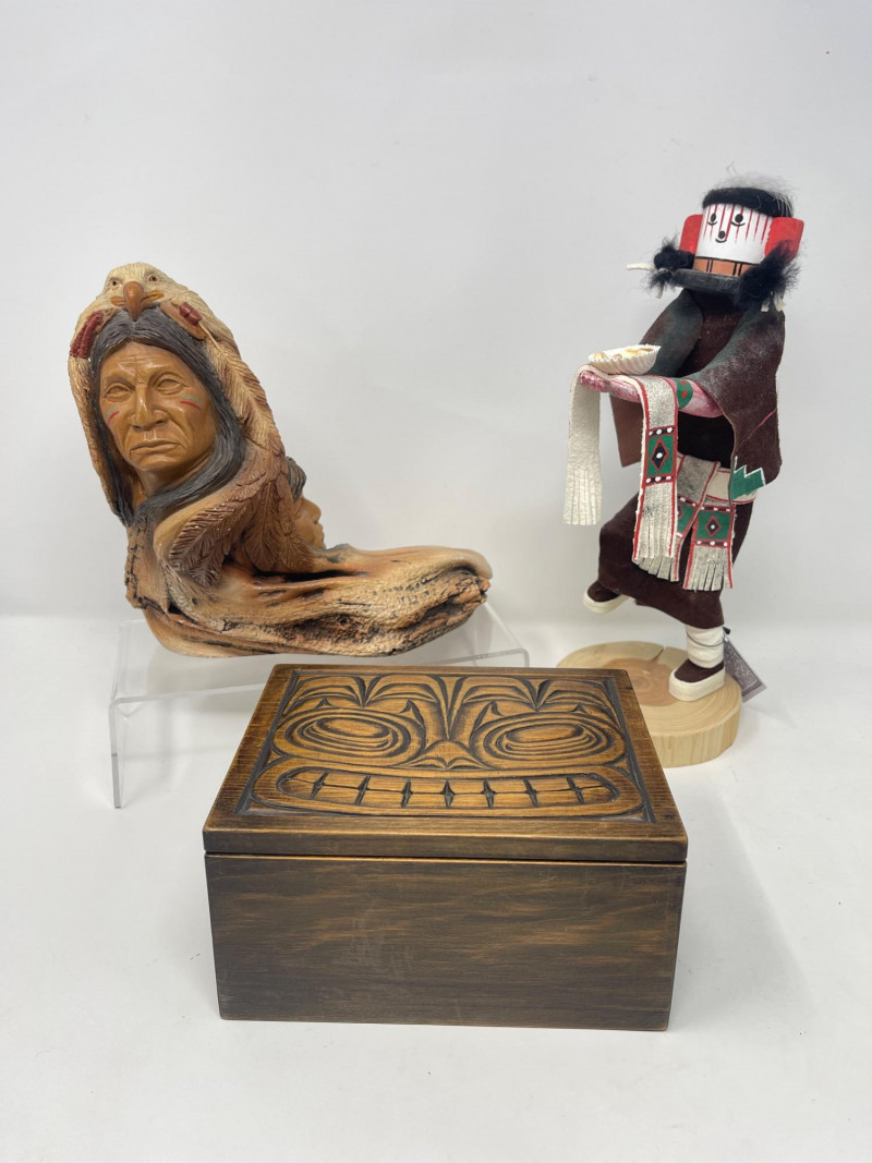 Native-Inspired Art Trio – Navajo Kachina, Haida Box, Mill Creek Sculpture
