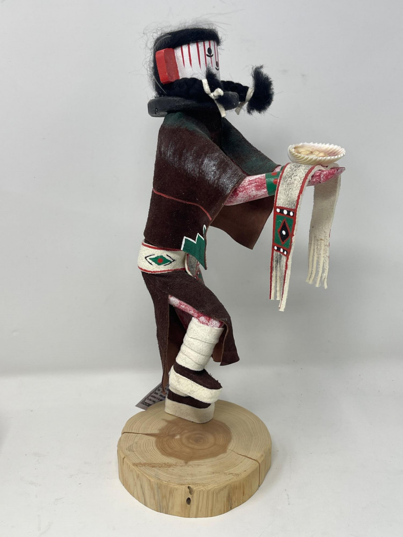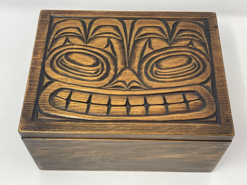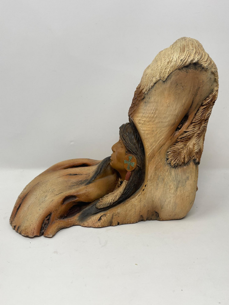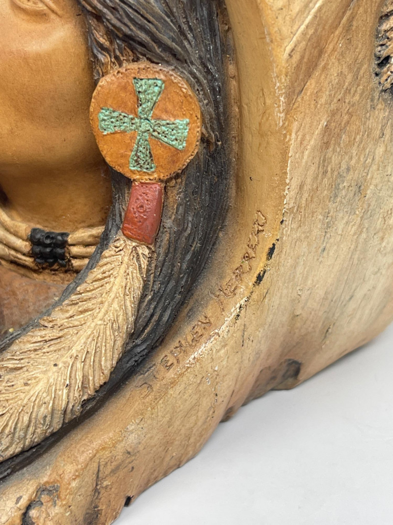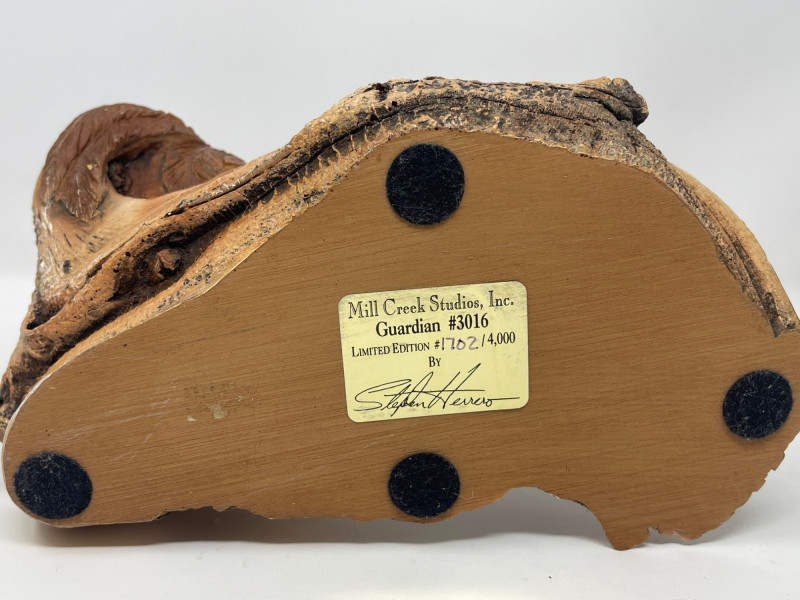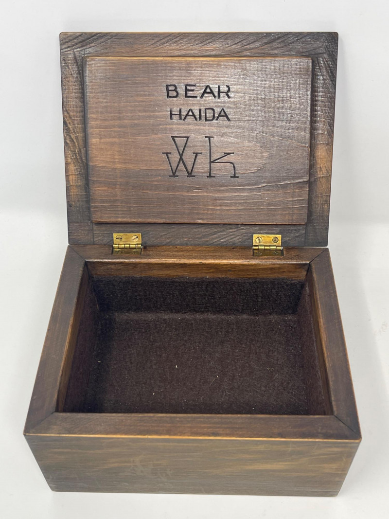 A compelling trio of Native-inspired art and collectibles, each piece reflecting cultural symbolism, craftsmanship, and storytelling: "Smiling Grandmother" Kachina Doll (12" H) – Signed by the artist, this Dine Navajo-style Kachina represents Mother Earth. Includes original tag and hand-painted details. Mill Creek Studios “Guardian” Sculpture – A driftwood-look bust by Stephen Herrero, limited edition #1702/4000, evoking ancestral protection and nature. Hand-Carved Bear Haida Style Bear Box – Wood box signed "Bear Haida, WK" with traditional Northwest Coast motif and felt-lined interior (7" x 5.5" x 3.5"). Each piece offers a unique representation of Indigenous storytelling and spirit.