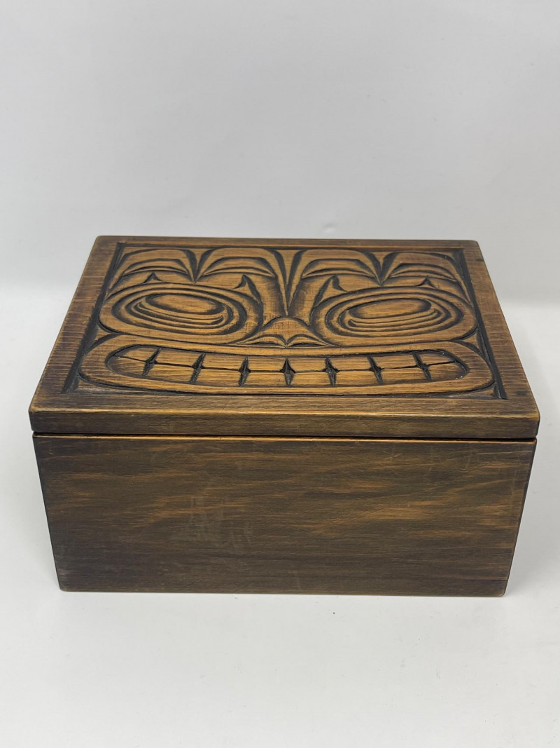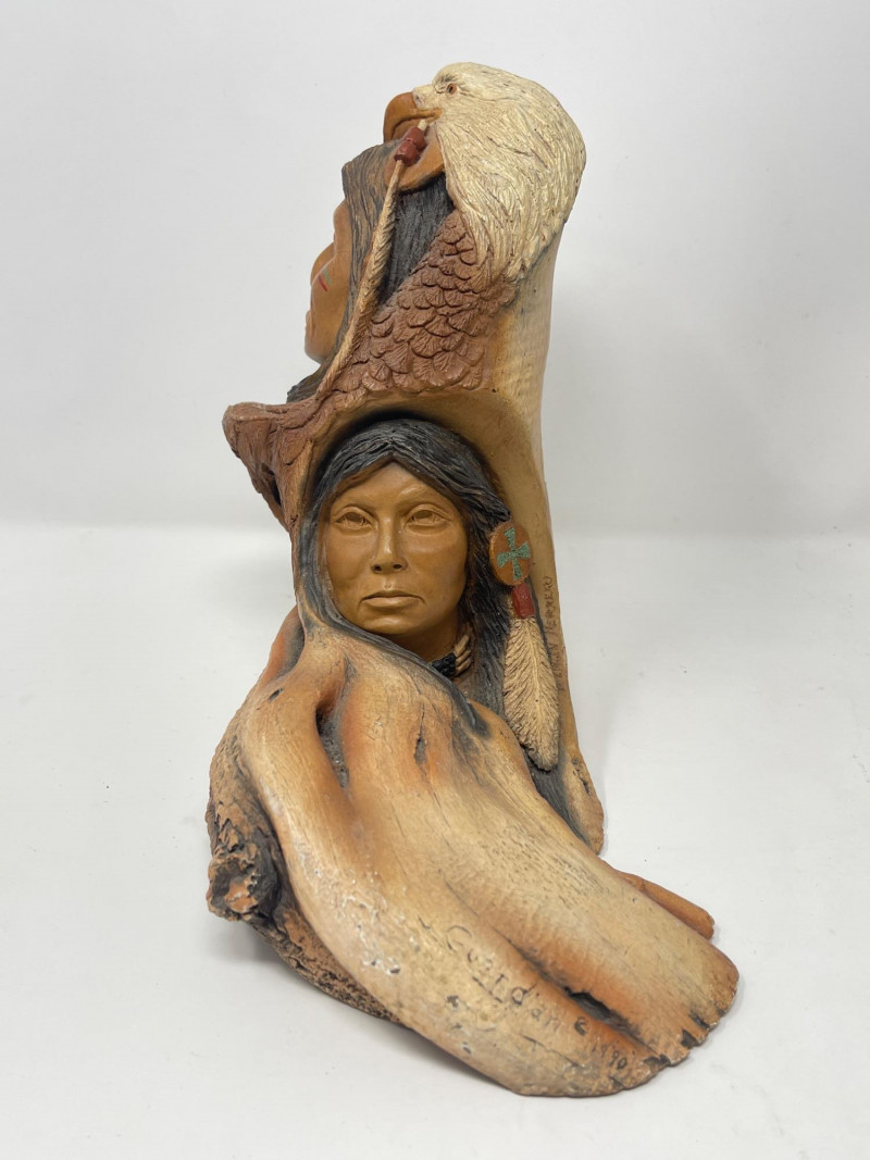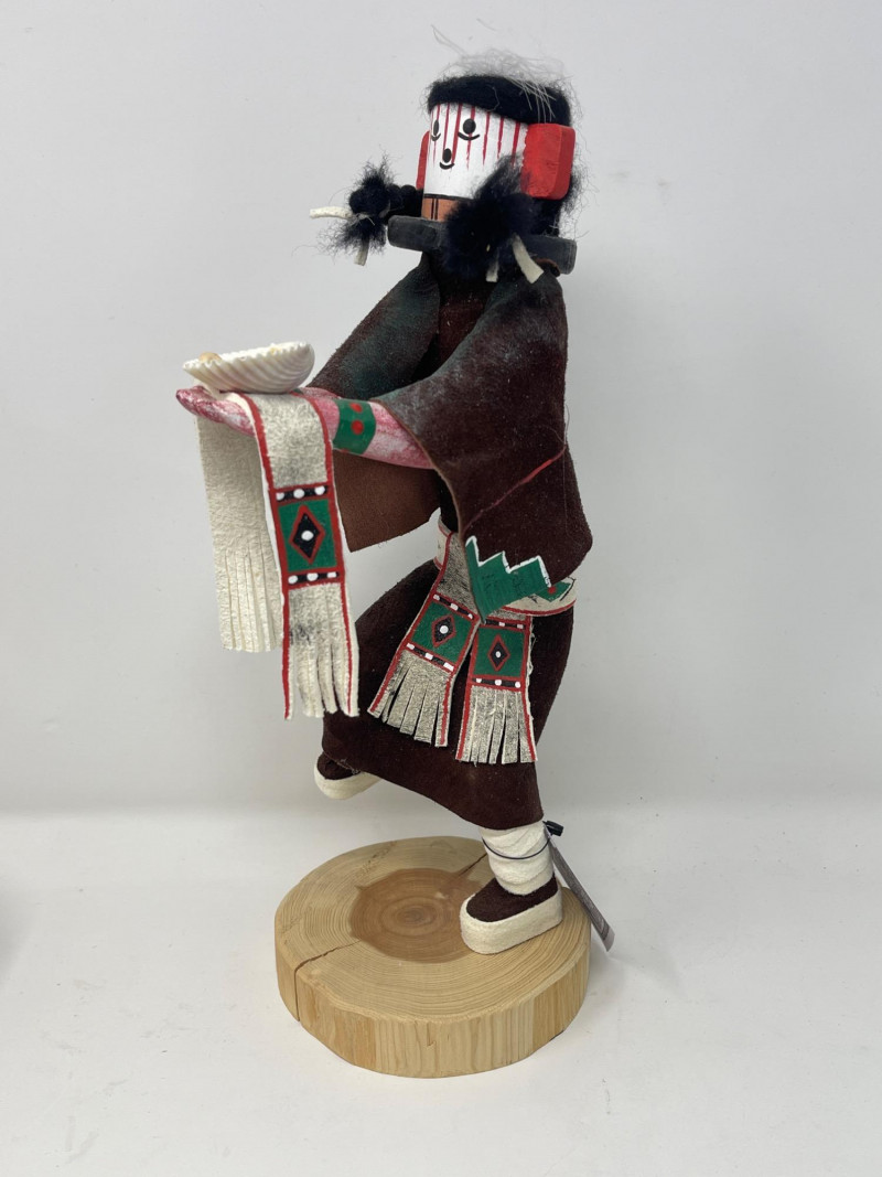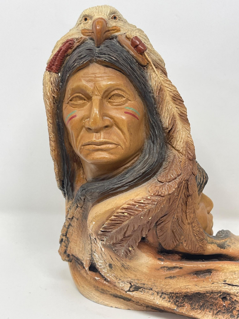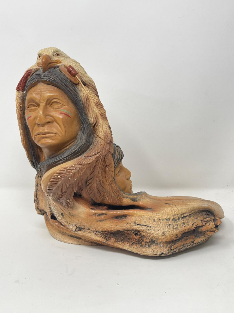 A compelling trio of Native-inspired art and collectibles, each piece reflecting cultural symbolism, craftsmanship, and storytelling: "Smiling Grandmother" Kachina Doll (12" H) – Signed by the artist, this Dine Navajo-style Kachina represents Mother Earth. Includes original tag and hand-painted details. Mill Creek Studios “Guardian” Sculpture – A driftwood-look bust by Stephen Herrero, limited edition #1702/4000, evoking ancestral protection and nature. Hand-Carved Bear Haida Style Bear Box – Wood box signed "Bear Haida, WK" with traditional Northwest Coast motif and felt-lined interior (7" x 5.5" x 3.5"). Each piece offers a unique representation of Indigenous storytelling and spirit.