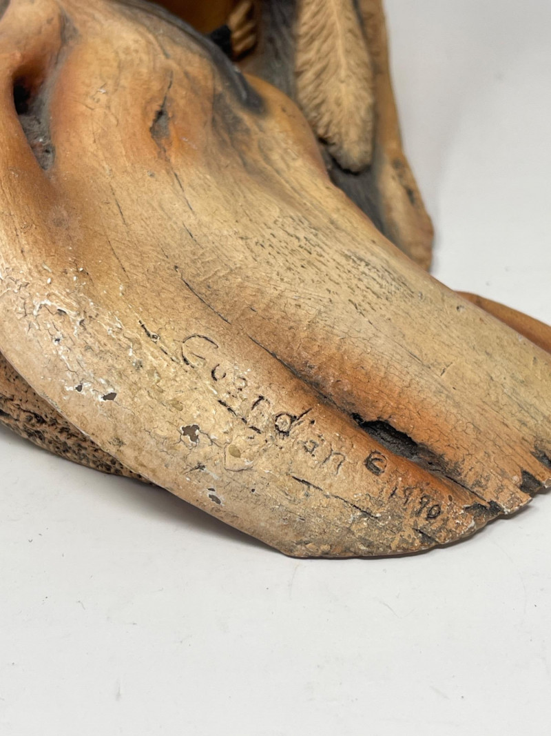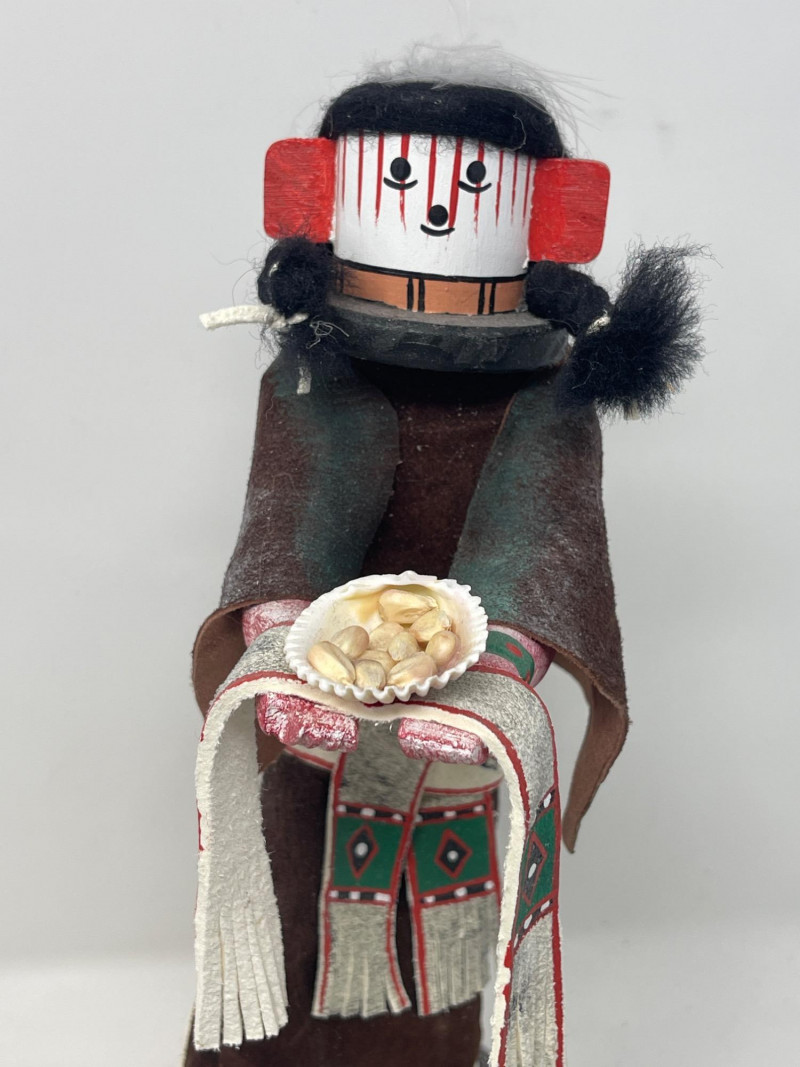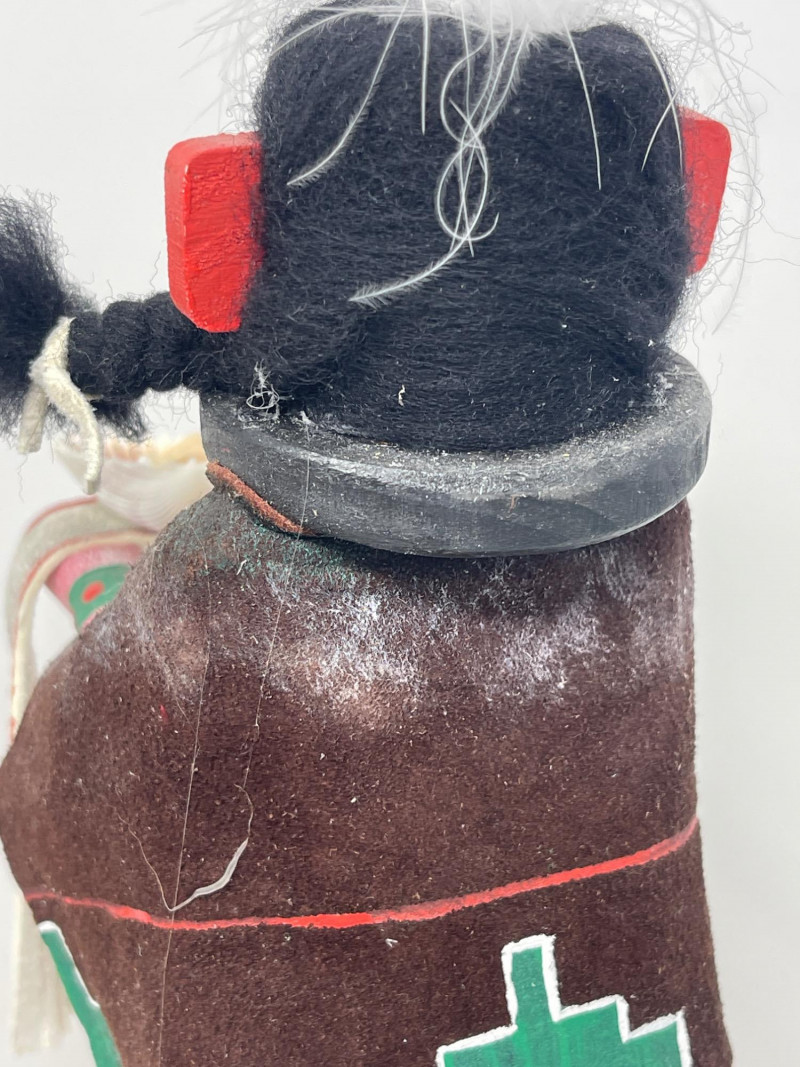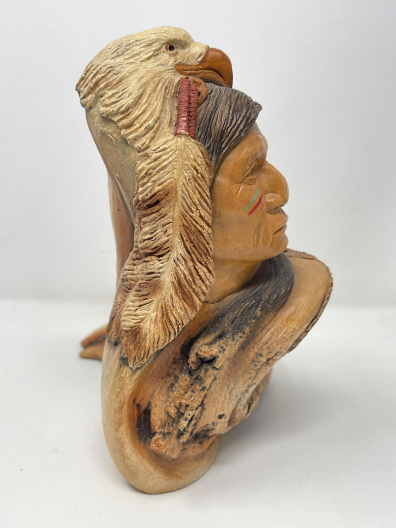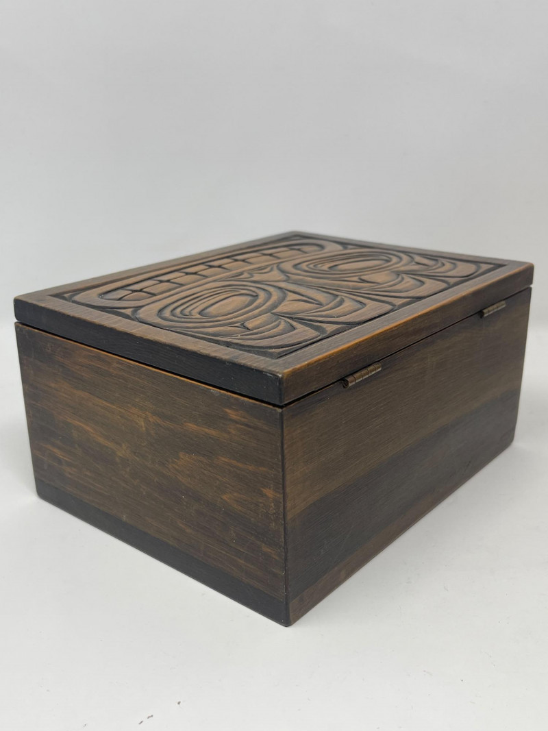 A compelling trio of Native-inspired art and collectibles, each piece reflecting cultural symbolism, craftsmanship, and storytelling: "Smiling Grandmother" Kachina Doll (12" H) – Signed by the artist, this Dine Navajo-style Kachina represents Mother Earth. Includes original tag and hand-painted details. Mill Creek Studios “Guardian” Sculpture – A driftwood-look bust by Stephen Herrero, limited edition #1702/4000, evoking ancestral protection and nature. Hand-Carved Bear Haida Style Bear Box – Wood box signed "Bear Haida, WK" with traditional Northwest Coast motif and felt-lined interior (7" x 5.5" x 3.5"). Each piece offers a unique representation of Indigenous storytelling and spirit.