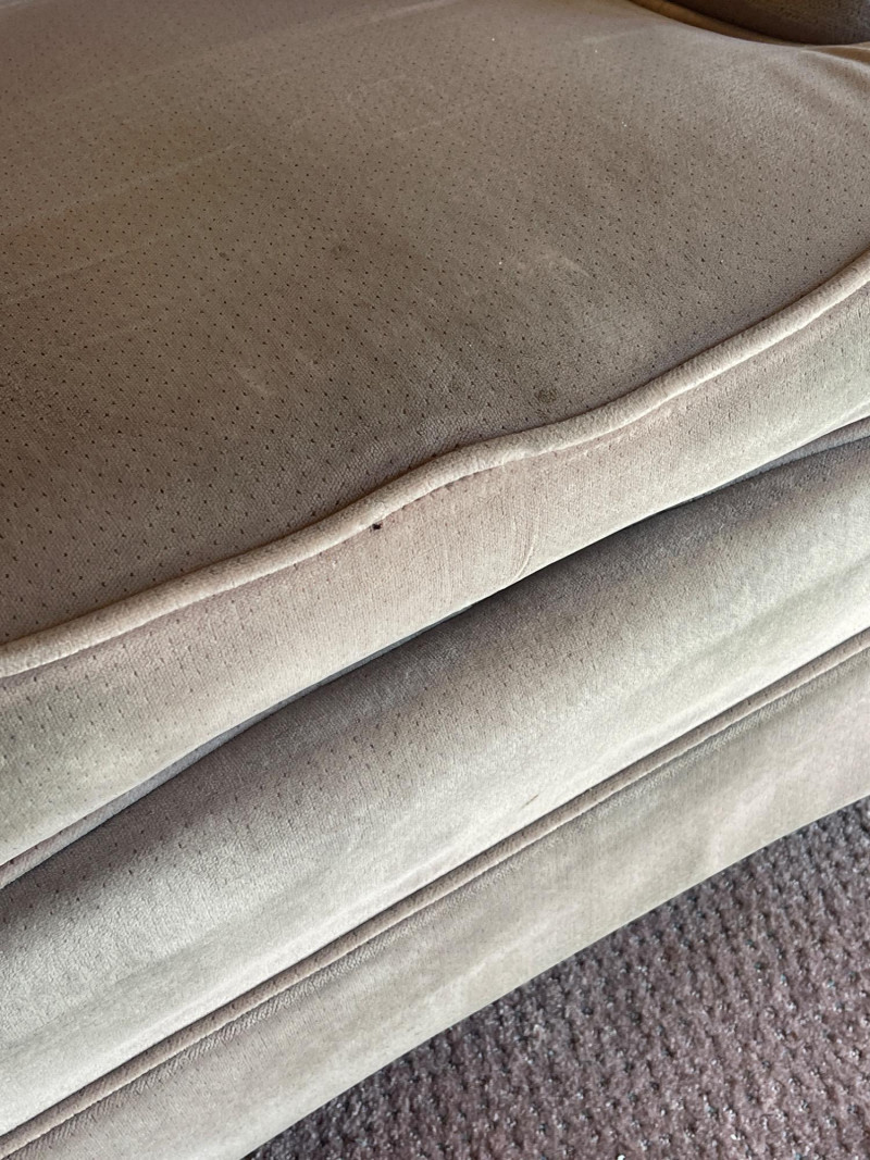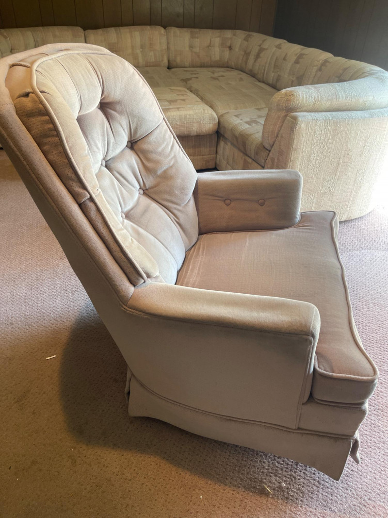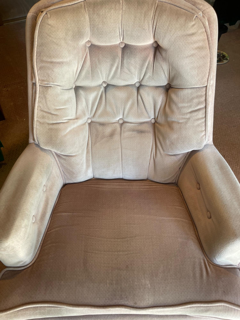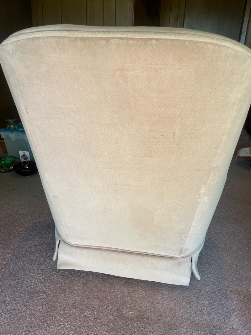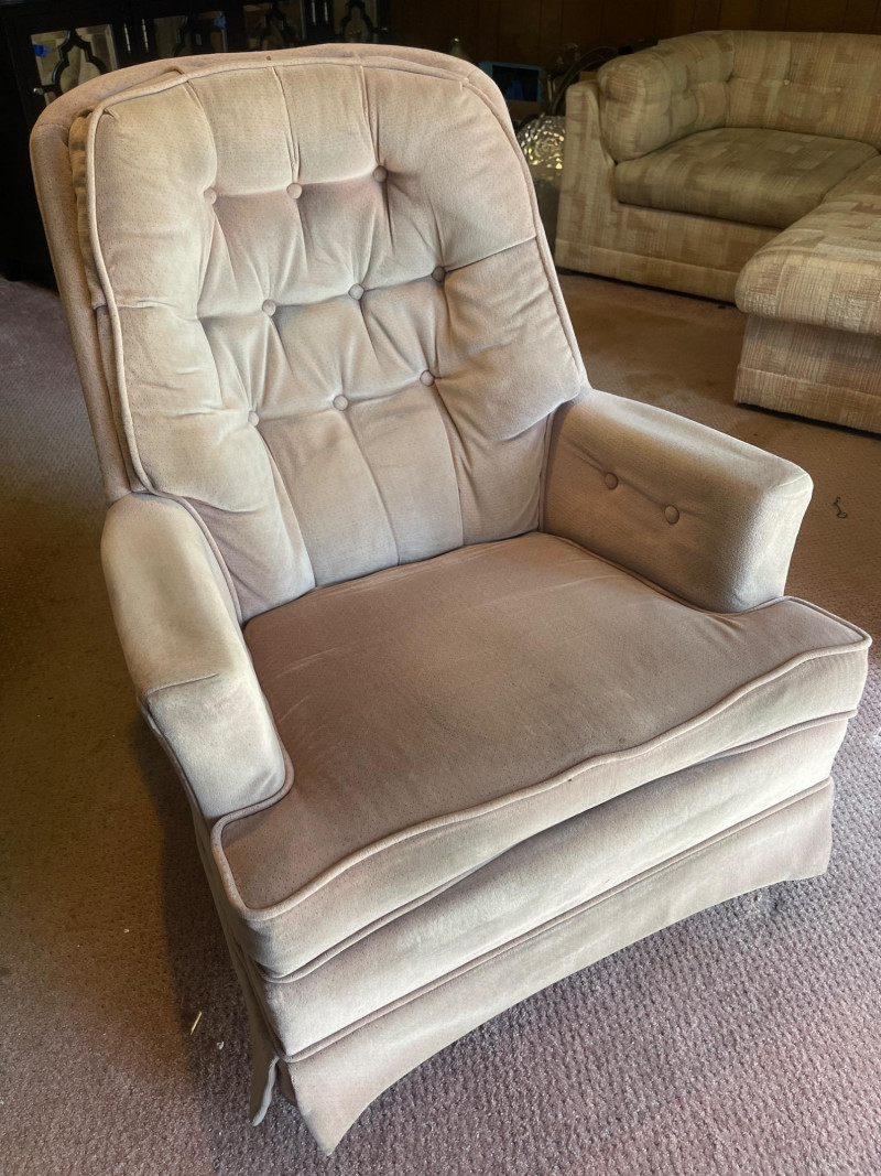 Vintage Velvet Swivel Armchair – Tufted Back, Well-Worn Character Add a touch of vintage charm and comfort to your space with this classic velvet swivel chair. Featuring a high tufted back, padded arms, and a soft, rounded silhouette, it’s a piece built for cozy lounging with retro flair. Dimensions: 30” W x 28” D x 36” H Details: Swivel base for easy movement Tufted backrest with classic mid-century styling Velvety upholstery in a soft beige/taupe tone Cushioned arms and seat for added comfort Condition: Perfect for: