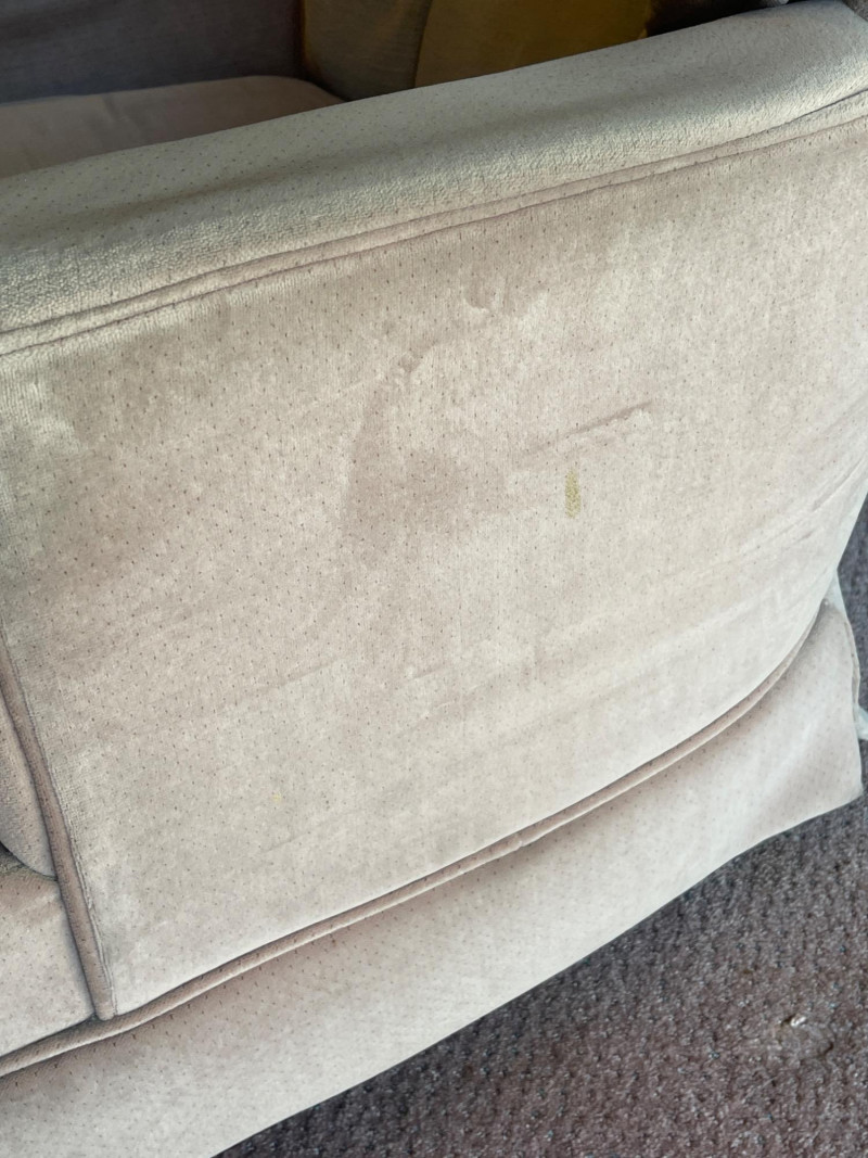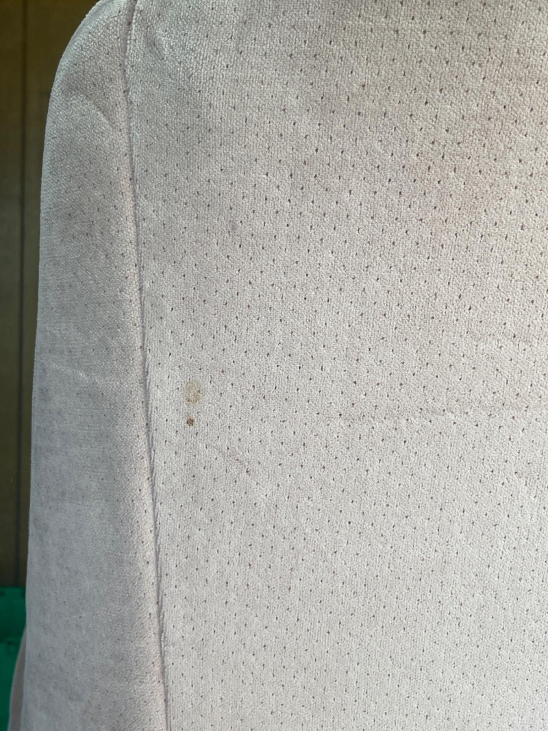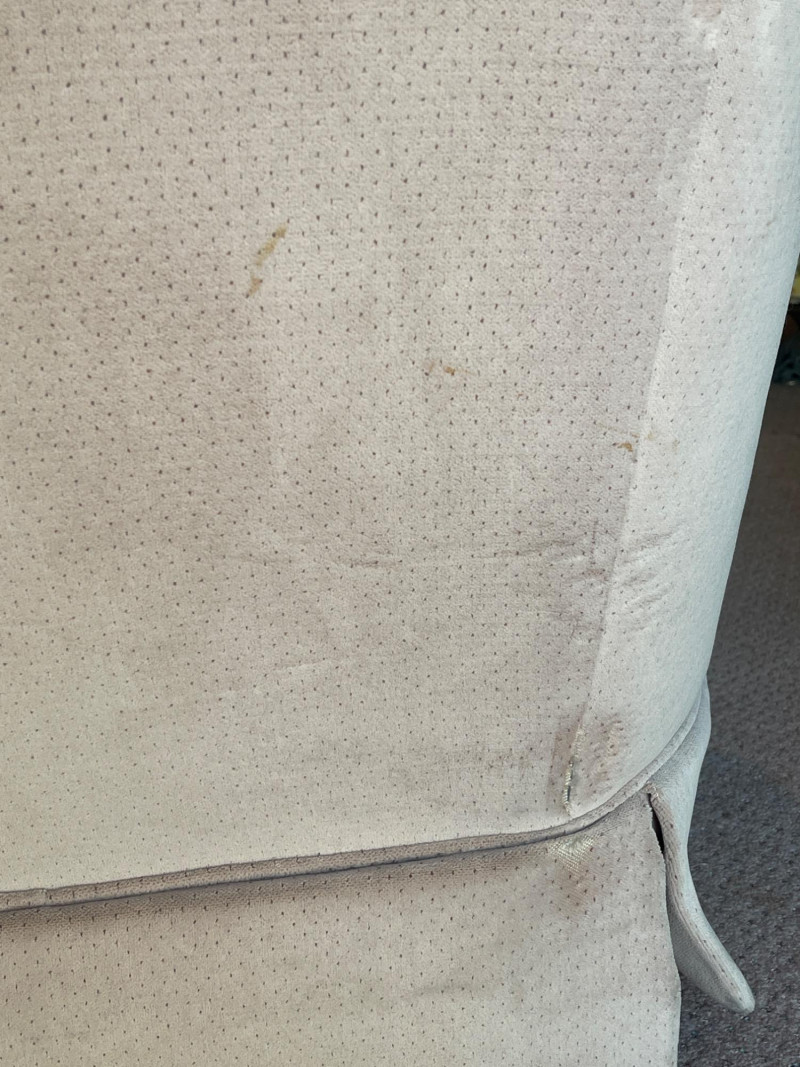 This chair shows significant wear, with multiple visible stains and signs of long-term use. Best suited for restoration, reupholstery, or use in a casual/creative space where comfort takes priority over condition.