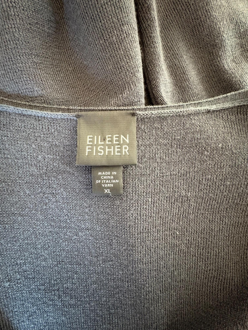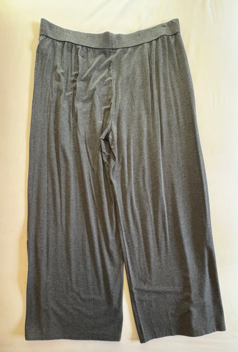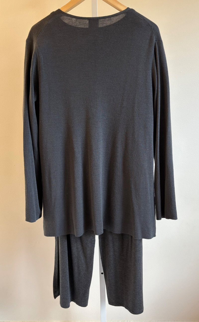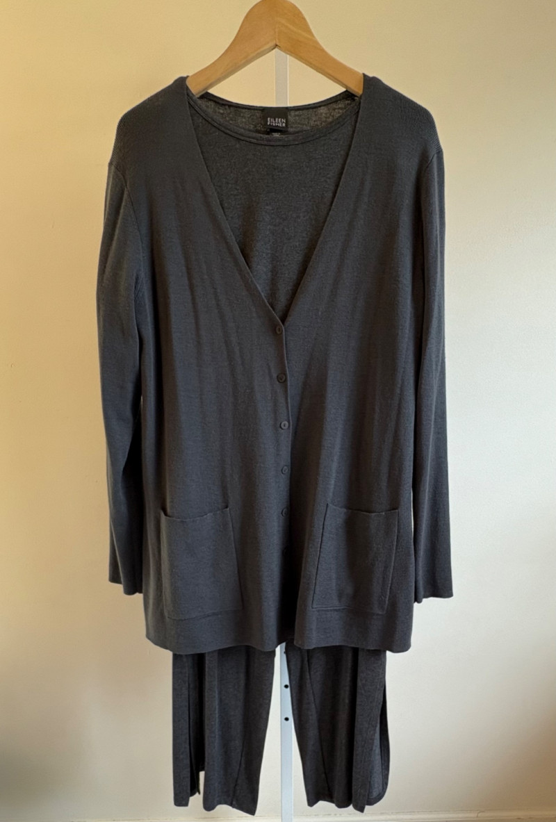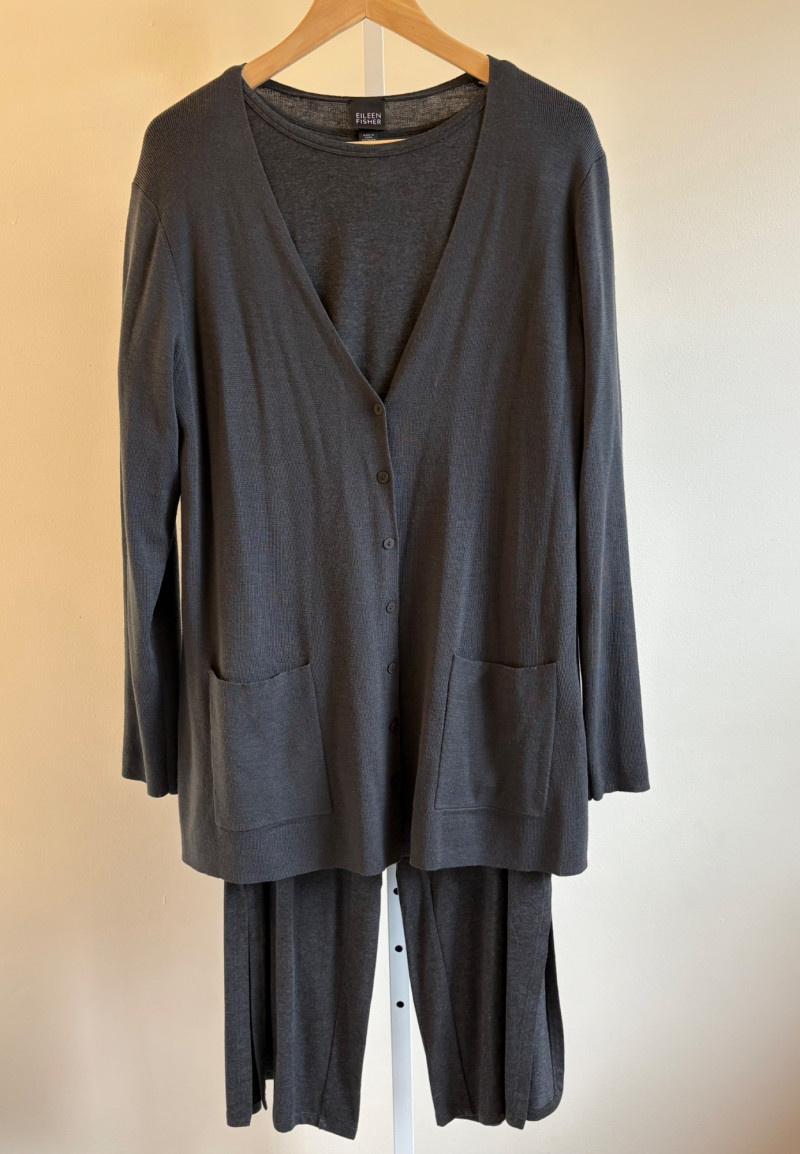 Wonderful, deep gray three-piece set consisting of pants, t-shirt, and cardigan from Eileen Fisher. Collarless cardigan has button front closure and front patch pockets in a smooth flat weave. In excellent condition. 100% merino wool. Measures 22.5" pit to pit and 28" from back neckline to bottom back hemline. Size tag says XL. Matching t-shirt has scoop neck with band. In excellent condition. 95% Tencel with 5% Elastane. Measures 27” pit to pit and 25.5" from back neckline to bottom back hemline. Size tag says 1X. Wide-leg pants have flat elasticated waistband. In excellent condition. 95% Tencel with 5% Elastane. Measures 19" side to side at waist with 28" inseam. Size tag says XL
