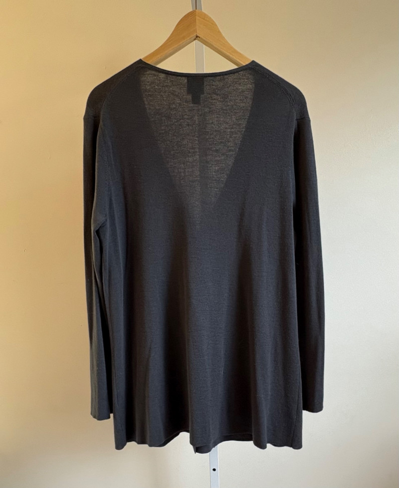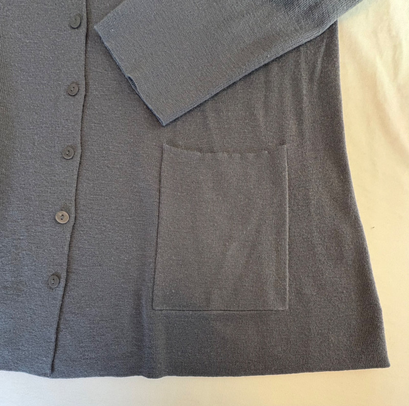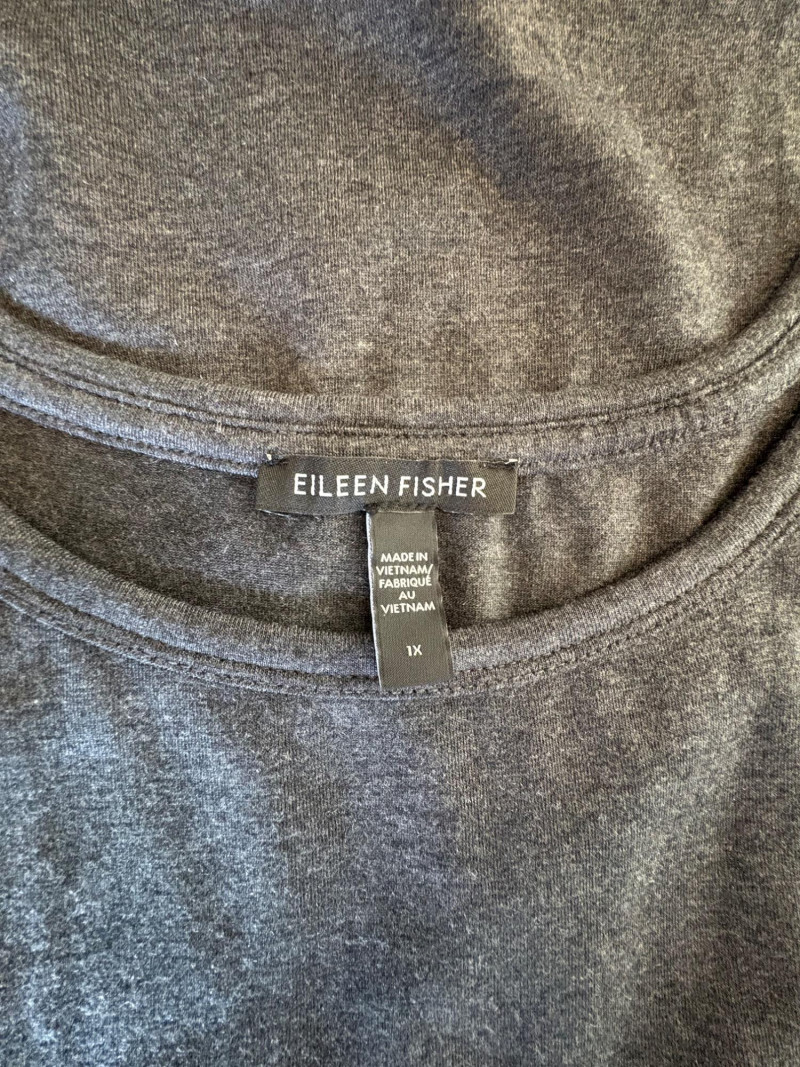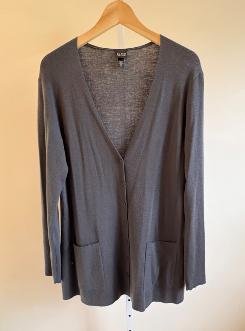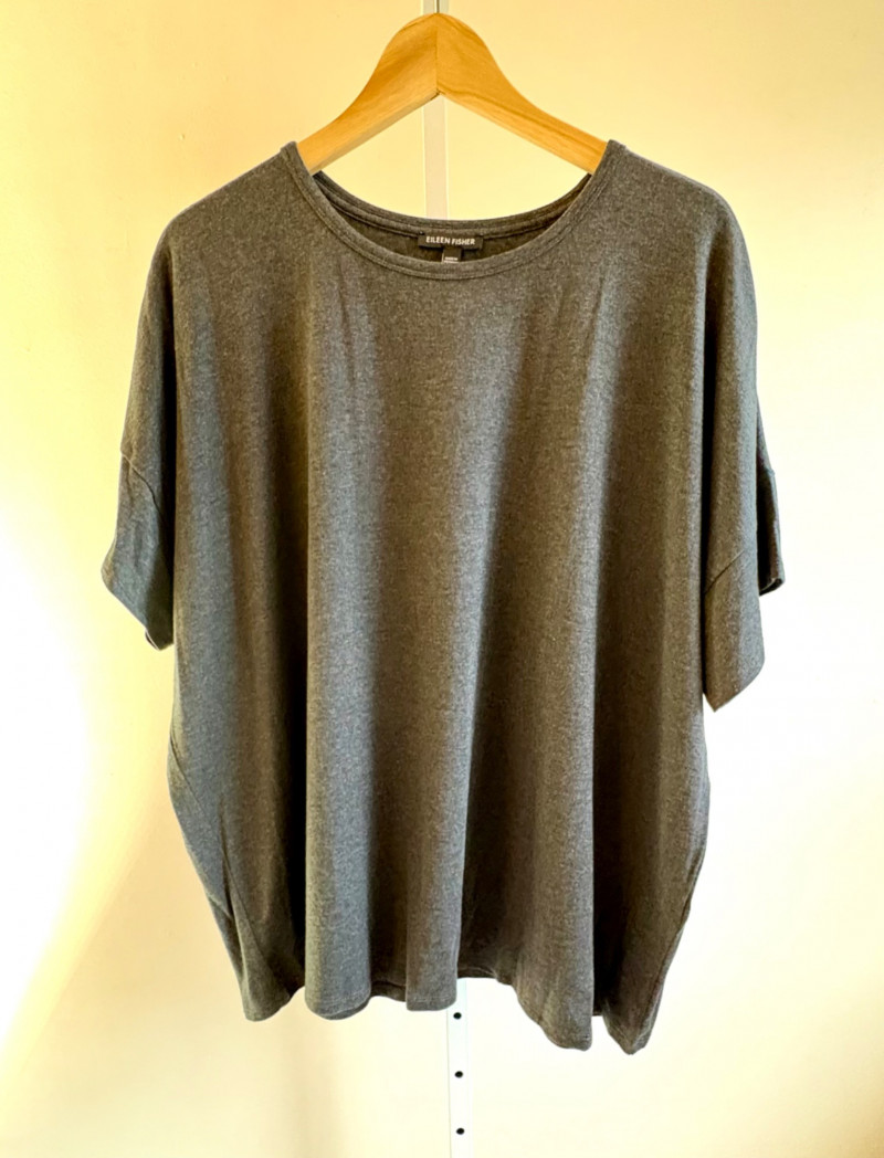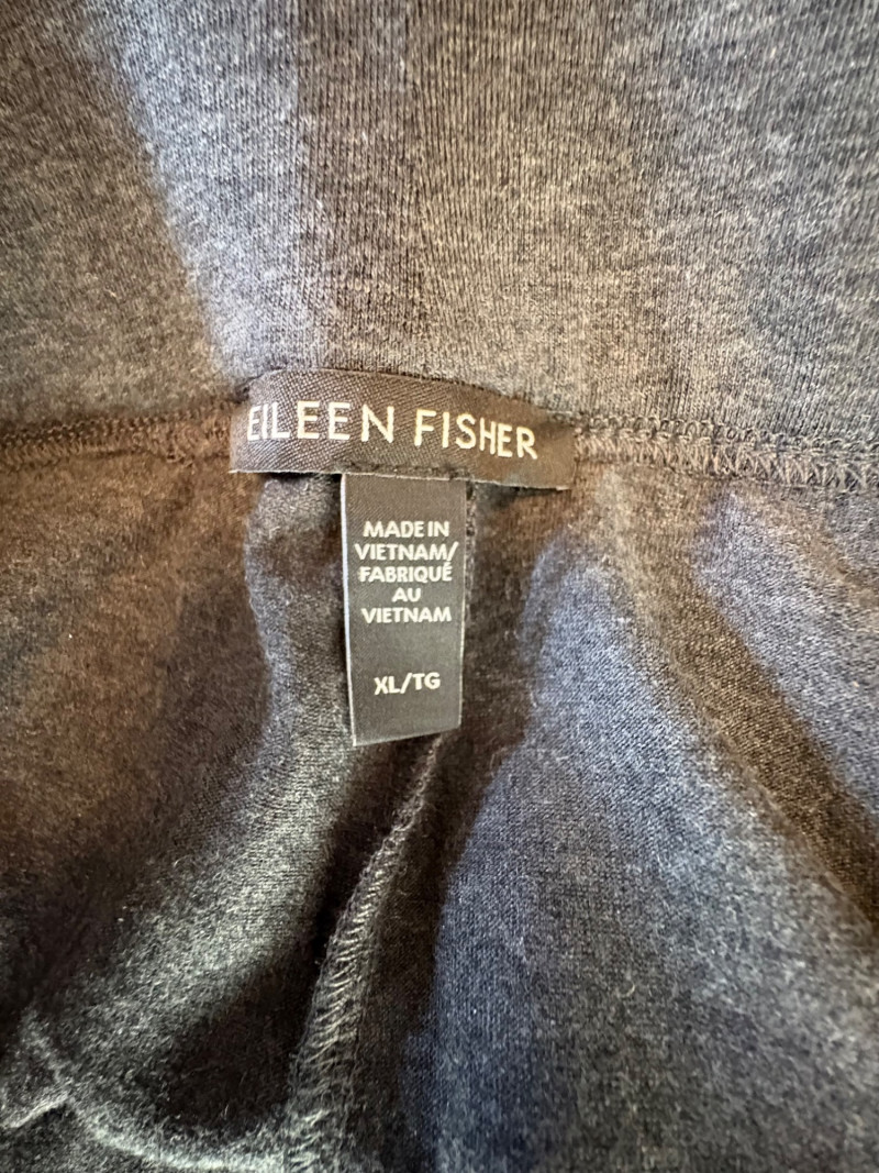 Wonderful, deep gray three-piece set consisting of pants, t-shirt, and cardigan from Eileen Fisher. Collarless cardigan has button front closure and front patch pockets in a smooth flat weave. In excellent condition. 100% merino wool. Measures 22.5" pit to pit and 28" from back neckline to bottom back hemline. Size tag says XL. Matching t-shirt has scoop neck with band. In excellent condition. 95% Tencel with 5% Elastane. Measures 27” pit to pit and 25.5" from back neckline to bottom back hemline. Size tag says 1X. Wide-leg pants have flat elasticated waistband. In excellent condition. 95% Tencel with 5% Elastane. Measures 19" side to side at waist with 28" inseam. Size tag says XL