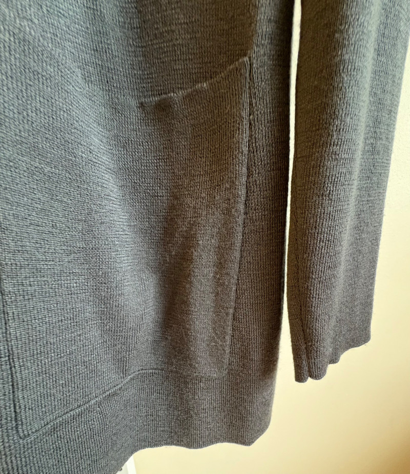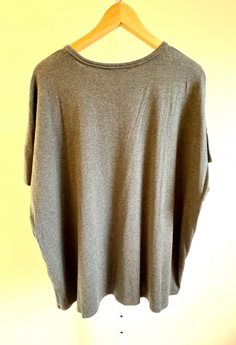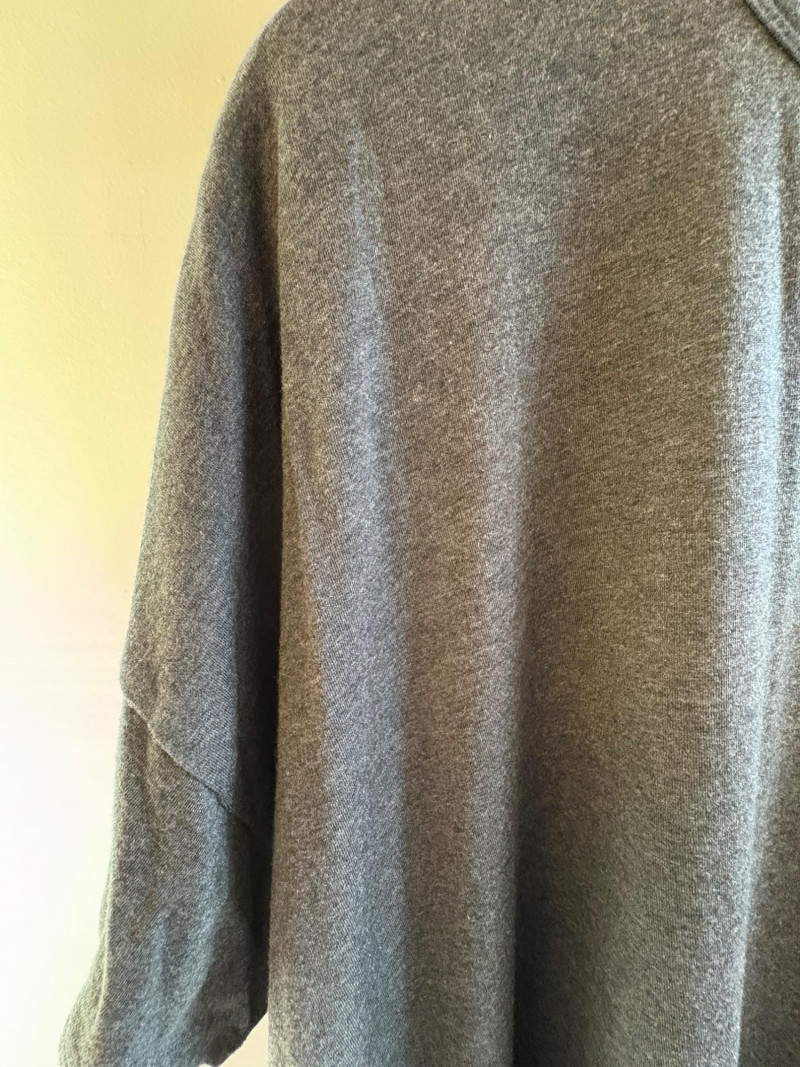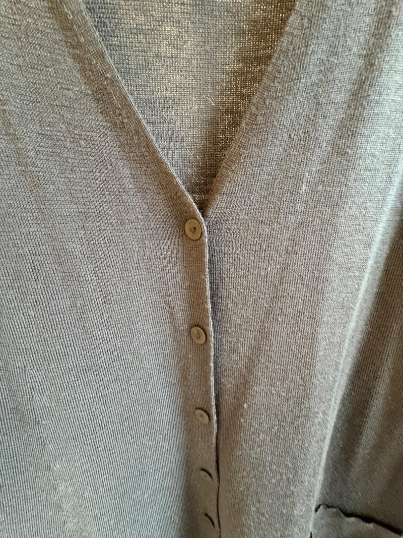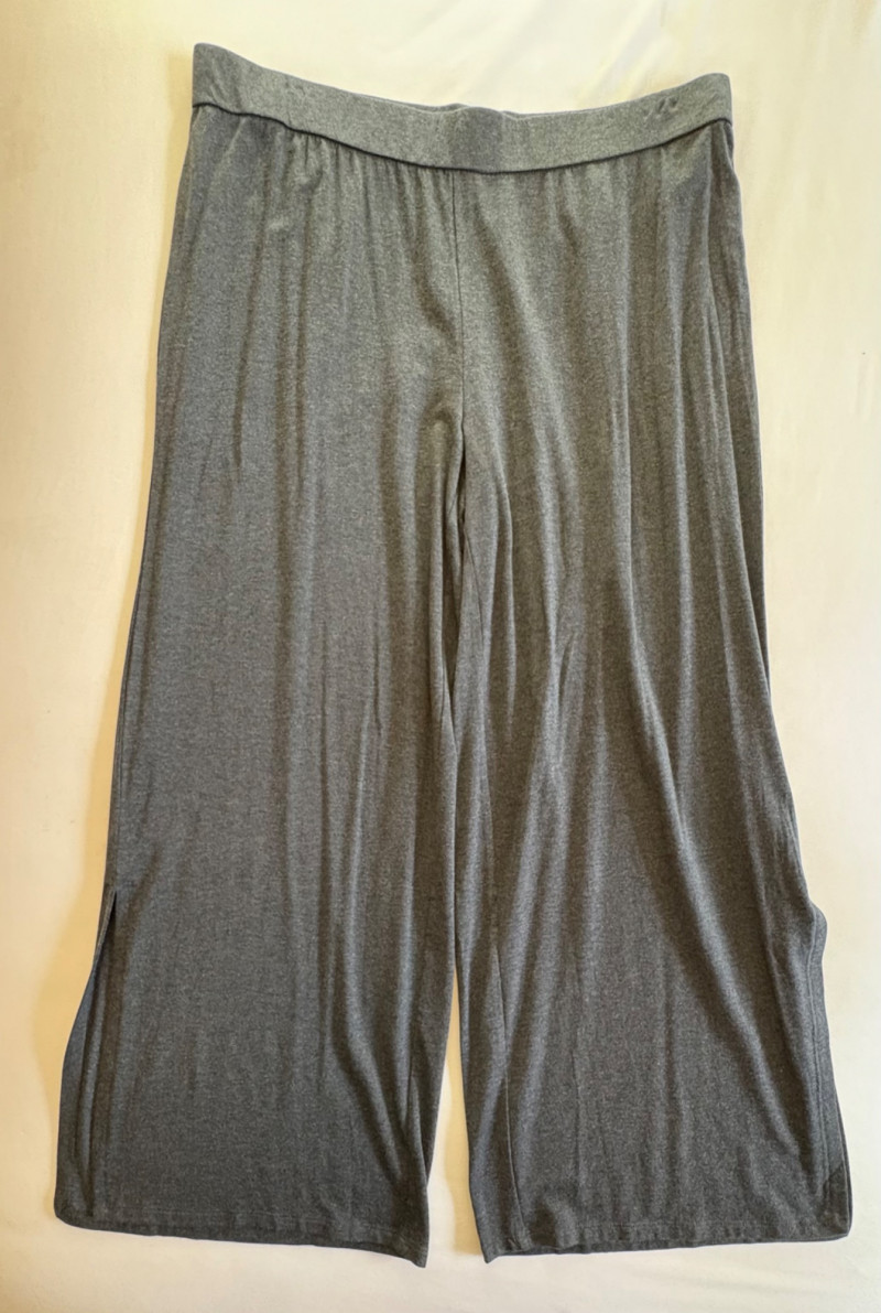 Wonderful, deep gray three-piece set consisting of pants, t-shirt, and cardigan from Eileen Fisher. Collarless cardigan has button front closure and front patch pockets in a smooth flat weave. In excellent condition. 100% merino wool. Measures 22.5" pit to pit and 28" from back neckline to bottom back hemline. Size tag says XL. Matching t-shirt has scoop neck with band. In excellent condition. 95% Tencel with 5% Elastane. Measures 27” pit to pit and 25.5" from back neckline to bottom back hemline. Size tag says 1X. Wide-leg pants have flat elasticated waistband. In excellent condition. 95% Tencel with 5% Elastane. Measures 19" side to side at waist with 28" inseam. Size tag says XL
