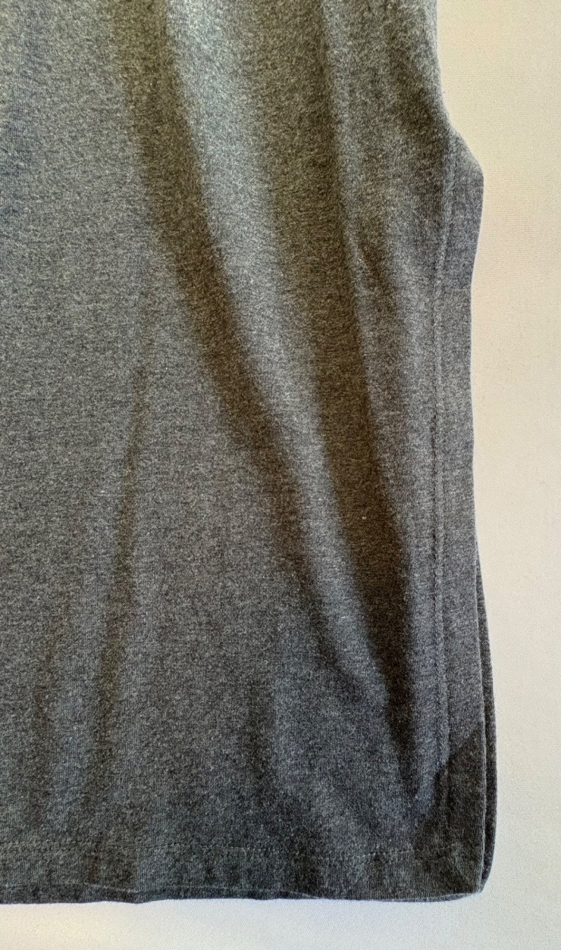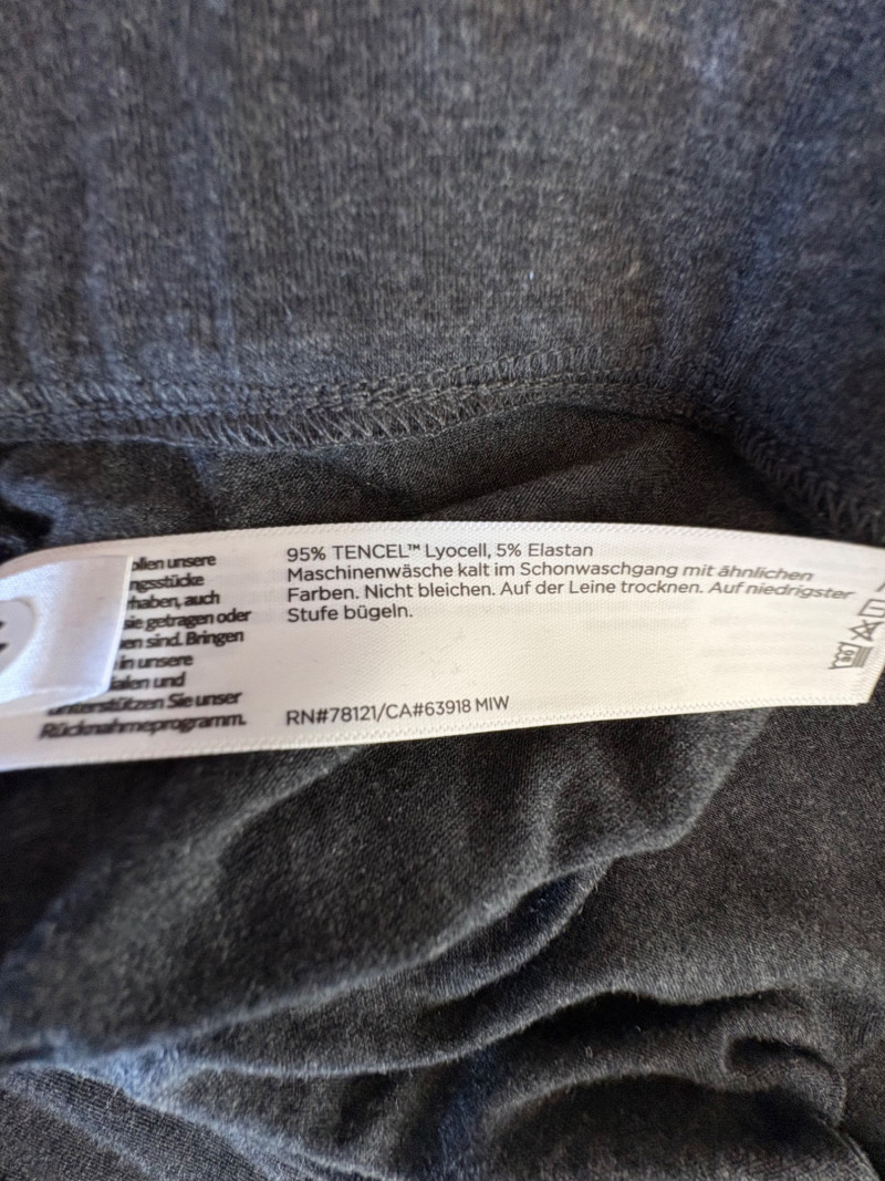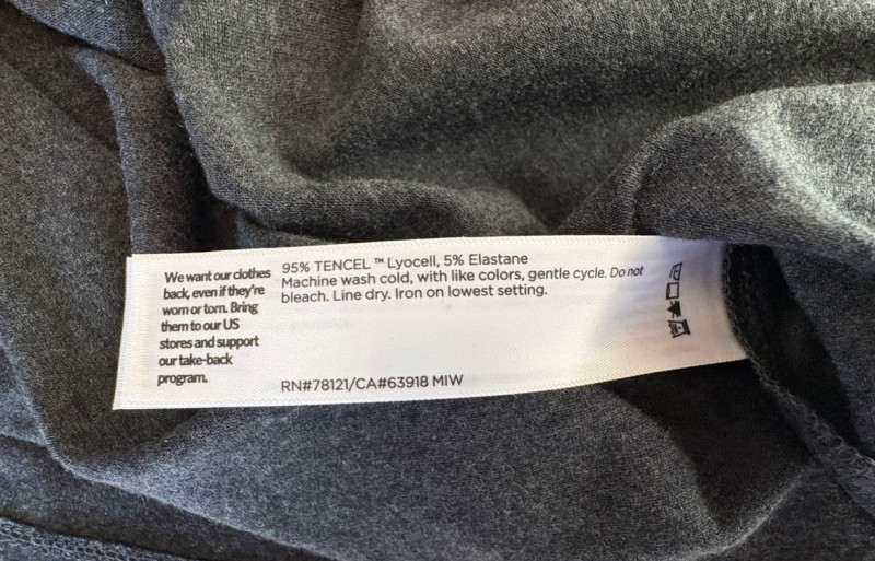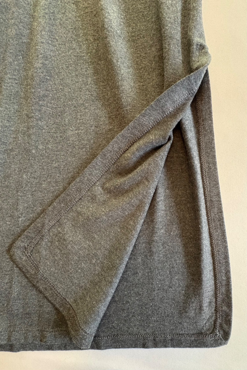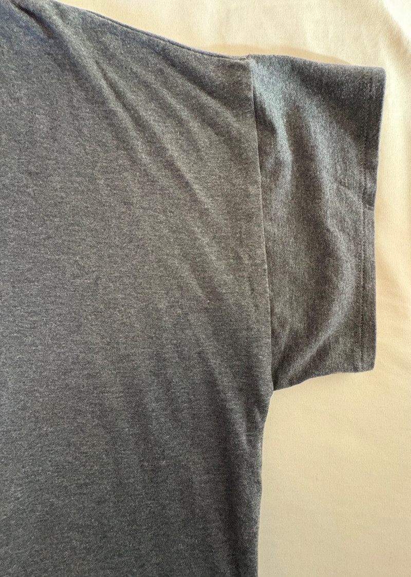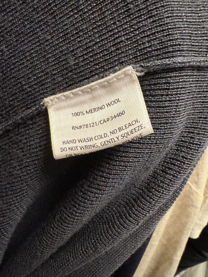 Wonderful, deep gray three-piece set consisting of pants, t-shirt, and cardigan from Eileen Fisher. Collarless cardigan has button front closure and front patch pockets in a smooth flat weave. In excellent condition. 100% merino wool. Measures 22.5" pit to pit and 28" from back neckline to bottom back hemline. Size tag says XL. Matching t-shirt has scoop neck with band. In excellent condition. 95% Tencel with 5% Elastane. Measures 27” pit to pit and 25.5" from back neckline to bottom back hemline. Size tag says 1X. Wide-leg pants have flat elasticated waistband. In excellent condition. 95% Tencel with 5% Elastane. Measures 19" side to side at waist with 28" inseam. Size tag says XL