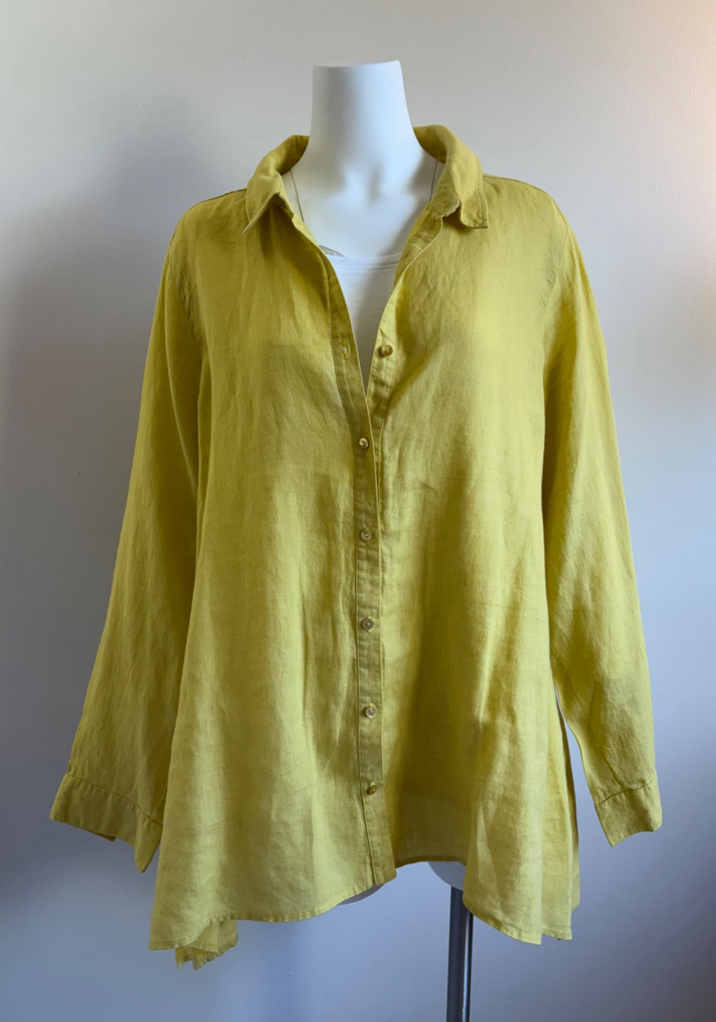 Linen separates from Eileen Fisher. Both 100% linen. Bright acid yellow A-line overshirt with button front closure, button close cuffs, back yoke, and split hem. In excellent condition. Measures 25.5" to pit and 30" from center back neck seam to back hemline. Size tag says XL. White tank has narrow ribbing around neckline and armholes. In excellent condition. Measures 23" pit to pit and 24" from back neckline to bottom back hem. Size tag says 1X.