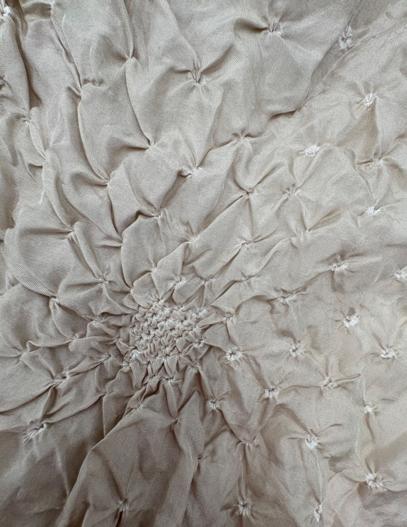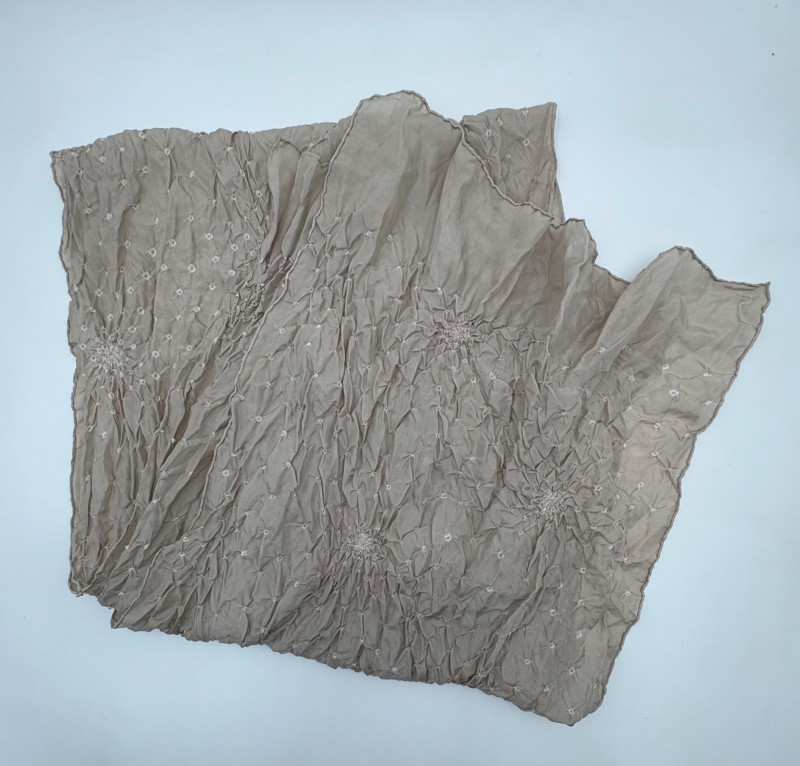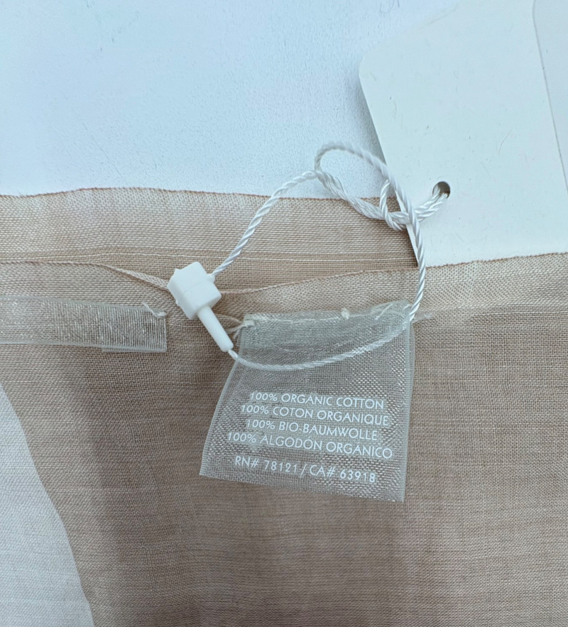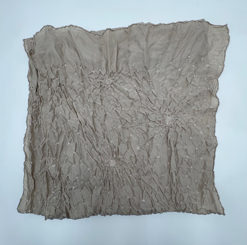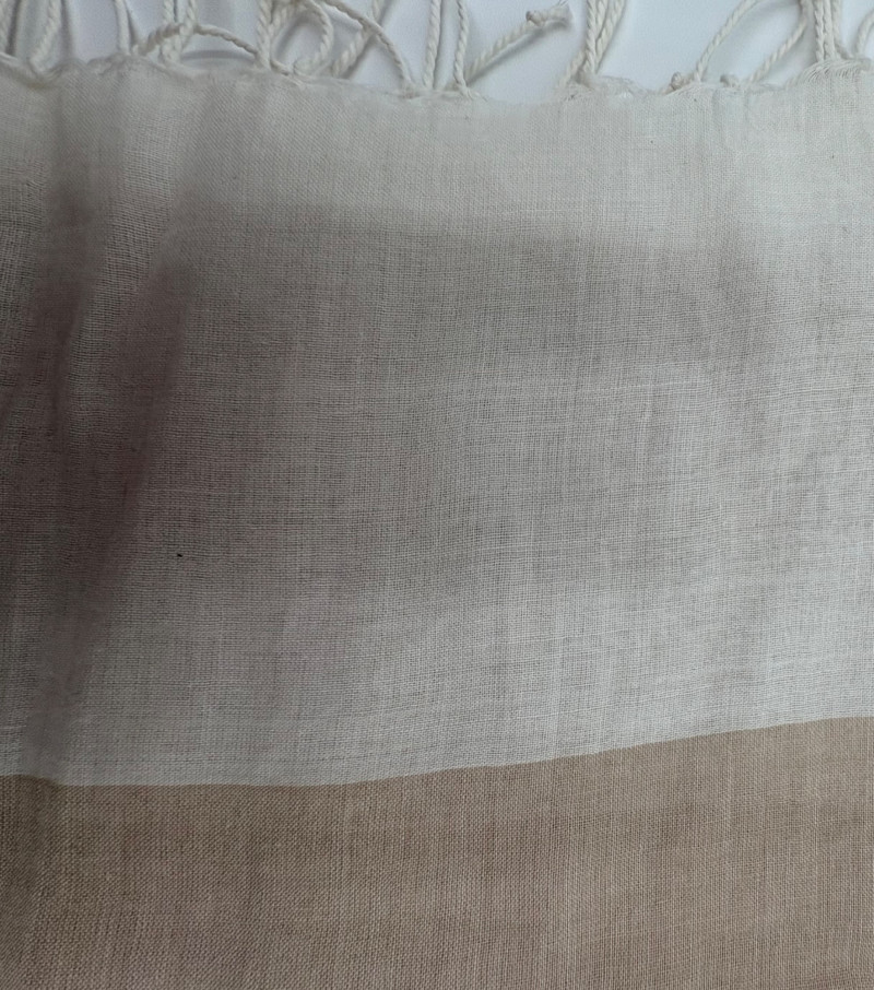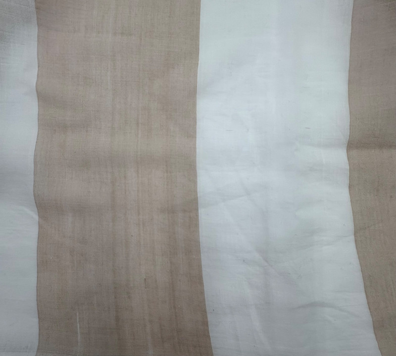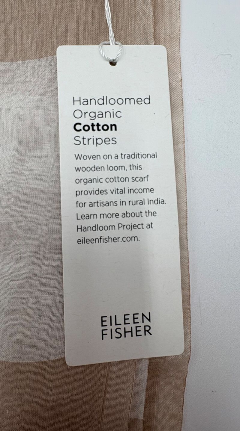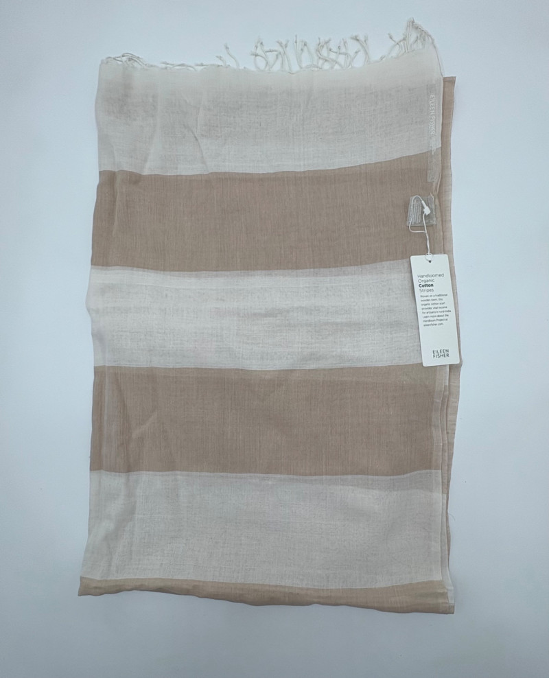Pair of neutral scarves from Eileen Fisher. Pale beige and light ivory striped scarf with twisted short end fringe. Central block of beige has wide ivory & beige stripes on either side. New with tag. 100% organic cotton. Measures approx. 27" x 82". Neutral beige scarf with a tucked stitch pattern. In excellent condition. No maker or fabric tag, but we believe it is partially or wholly silk by the feel. Measures approx. 18" x 72".