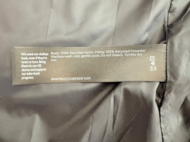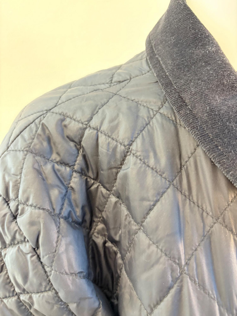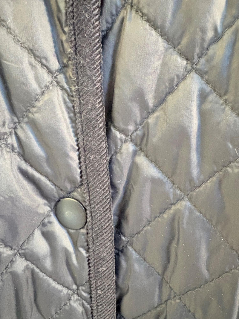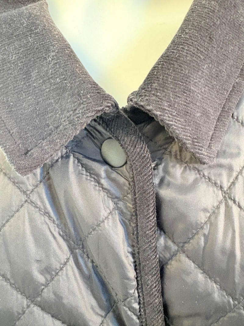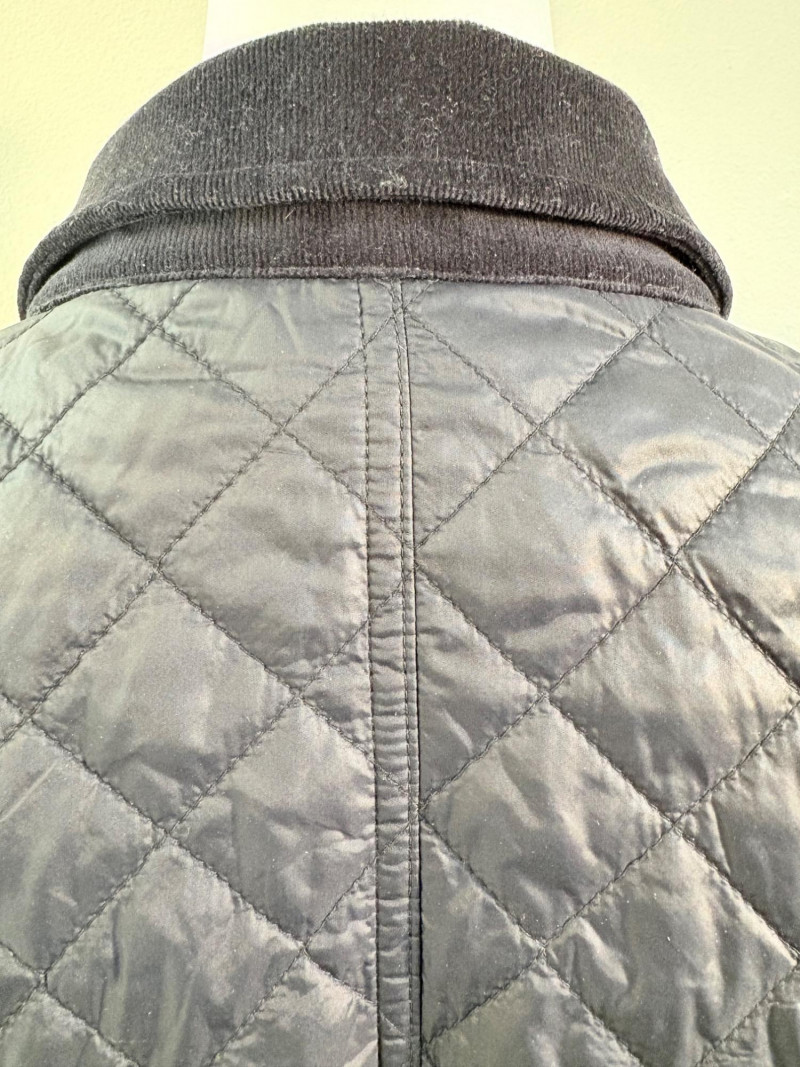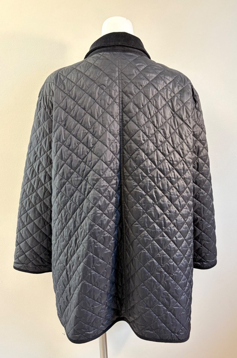 Traditionally-styled black car coat from Eileen Fisher has diamond quilting with black corduroy collar/trim/pocket welts. Snap front closure with welted front pockets. In excellent condition. 100% recycled nylon. Measures 24" pit to pit and 31" from back neck seam to back hemline. Size tag says XL.
